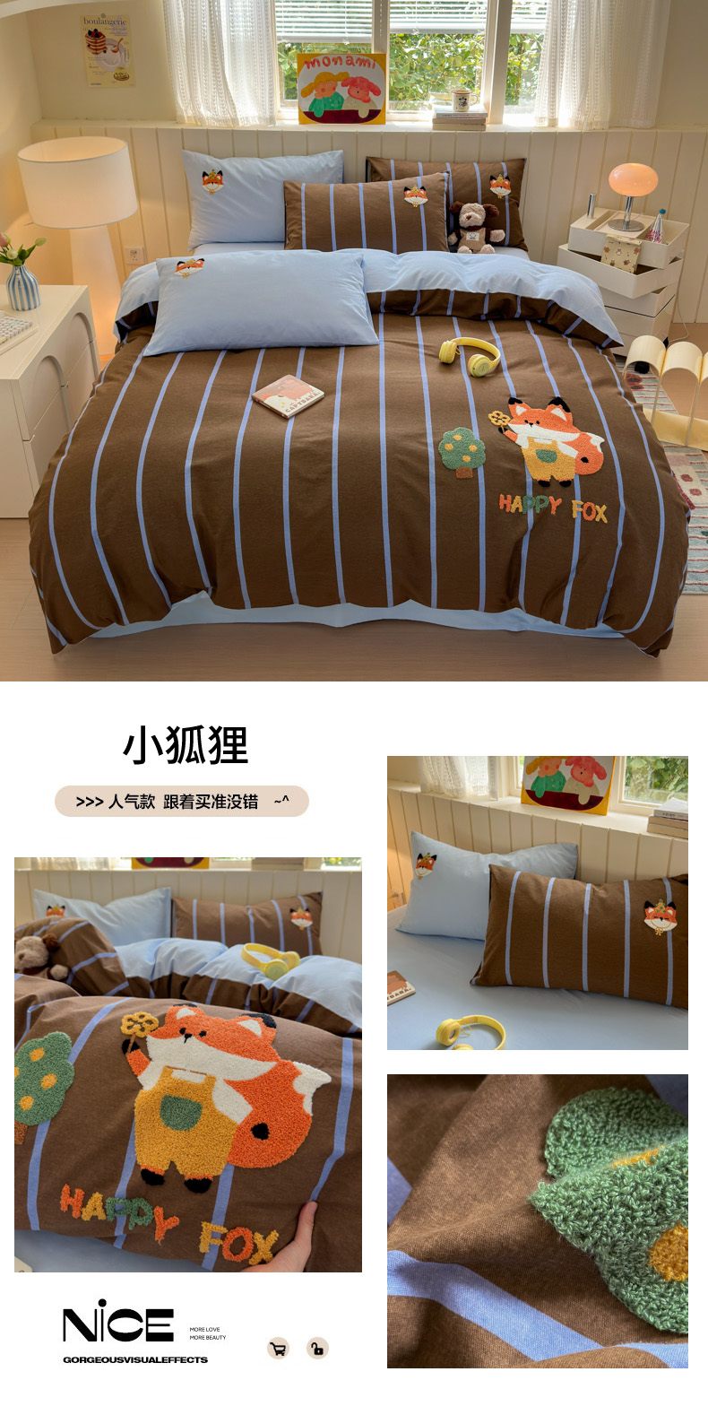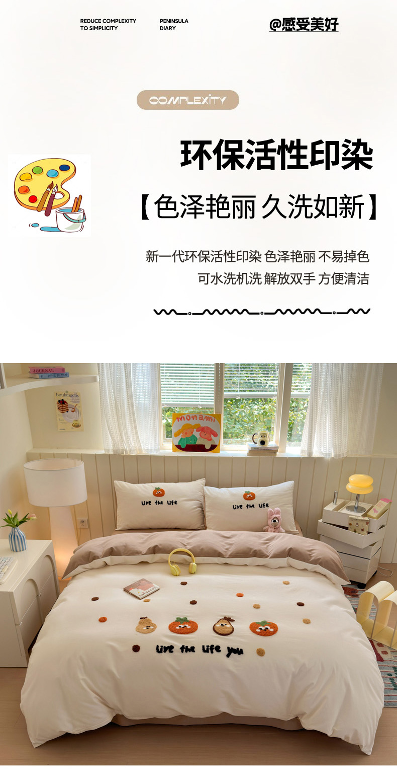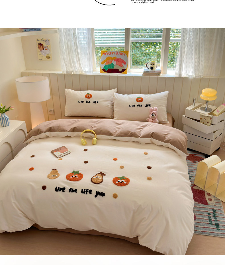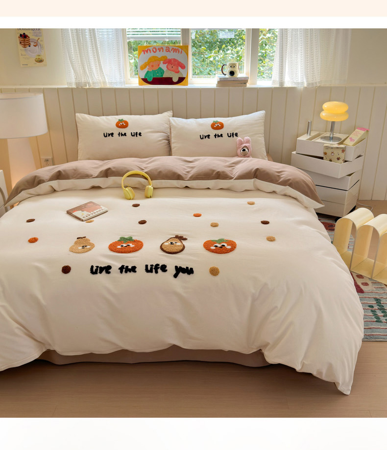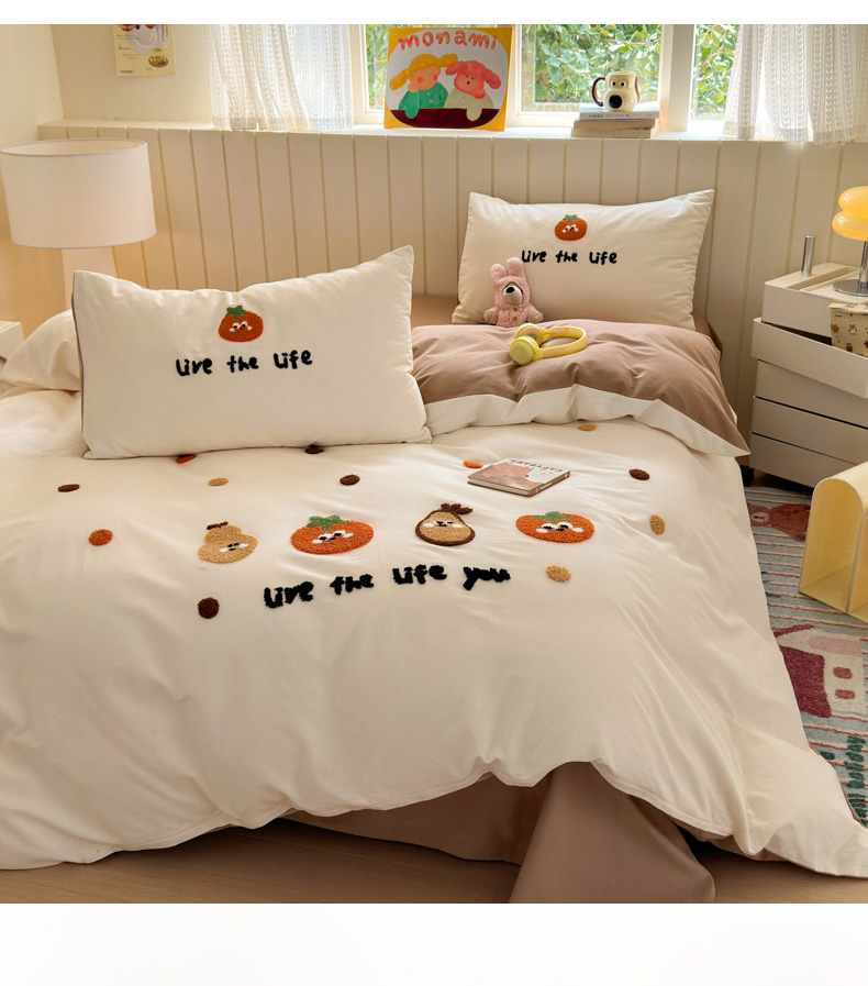 当前位置: 91家纺网 > 商品网购 > 床品套件 > 四件套 > 毛巾绣四件套 > 如意朵 2025新款全棉磨毛卡通毛巾绣四件套(专版花型)-场景二 好柿发生
