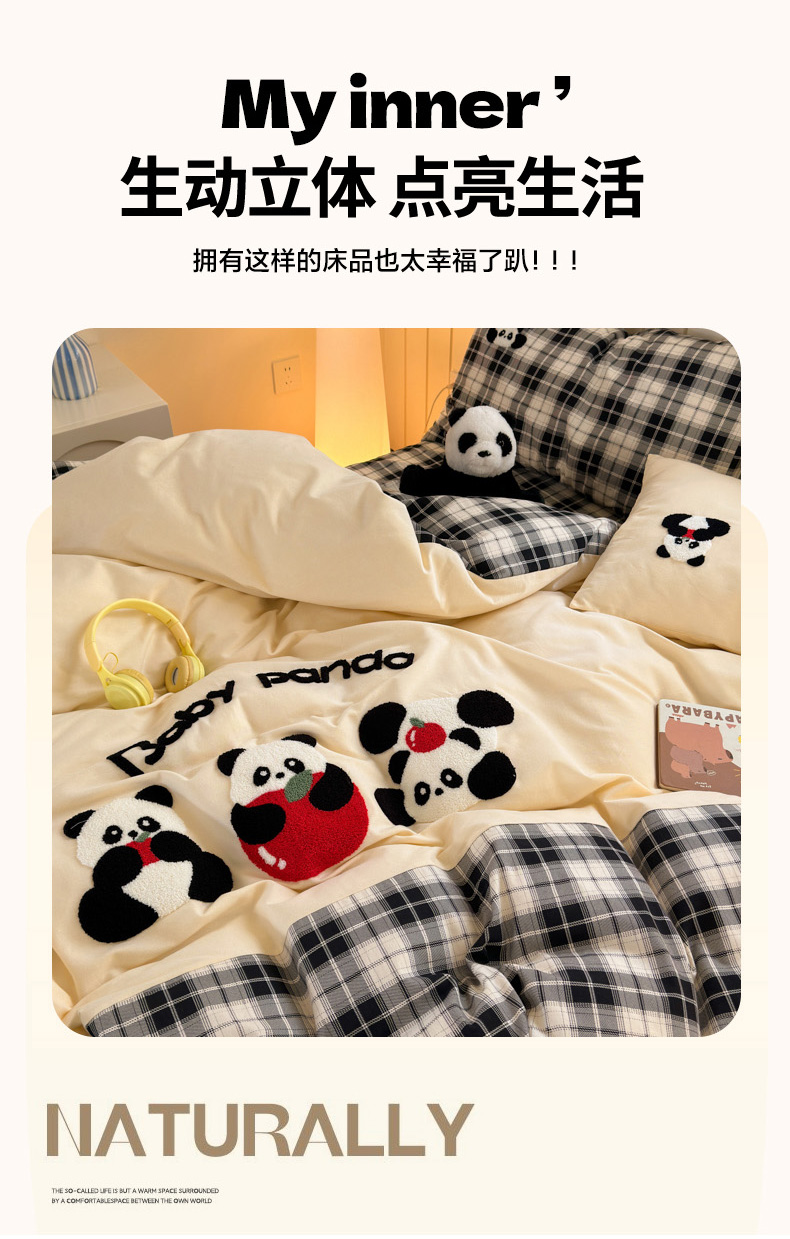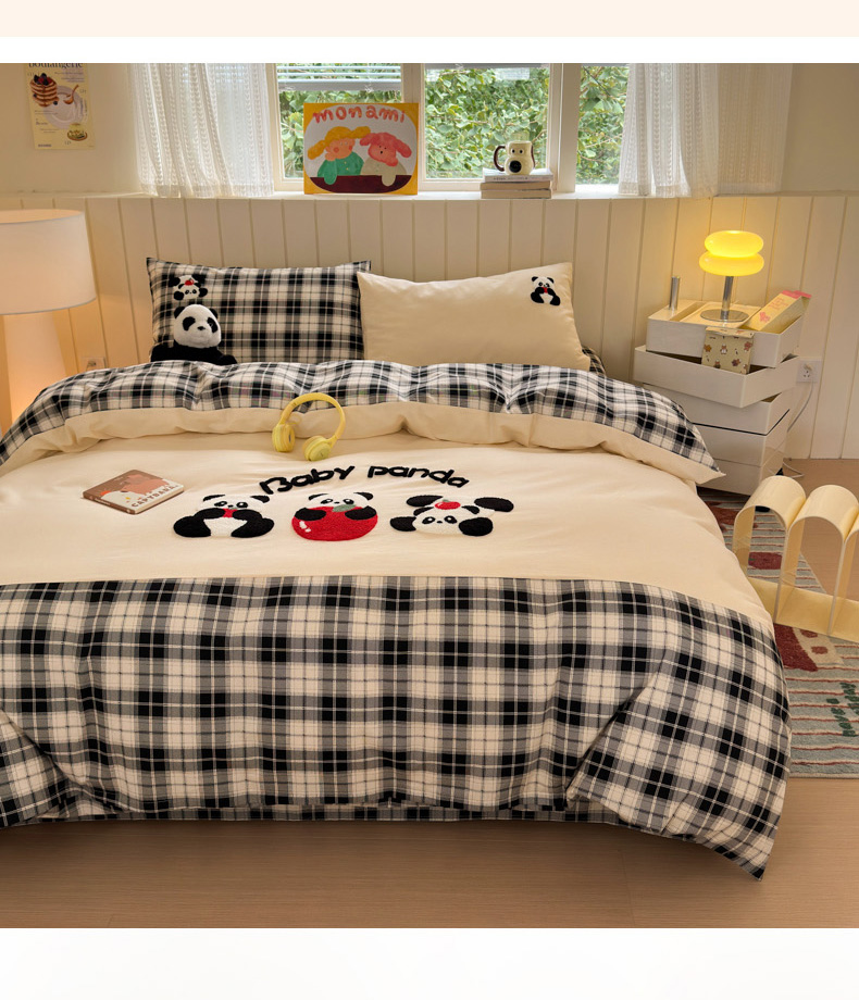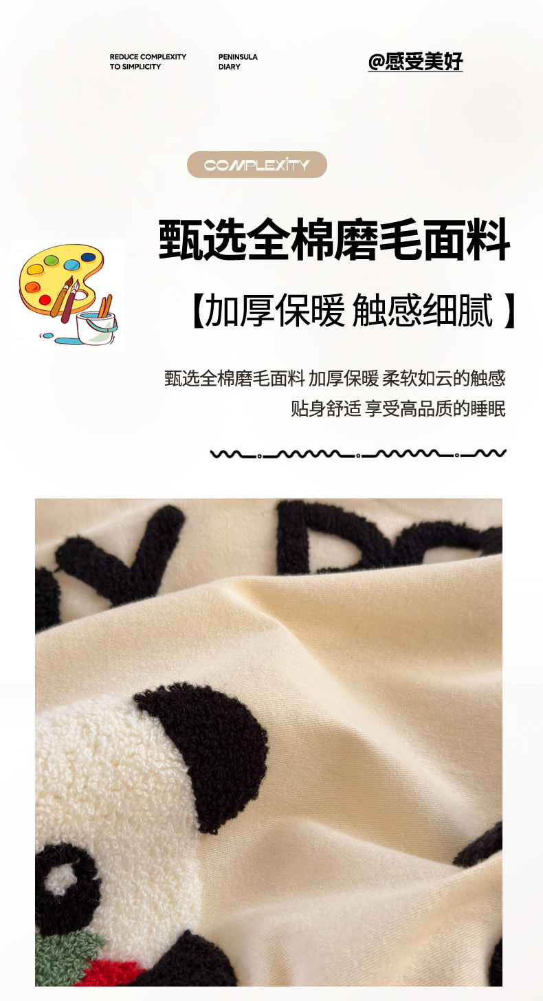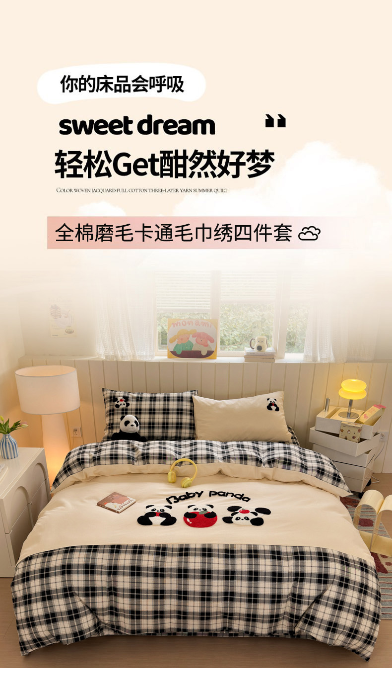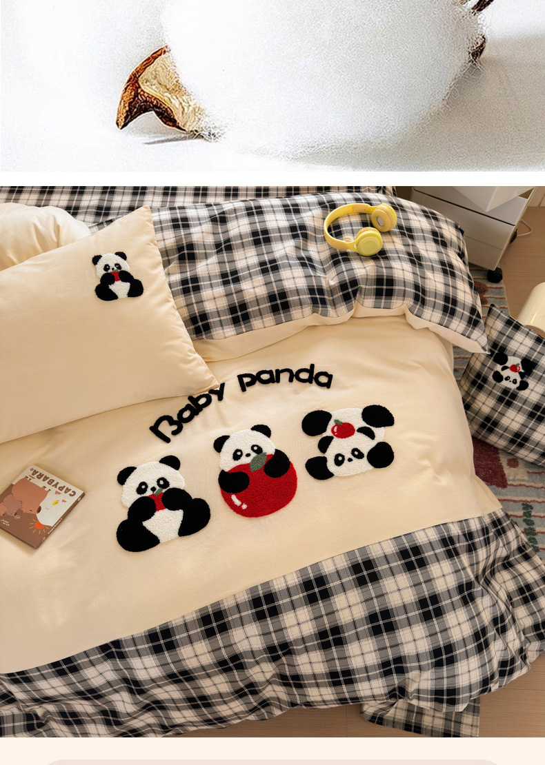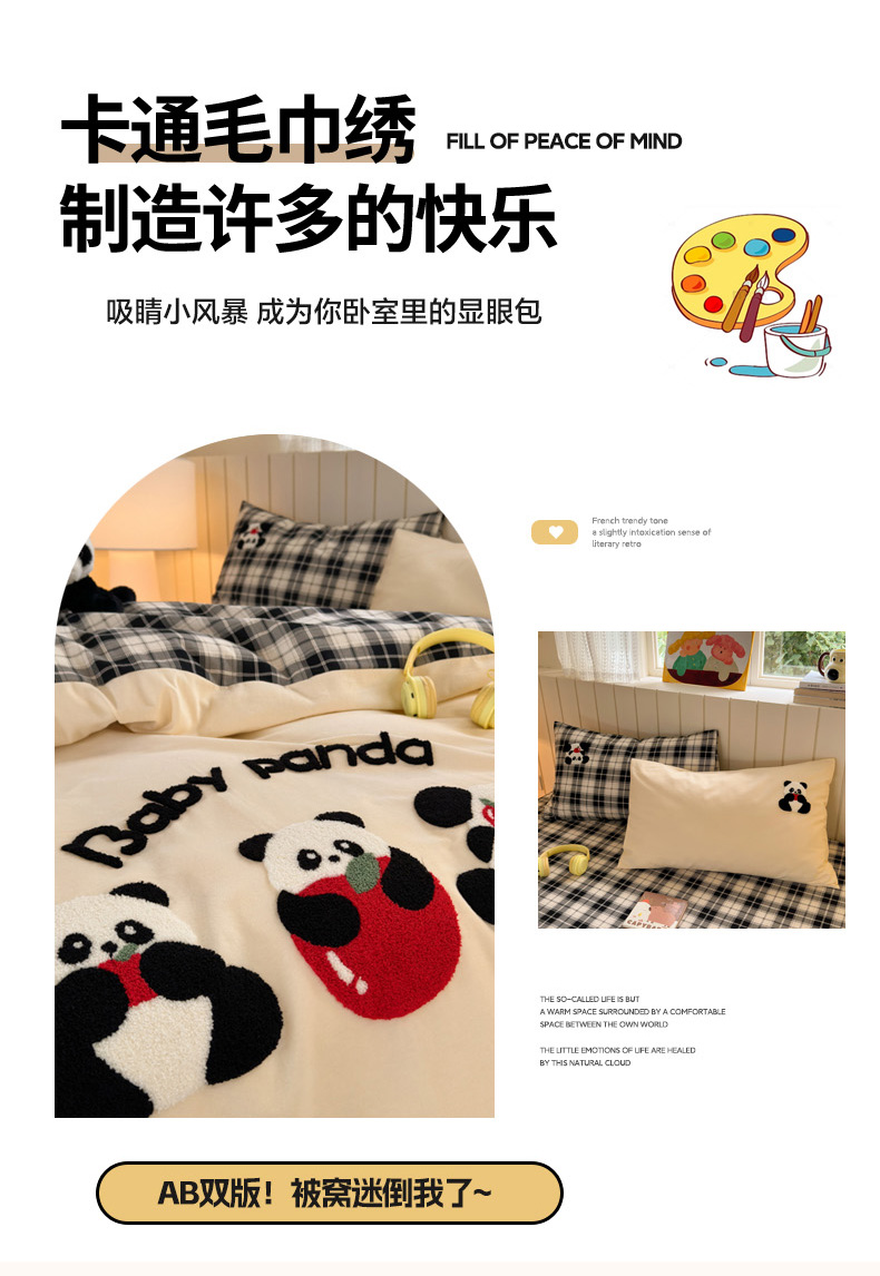 当前位置: 91家纺网 > 商品网购 > 床品套件 > 四件套 > 毛巾绣四件套 > 如意朵 2025新款全棉磨毛卡通毛巾绣四件套(专版花型)-场景二 苹果熊猫
