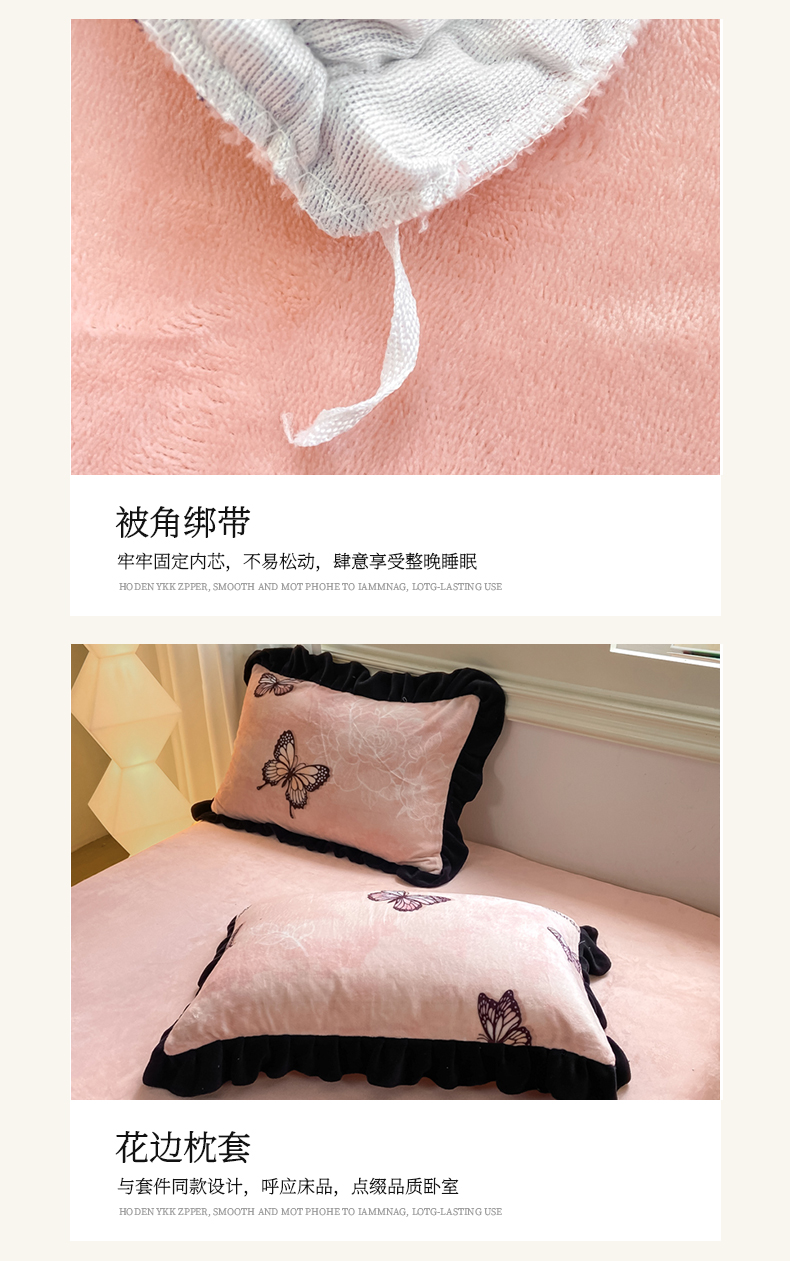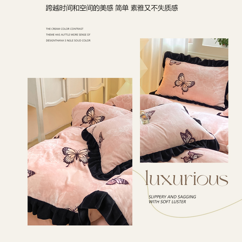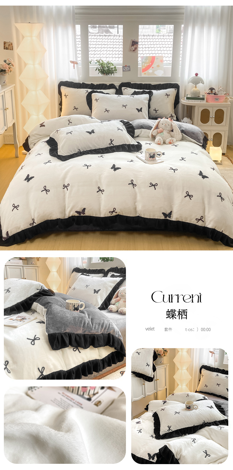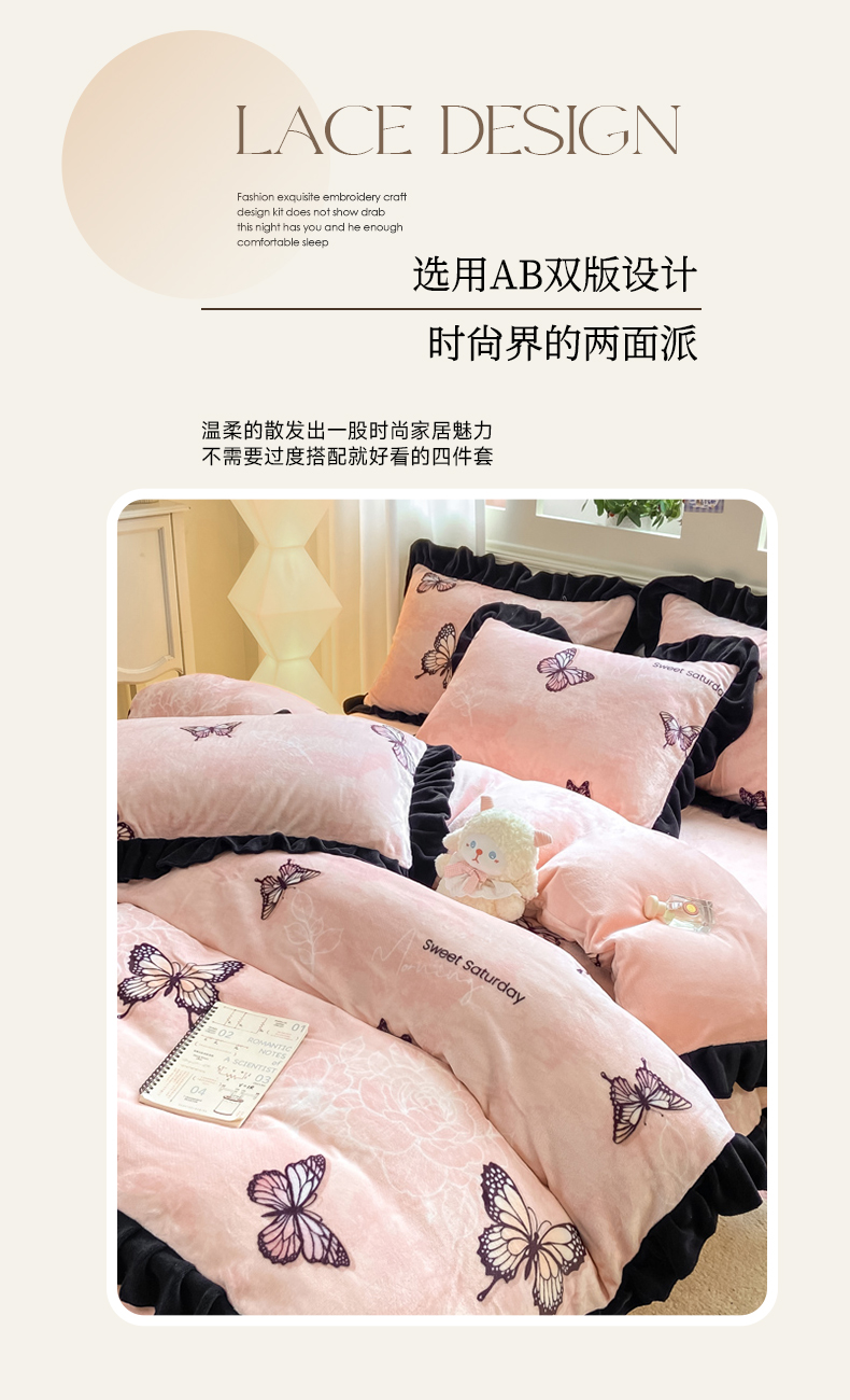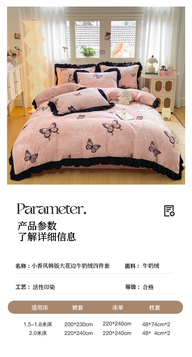 商品名称:富之航家纺 2025新款小香风赫本风ins风大牌韩版大花边轻奢牛奶绒四件套 蝶恋花