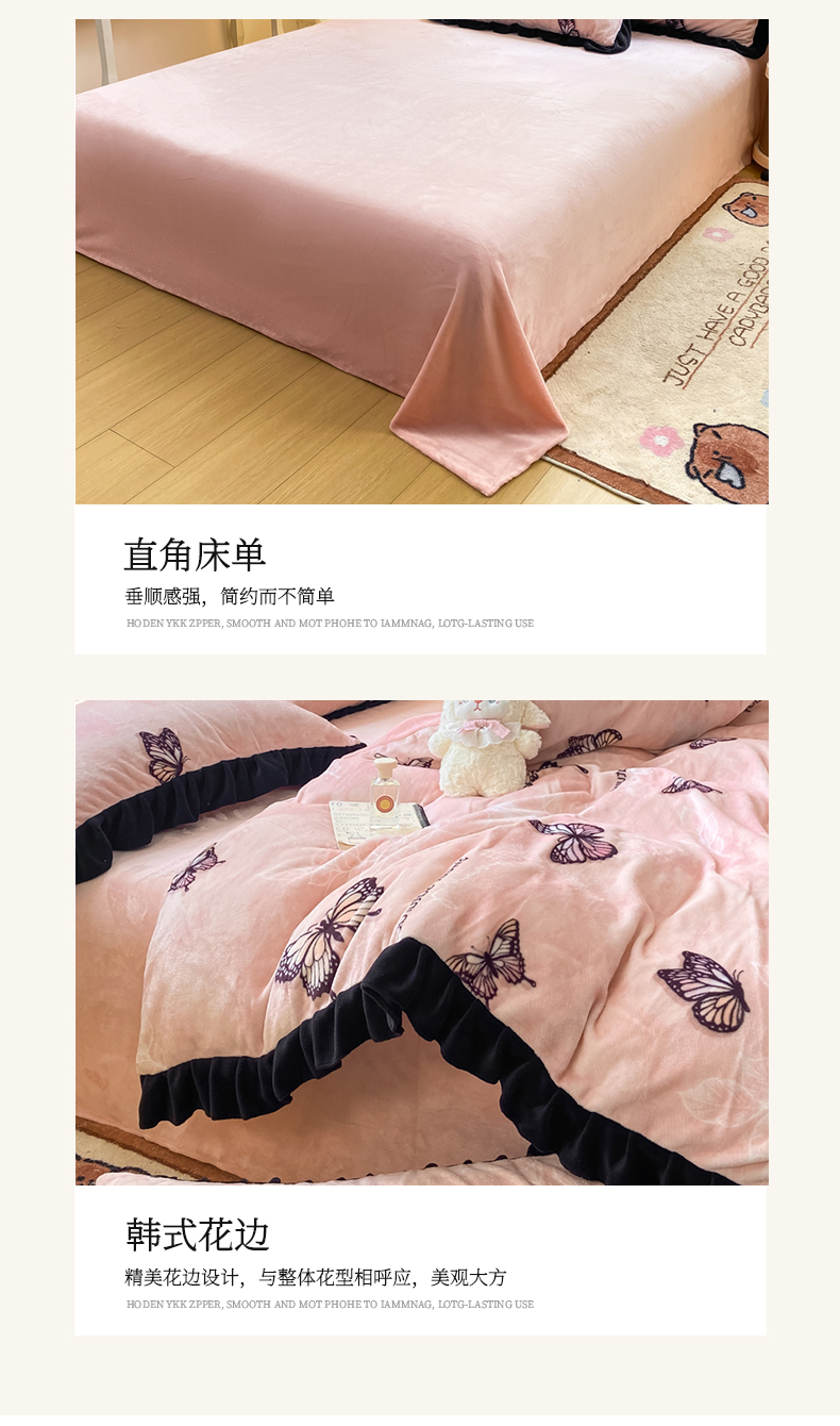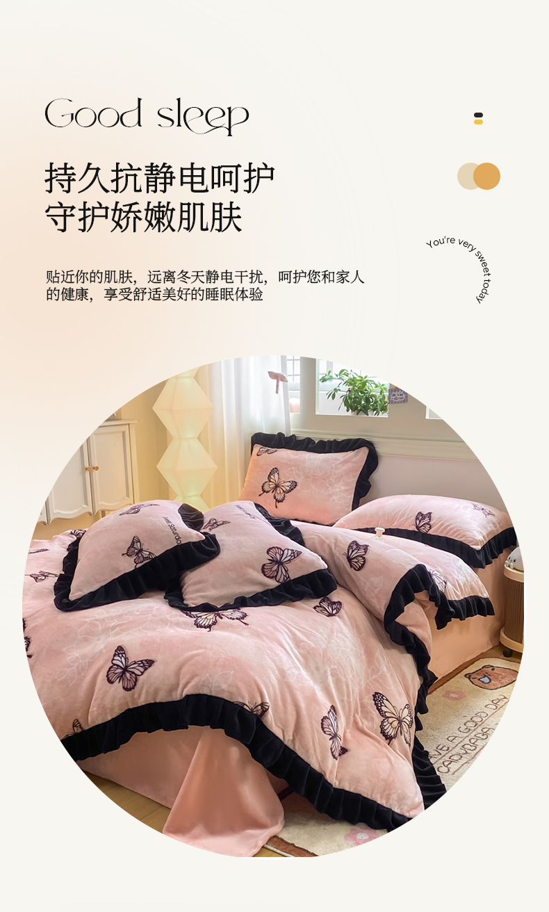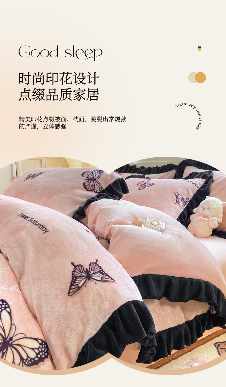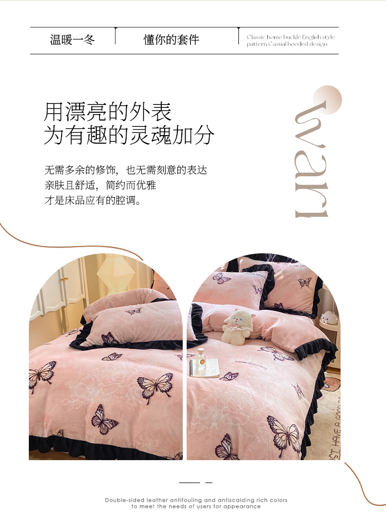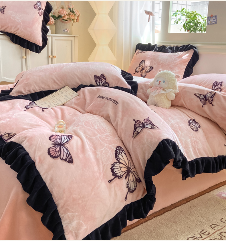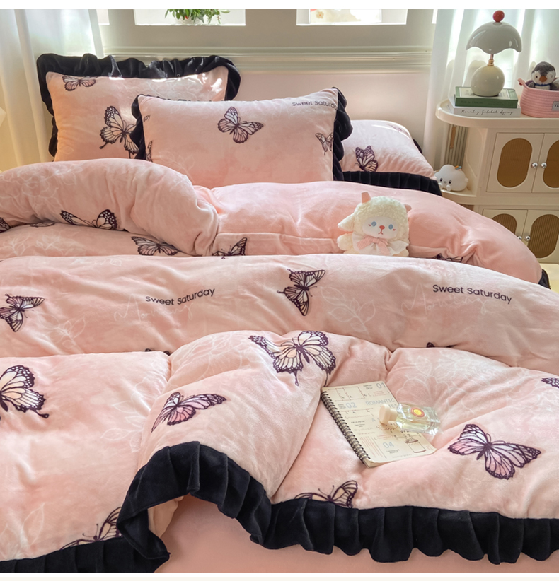 商品名称:富之航家纺 2025新款小香风赫本风ins风大牌韩版大花边轻奢牛奶绒四件套 蝶恋花