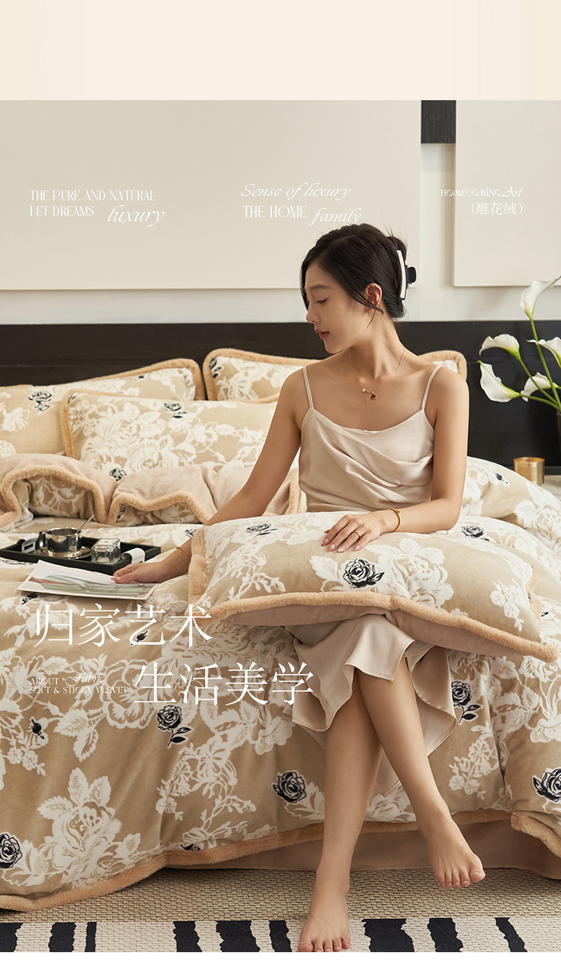 (总)金鹰 2025新款A类雕花牛奶绒烂花兔毛包边四件套,羽毛,波澜壮阔,繁花,蝴蝶梦,简爱,兰花,玫瑰物语,梦幻森林,清晨玫瑰,羽叶,仲夏晨歌