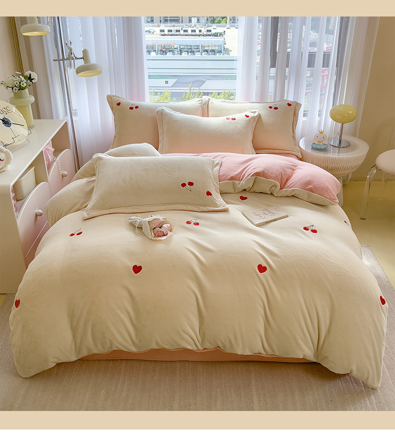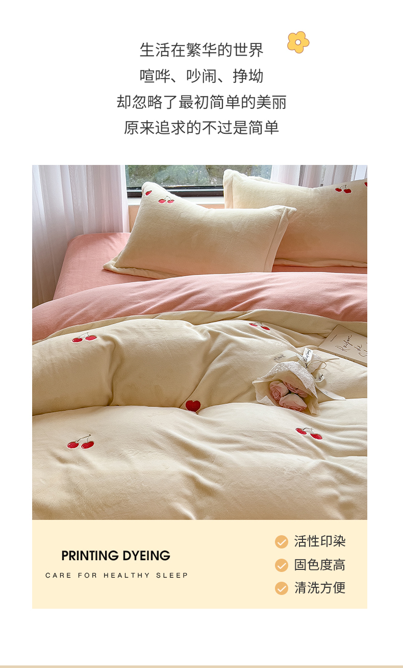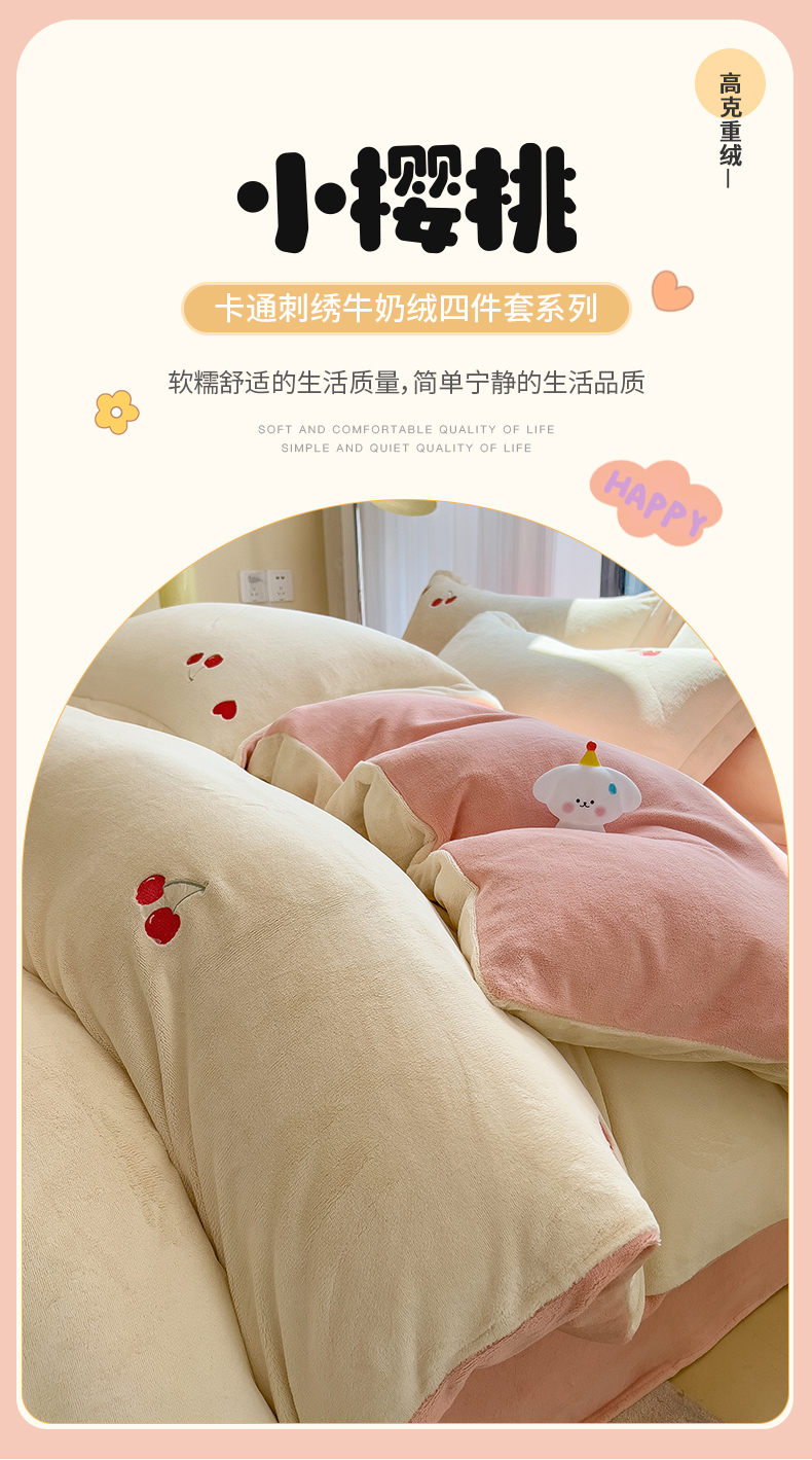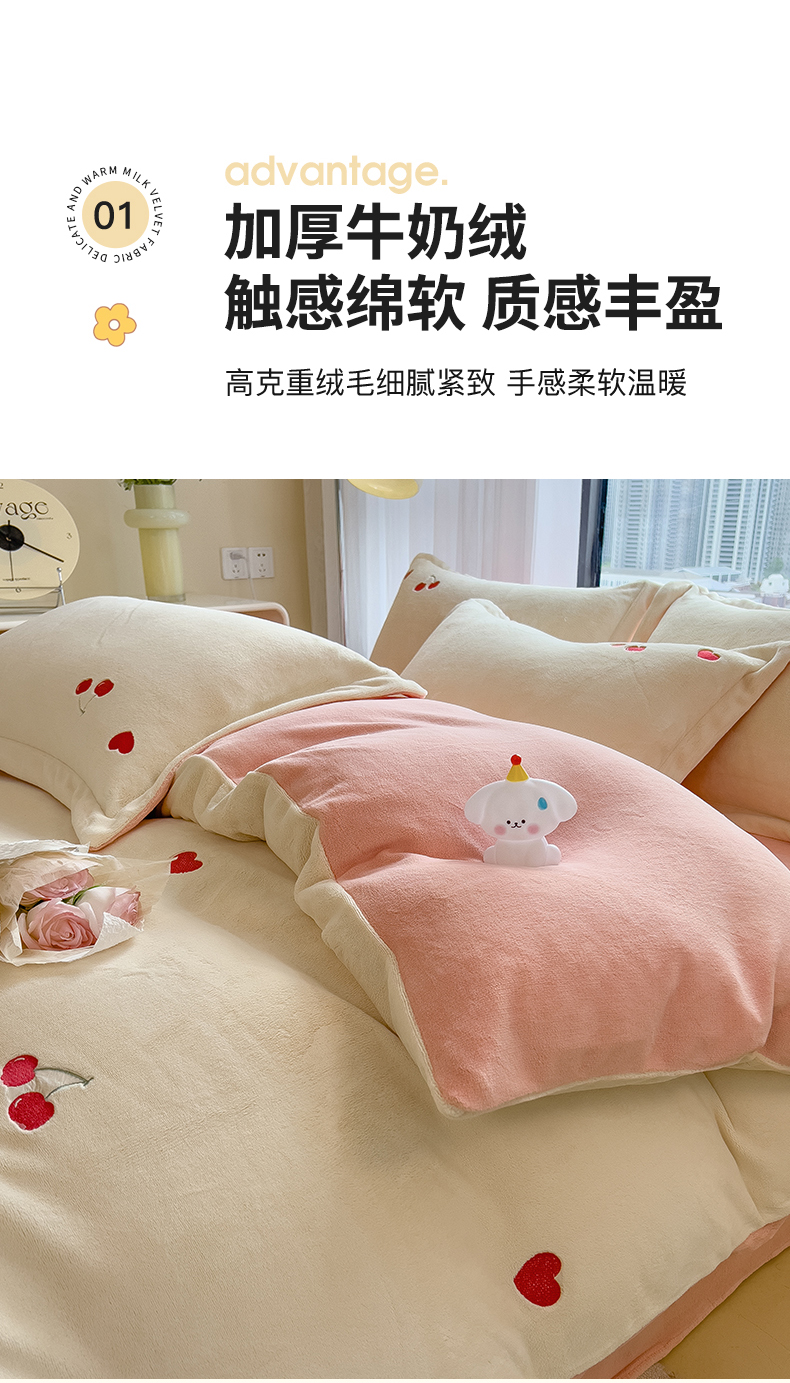商品名称:丽美人家纺 2025新款牛奶绒卡通刺绣系列四件套 小樱桃-粉