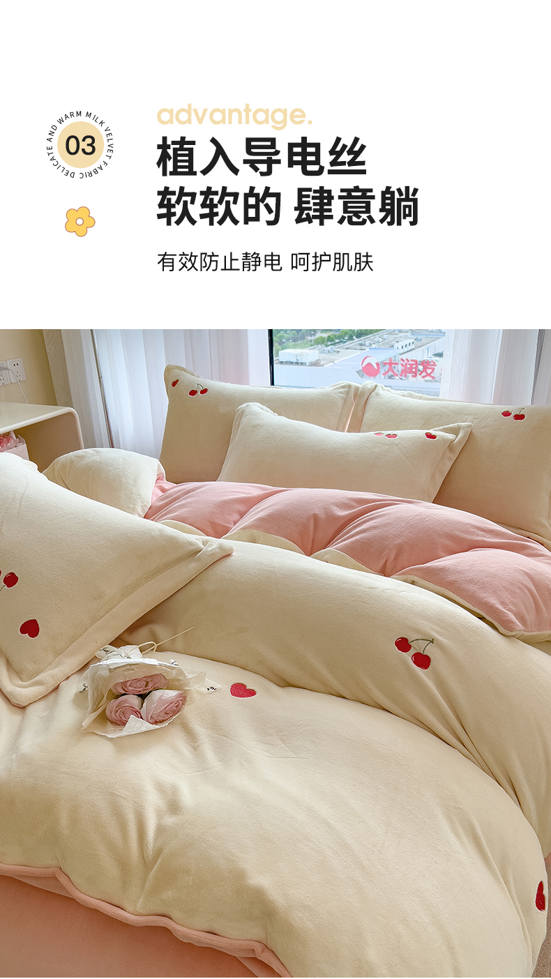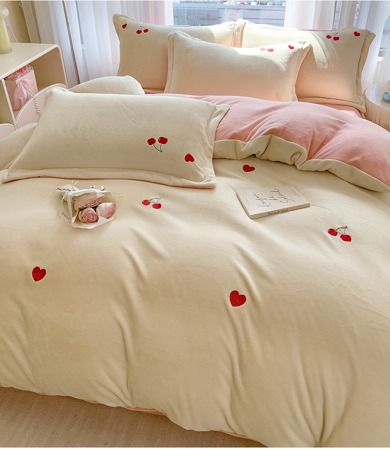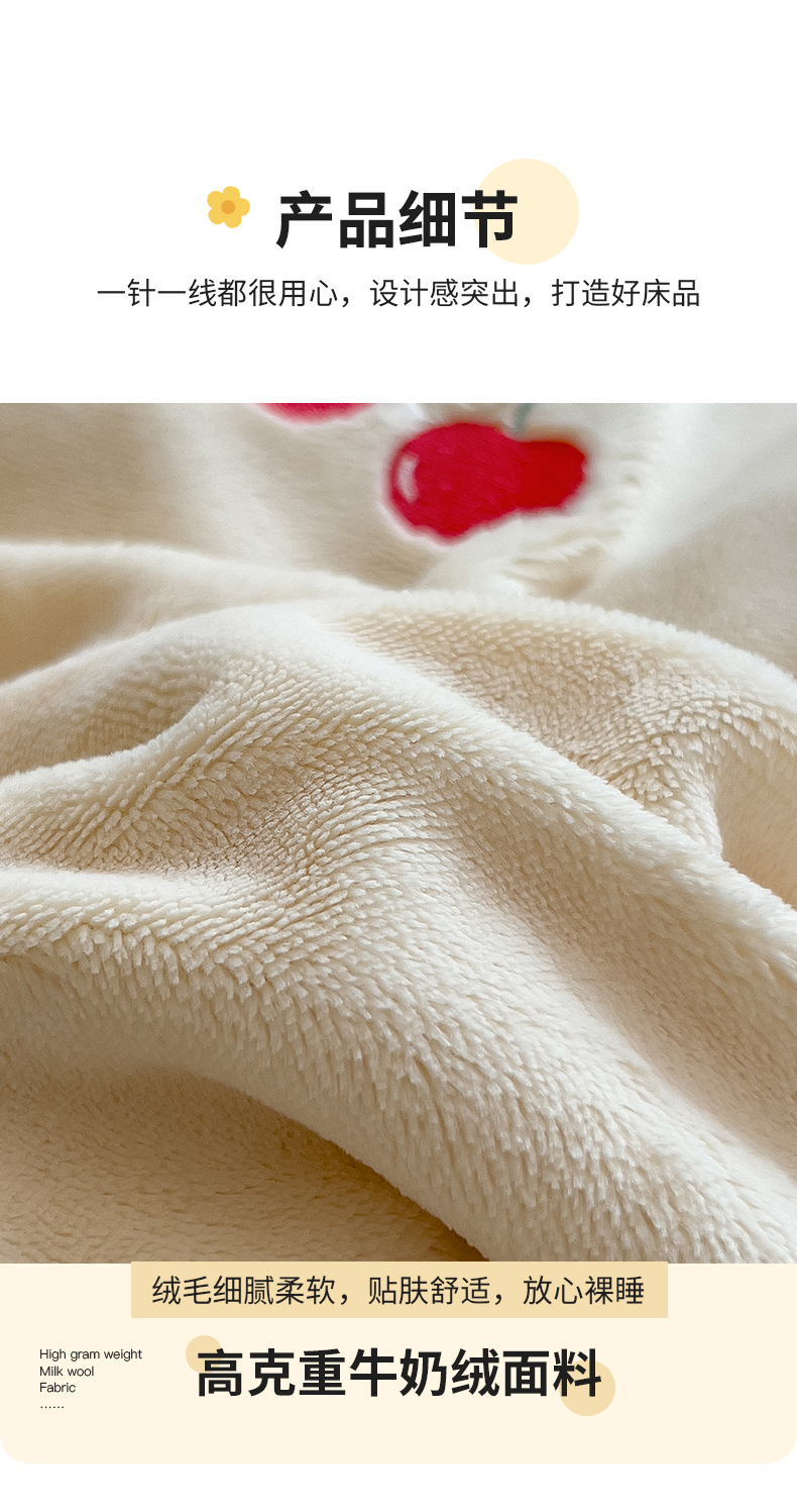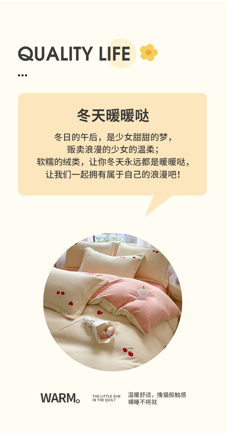 商品名称:丽美人家纺 2025新款牛奶绒卡通刺绣系列四件套 小樱桃-粉