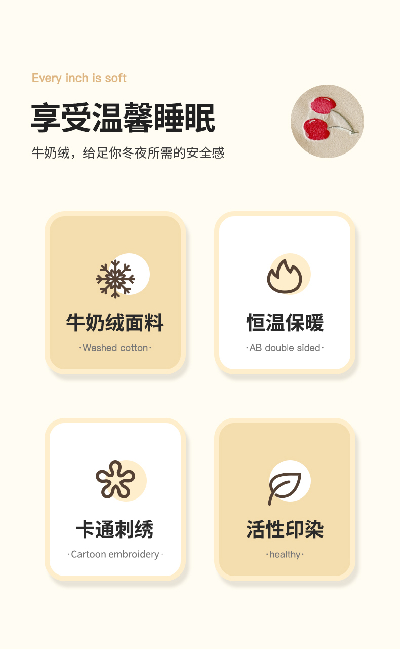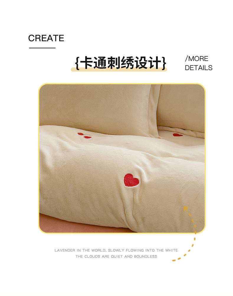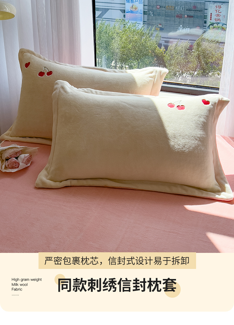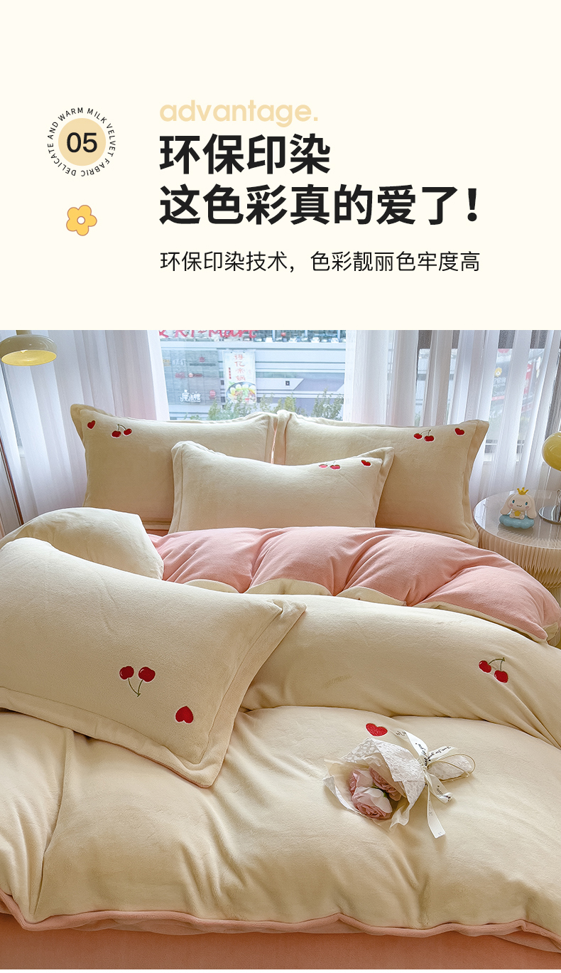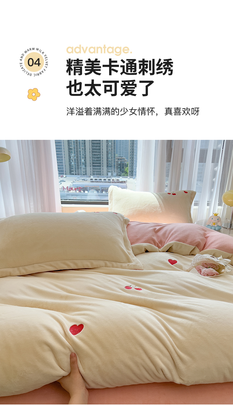 商品名称:丽美人家纺 2025新款牛奶绒卡通刺绣系列四件套 小樱桃-粉