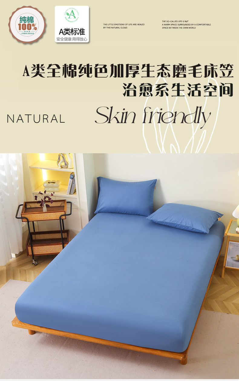 晶缦 2025新款100%纯棉13376纯色喷气全棉磨毛单床笠 暖芸馨-靛青蓝
