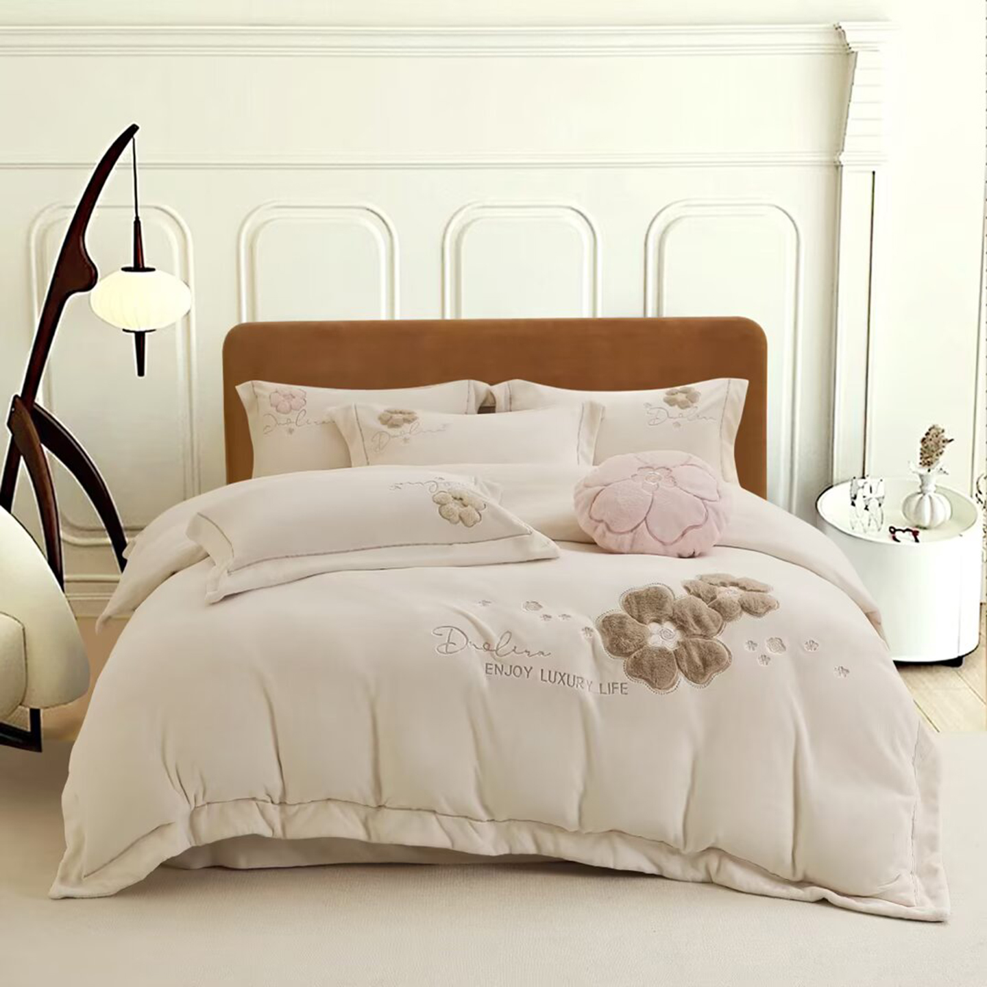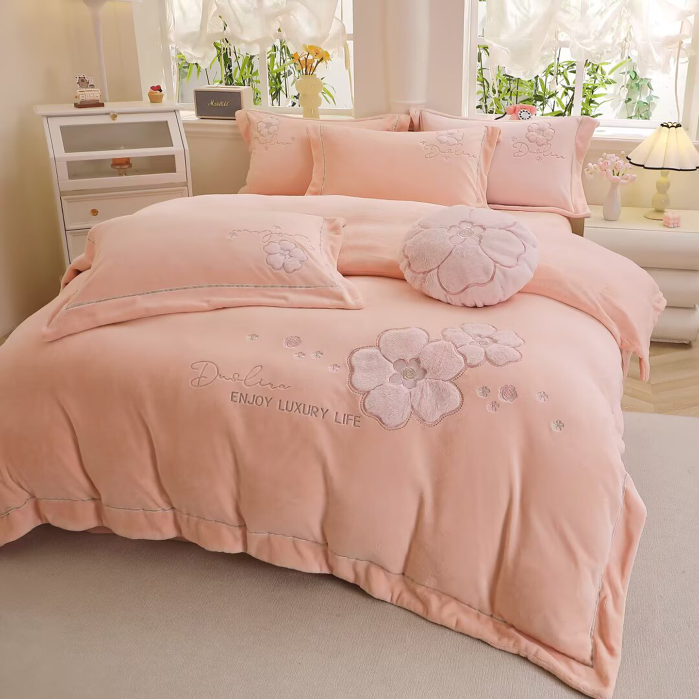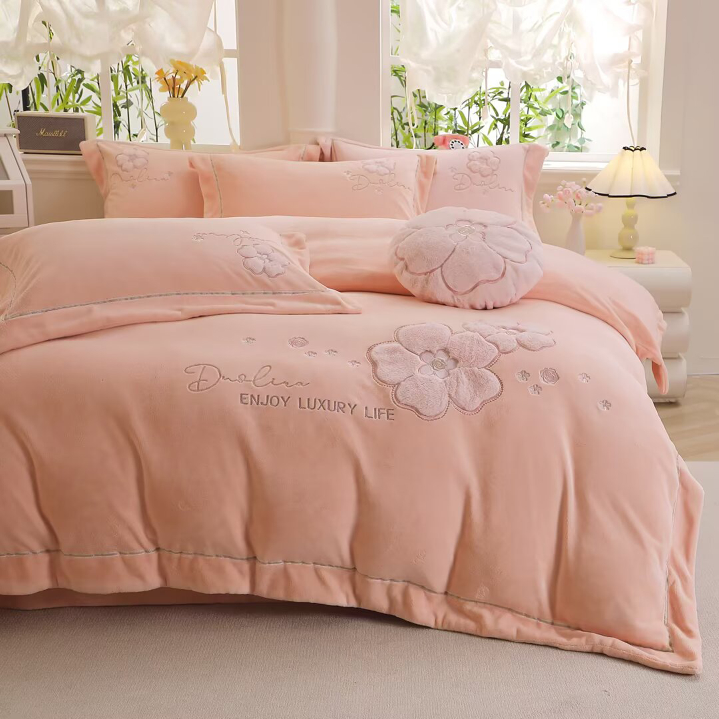棉生活家纺 2025新款高奢工艺260克A类牛奶绒兔毛贴布绣四件套-秀妍 秀妍-粉玉