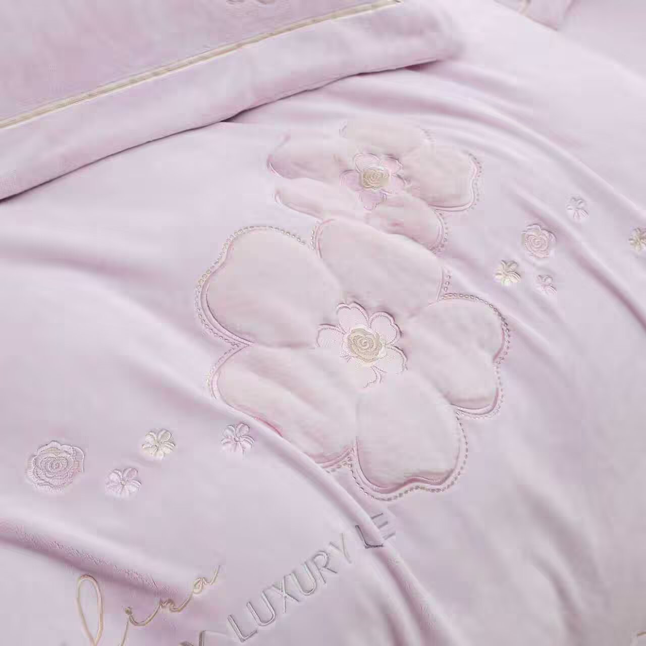 商品名称:棉生活家纺 2025新款高奢工艺260克A类牛奶绒兔毛贴布绣四件套-秀妍 秀妍-粉玉
