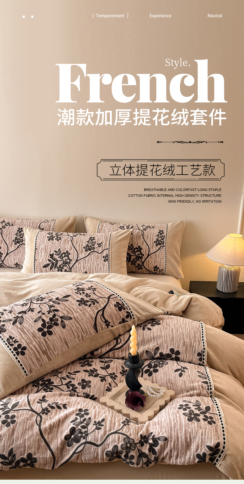 商品名称:慕晨 2025新款立体提花绒工艺款美拉德风格高克重雕花加厚牛奶绒四件套 戈薇