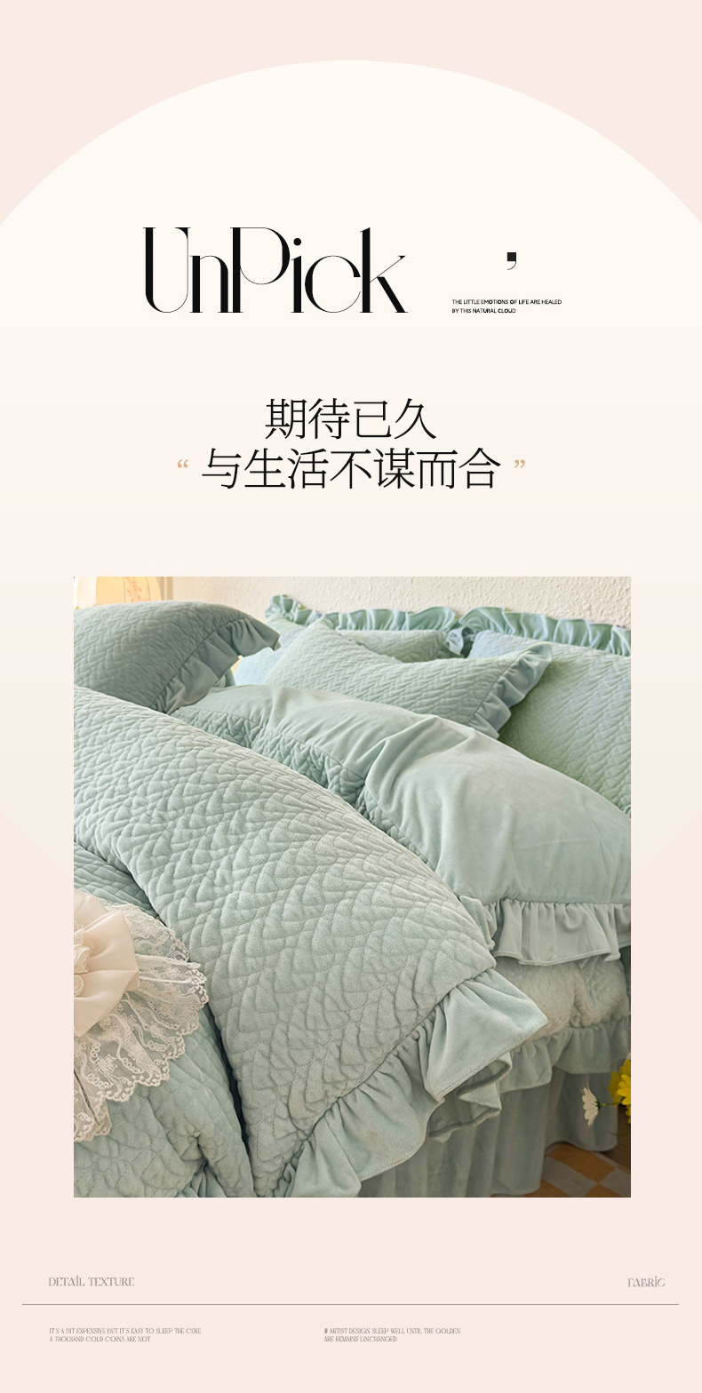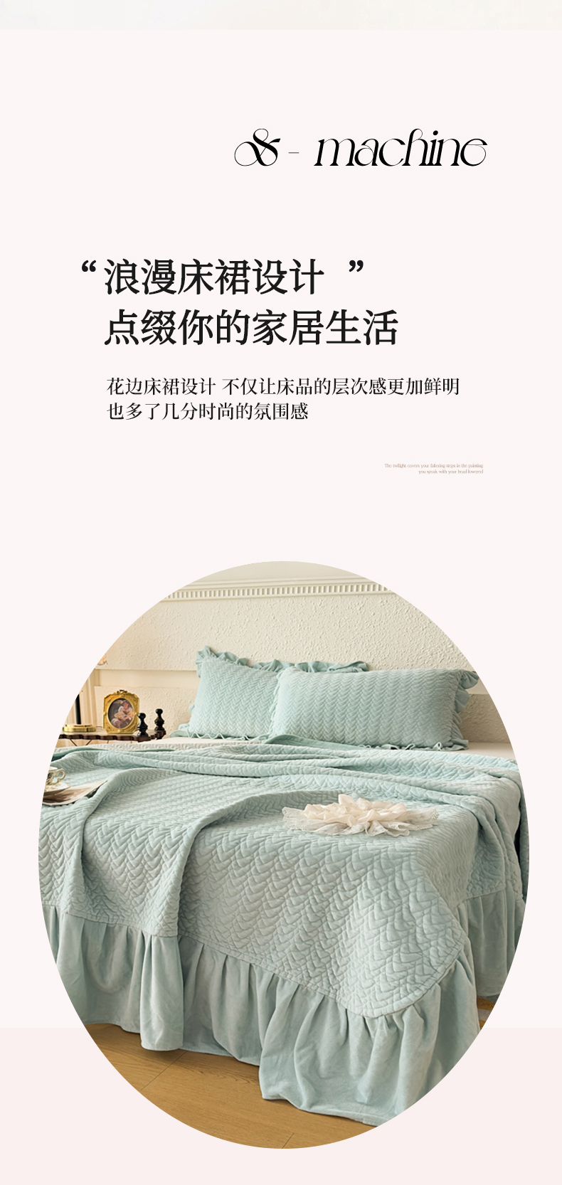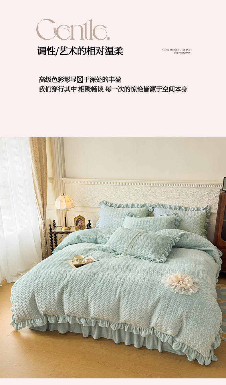 商品名称:乐嘉盈2025年新款纯色刺绣床裙款牛奶绒四件套-云栖 云栖-绿