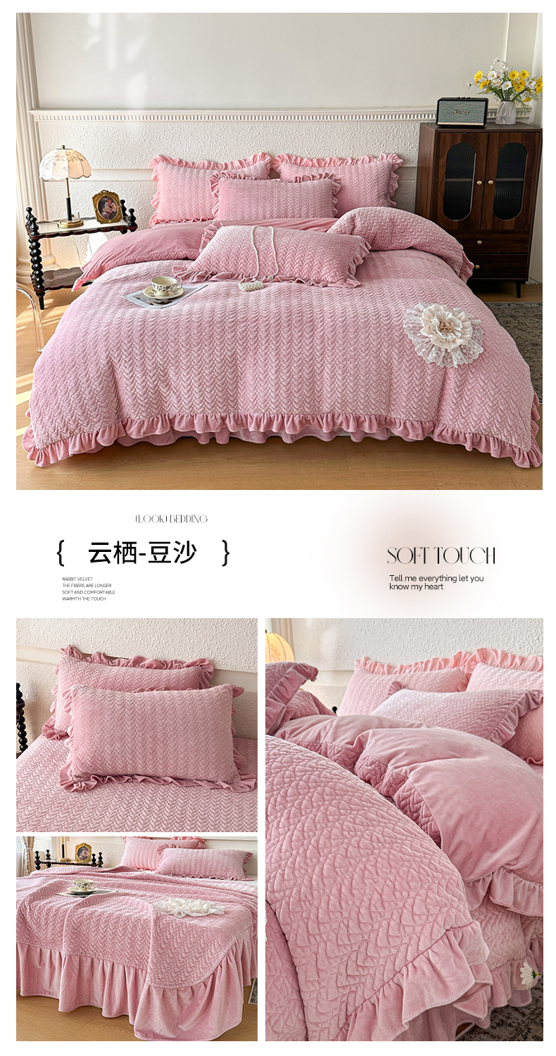 (总)乐嘉盈 2025年新款纯色雕花牛奶绒四件套,粉色