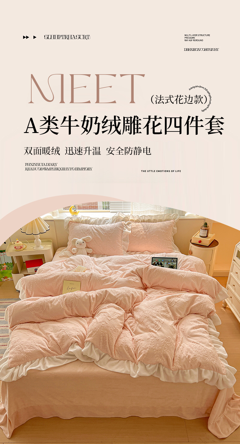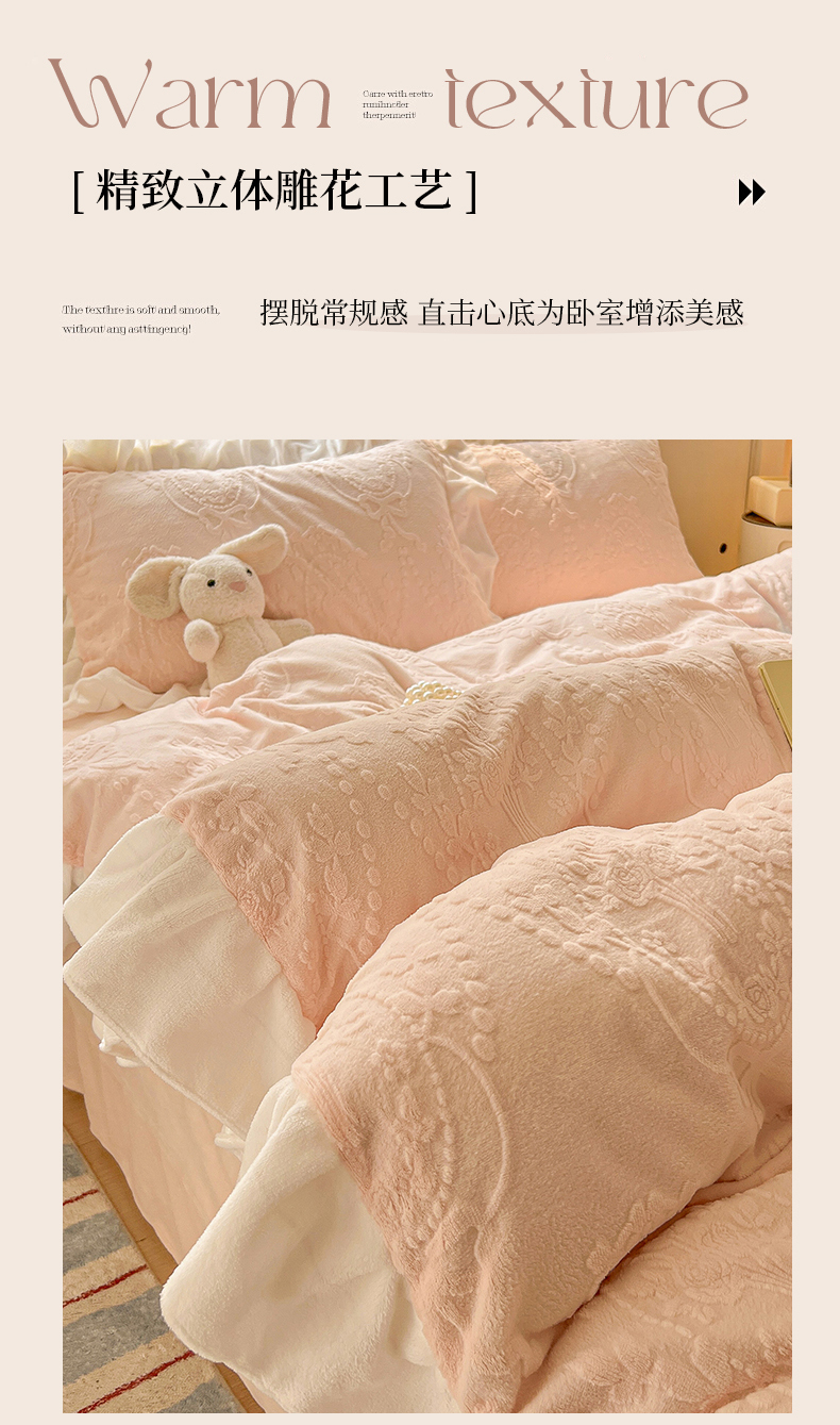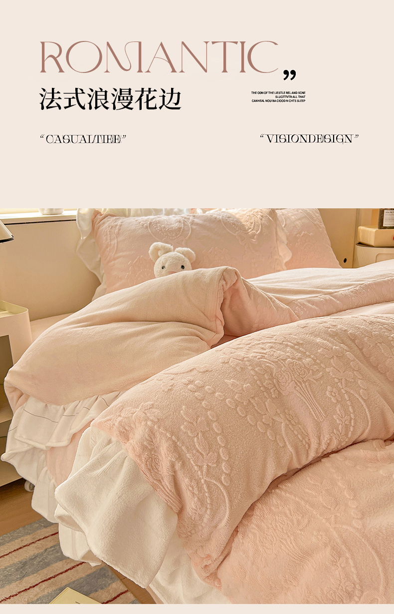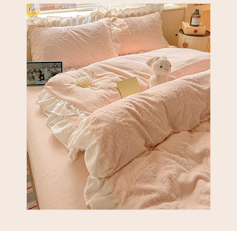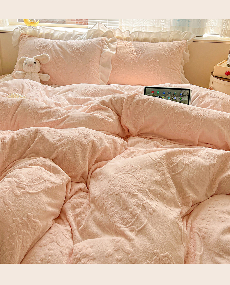 当前位置: 91家纺网 > 商品网购 > 床品套件 > 四件套 > 牛奶绒四件套 > 亿梵家居 2025新款法式花边款A类5D牛奶绒立体雕花四件套(提供买家秀) 花边款 手捧花-樱花粉