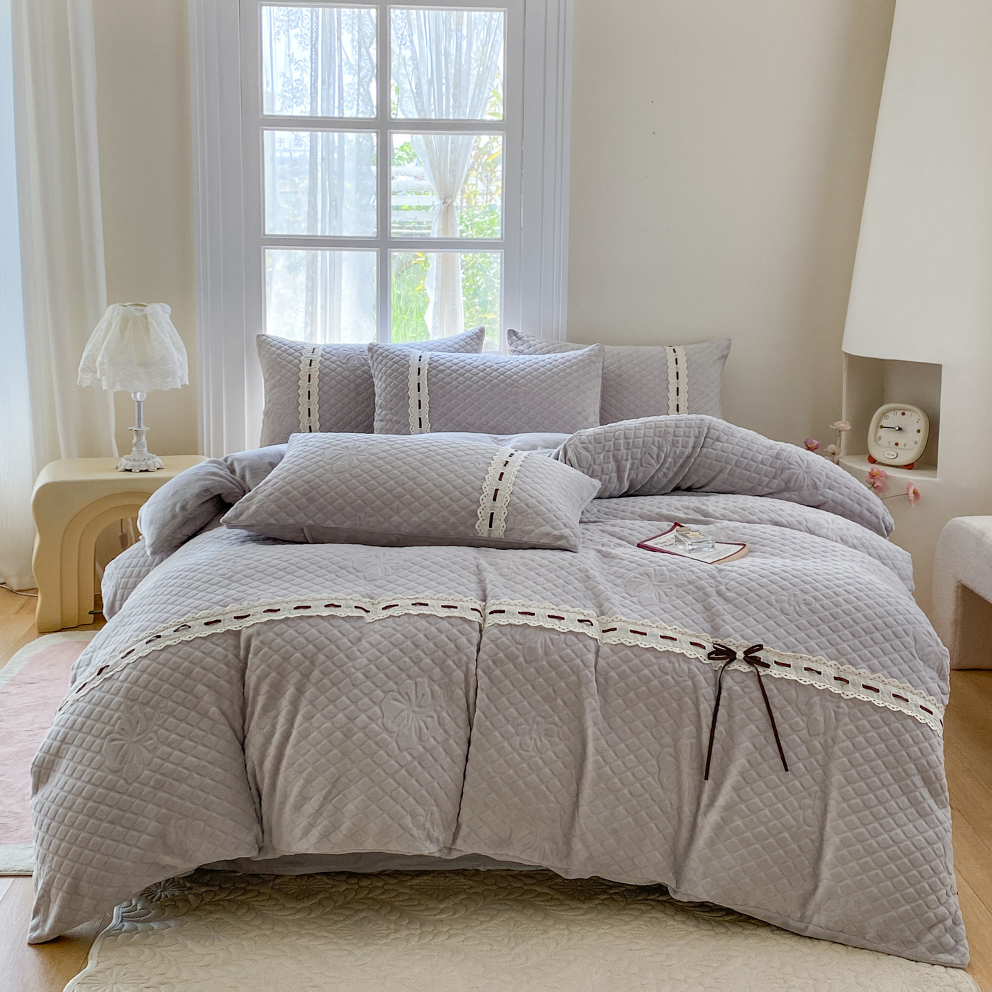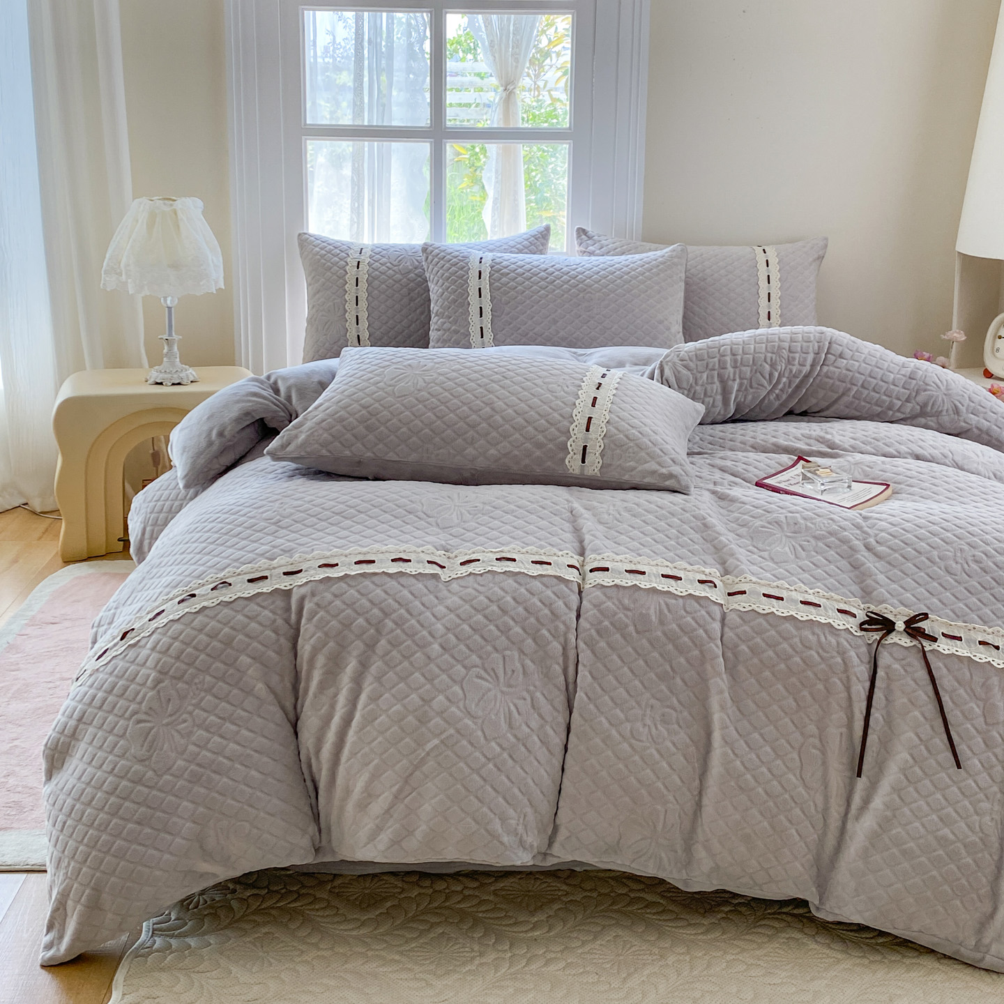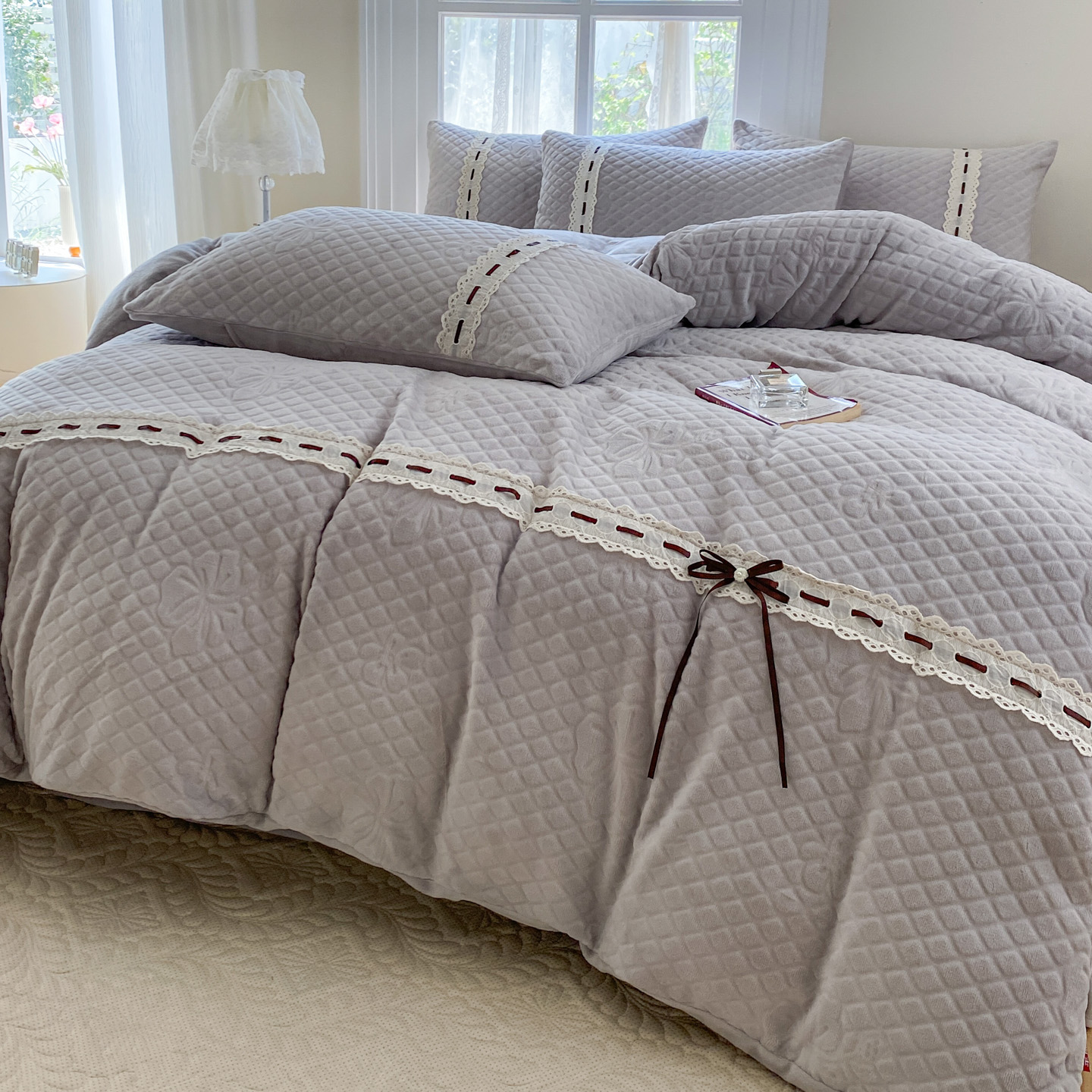 商品名称:乐嘉盈 2025年新款雕花法式蝴蝶结牛奶绒四件套 蝴蝶结-灰