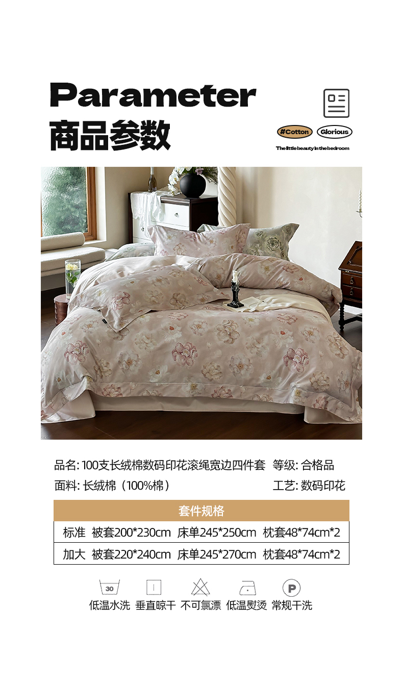 商品名称:窝米 2025新款数码印花100支长绒棉纯棉滚绳宽边工艺四件套 春迟