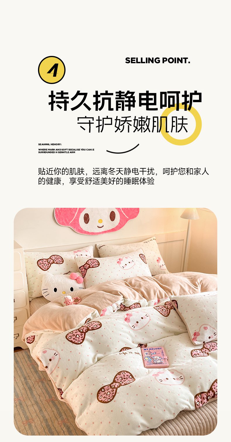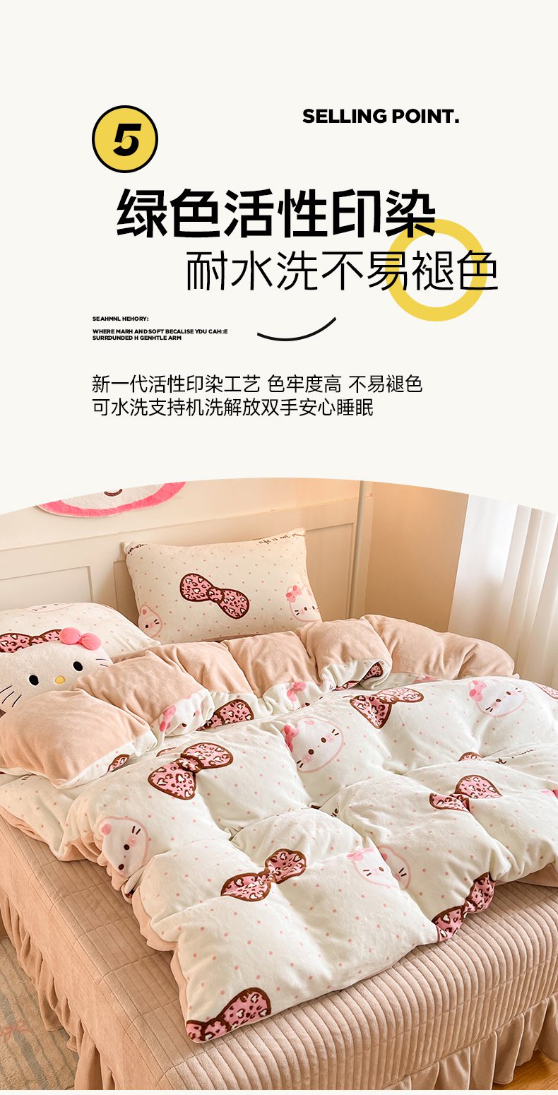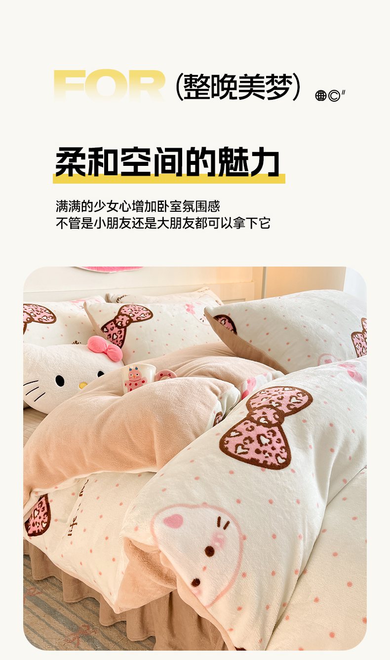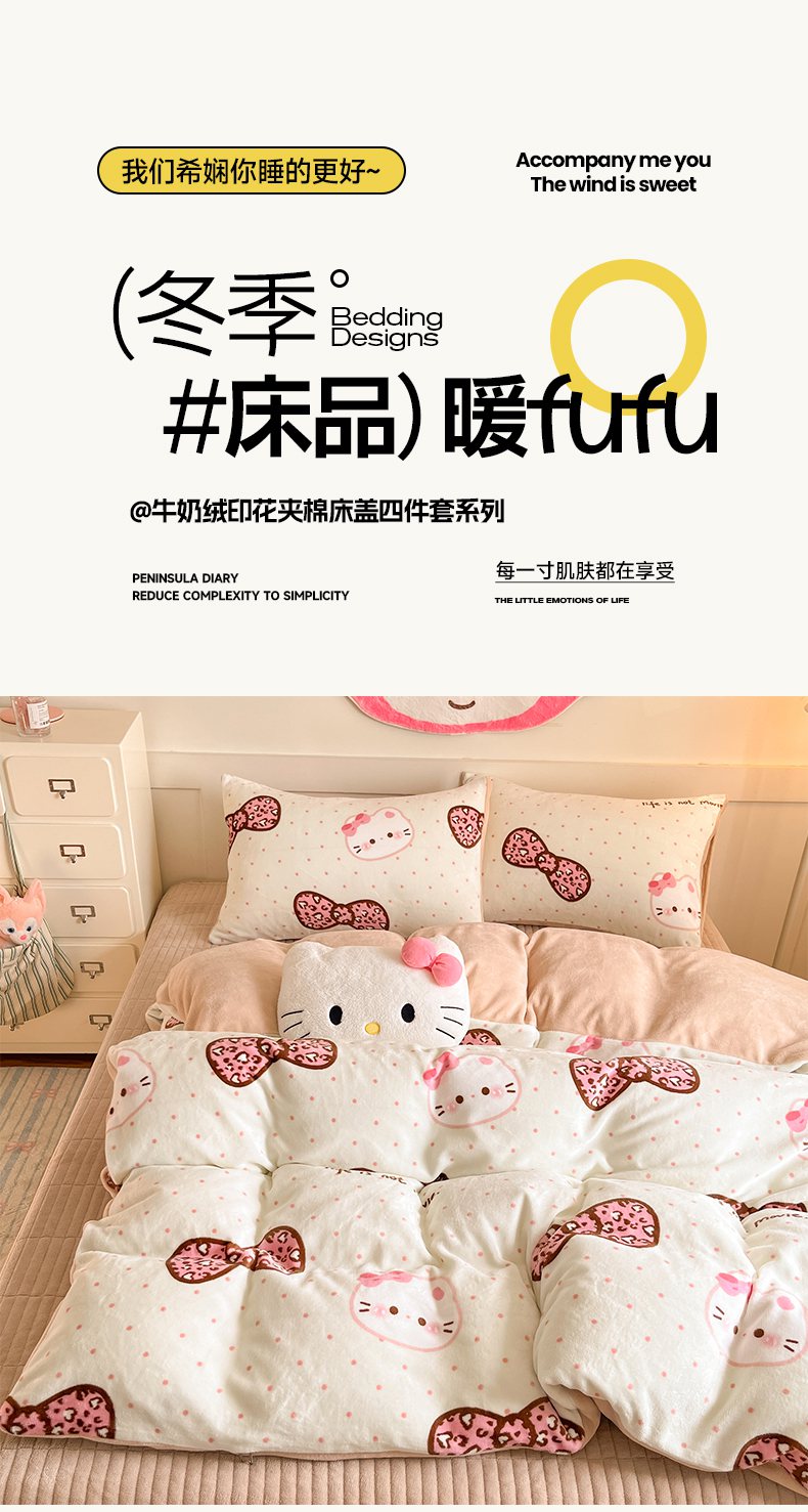 当前位置: 91家纺网 > 商品网购 > 床品套件 > 四件套 > 其它四件套 > 摩妮卡 2025新款牛奶绒印花夹棉床盖印花四件套 蝴蝶结凯蒂