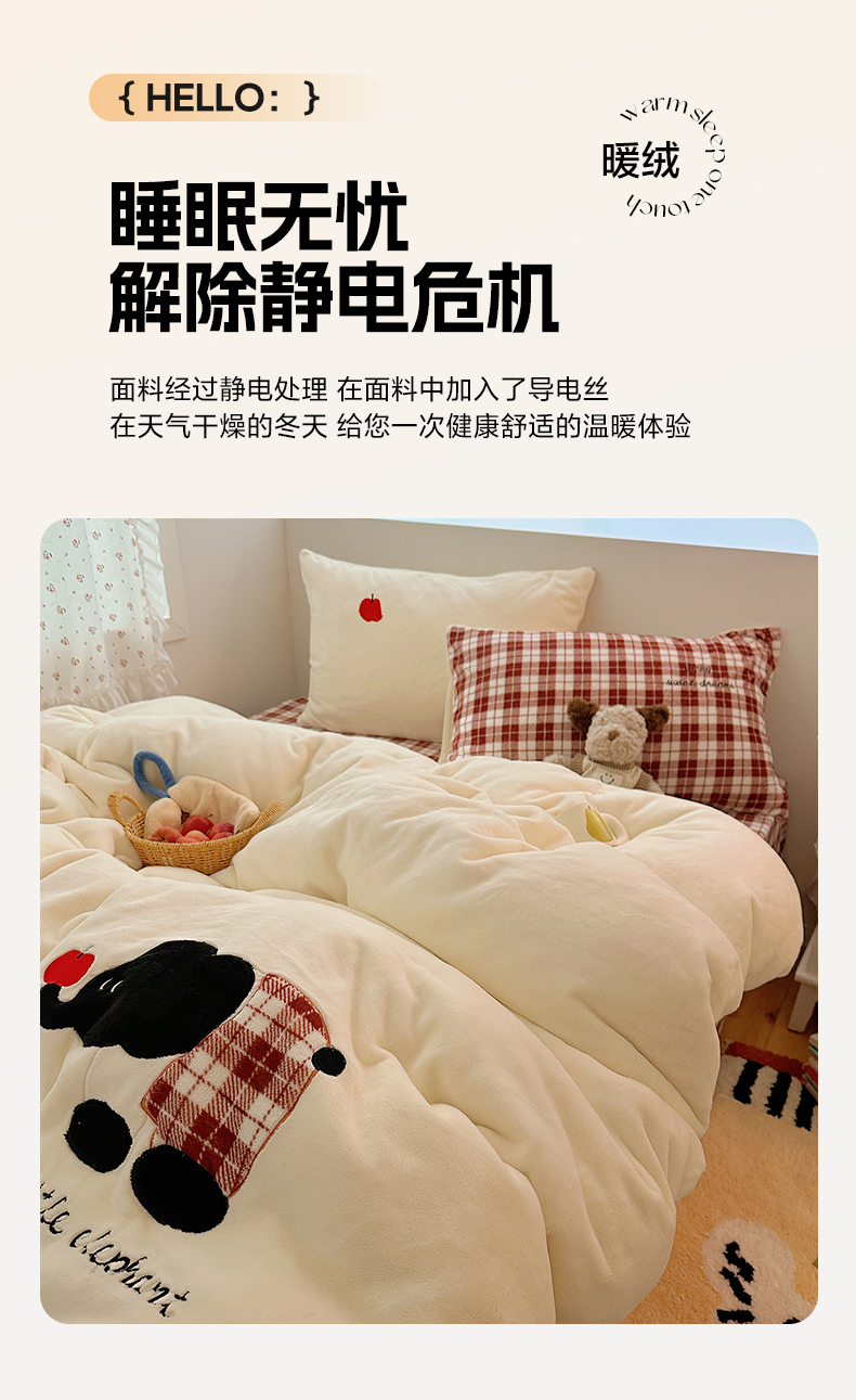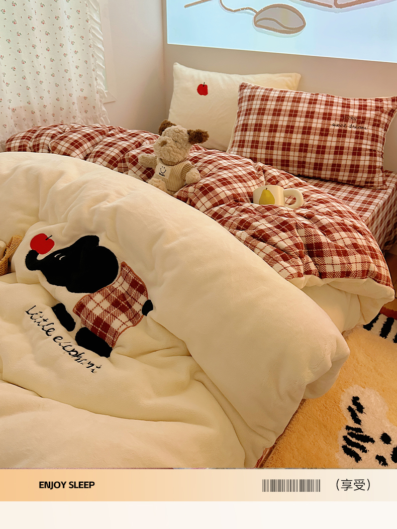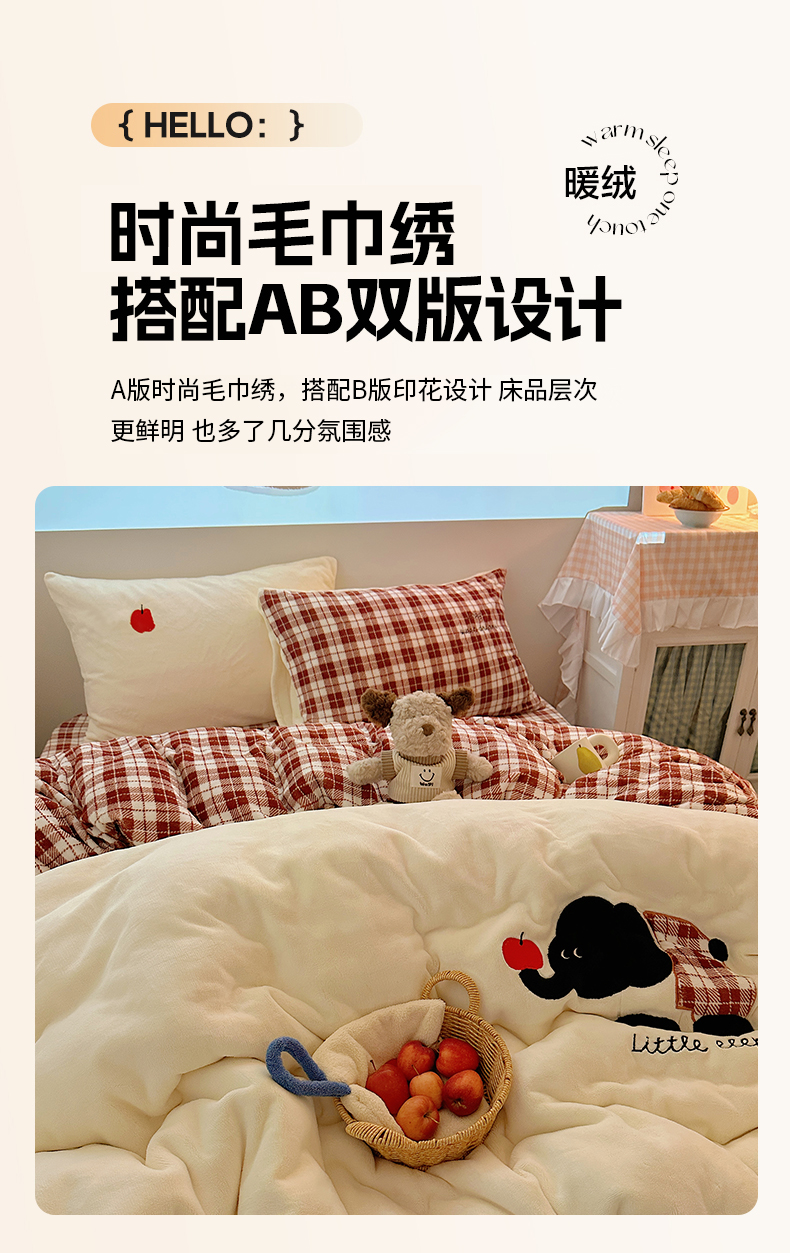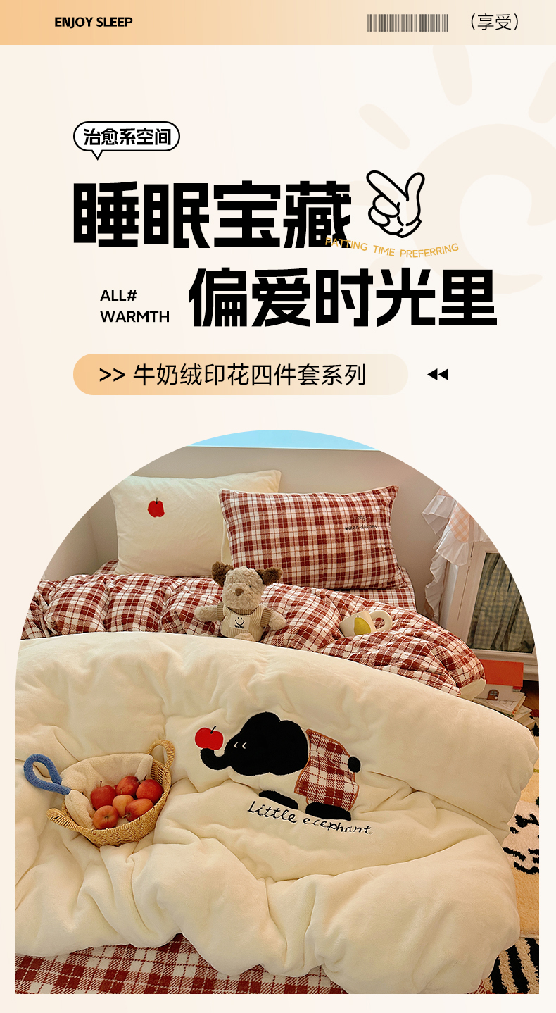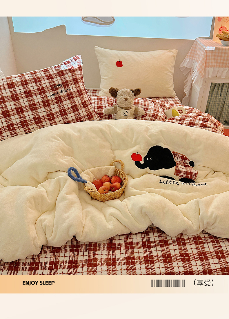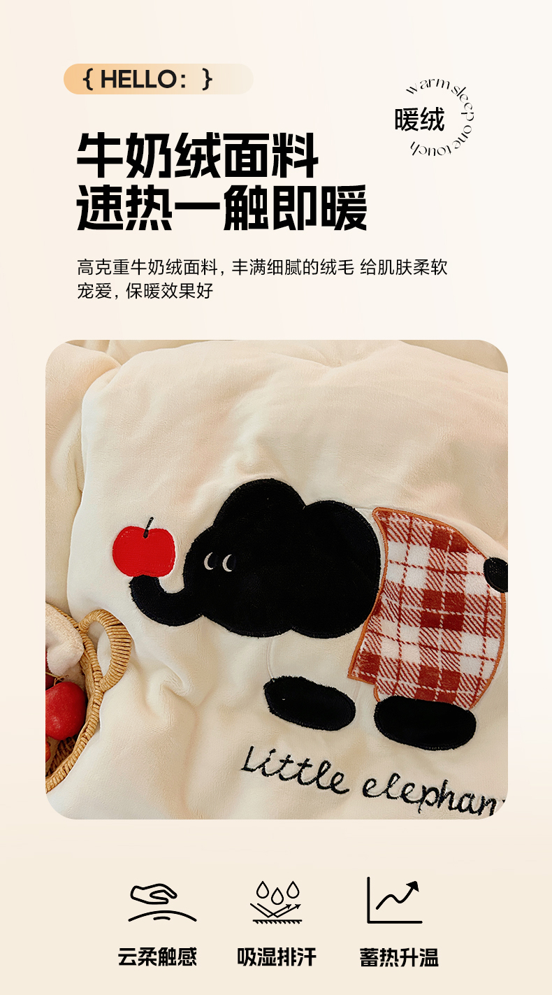 当前位置: 91家纺网 > 商品网购 > 床品套件 > 四件套 > 牛奶绒四件套 > 繁花家居 2025新款高克重牛奶绒贴布绣印花四件套 苹果小象