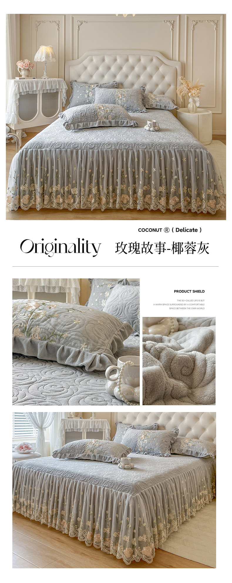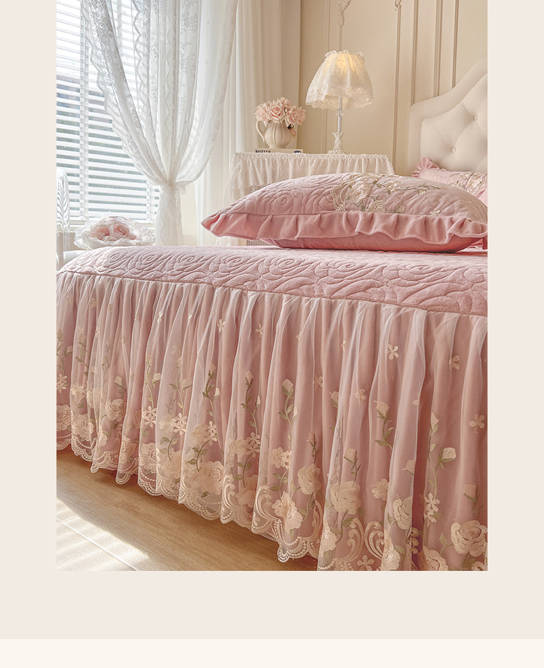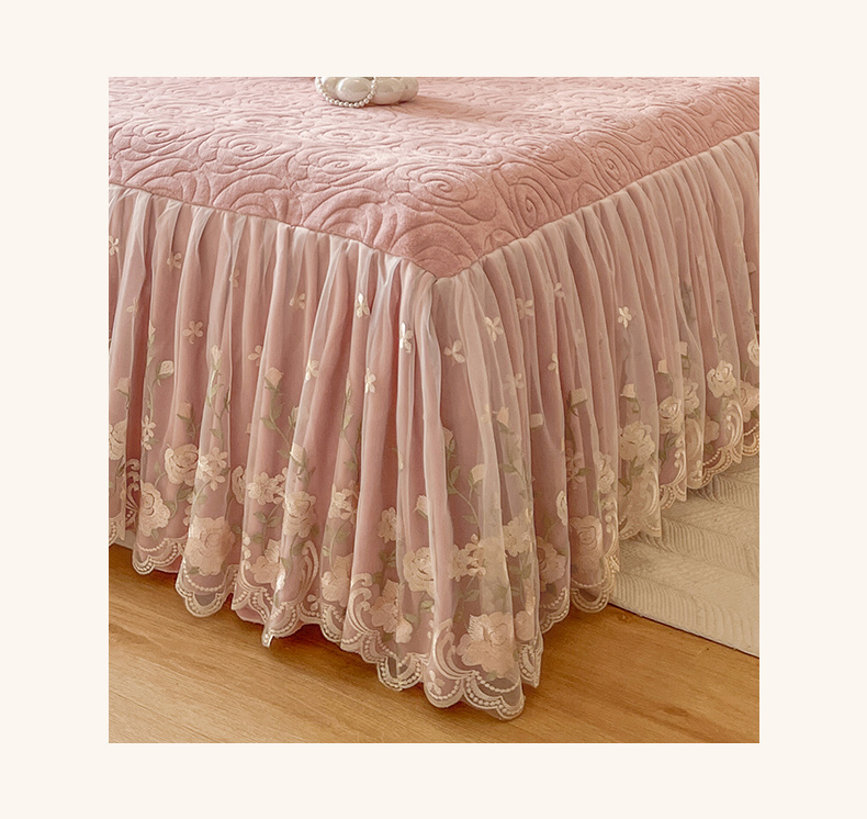 恋尚 2025新款柔软牛奶绒保暖蕾丝床裙单品-玫瑰故事(控价150) 玫瑰故事-蜜桃粉