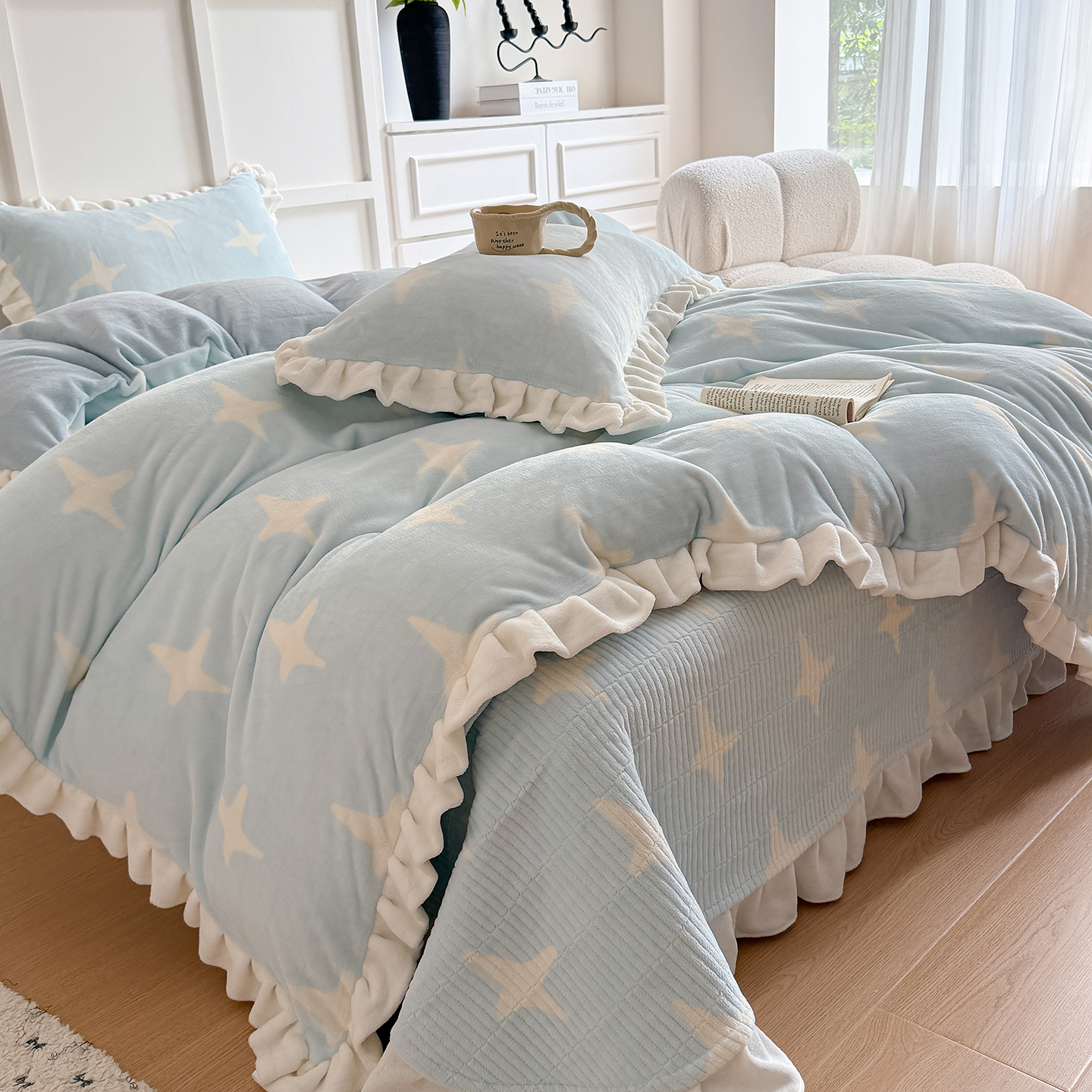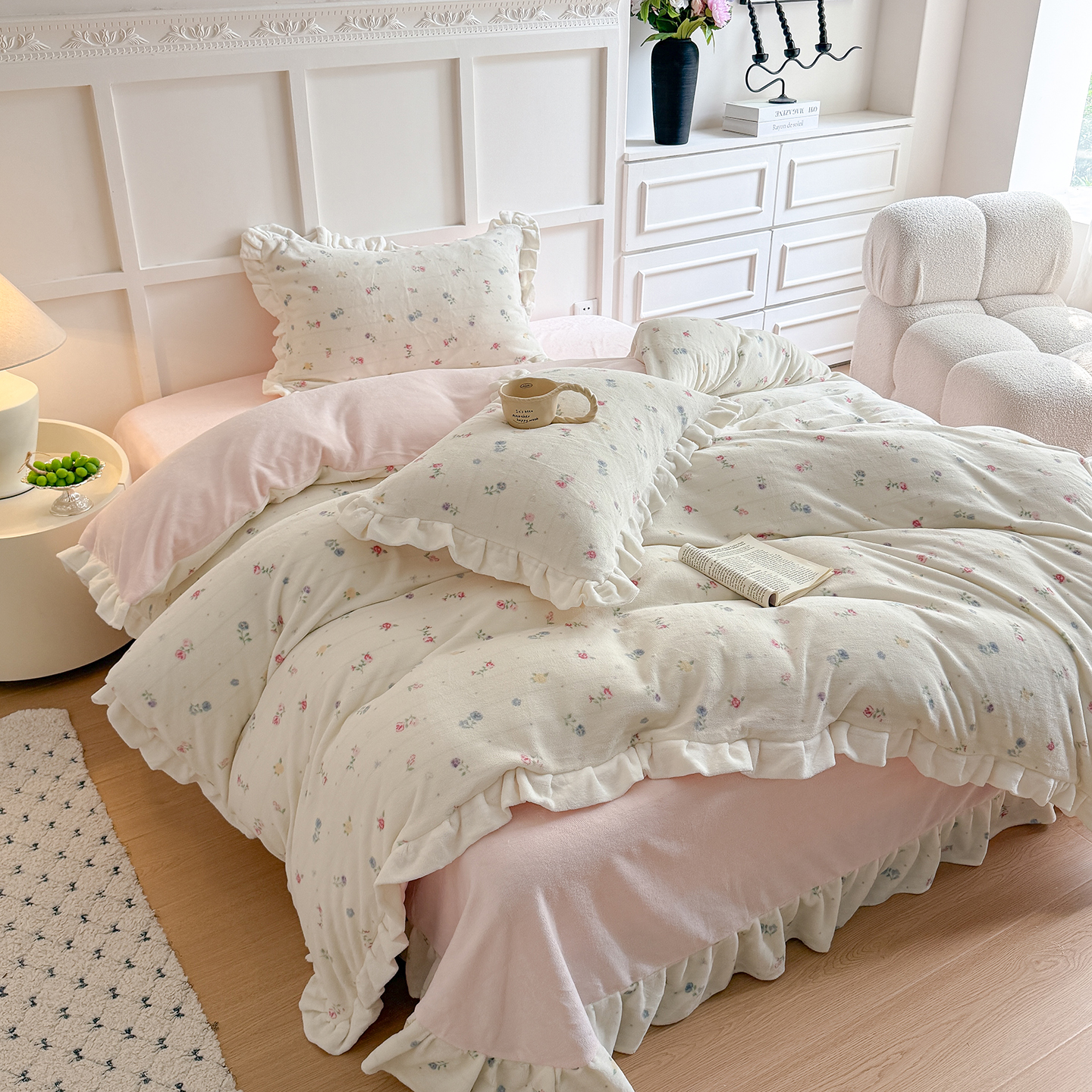 当前位置: 91家纺网 > 商品网购 > 床品套件 > 四件套 > 牛奶绒四件套 > 潘朵拉家纺 2025新款法式牛奶绒双层花边四件套 松岛千叶