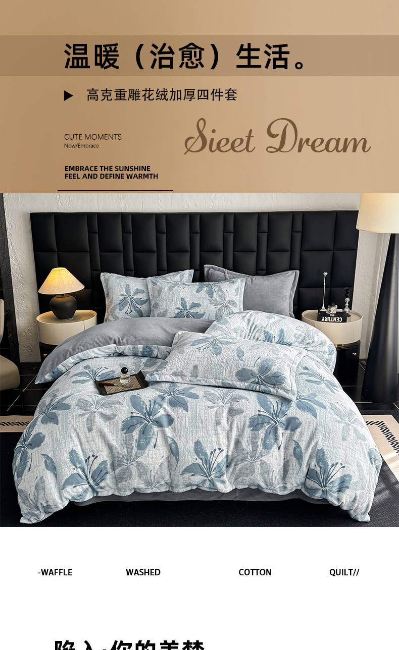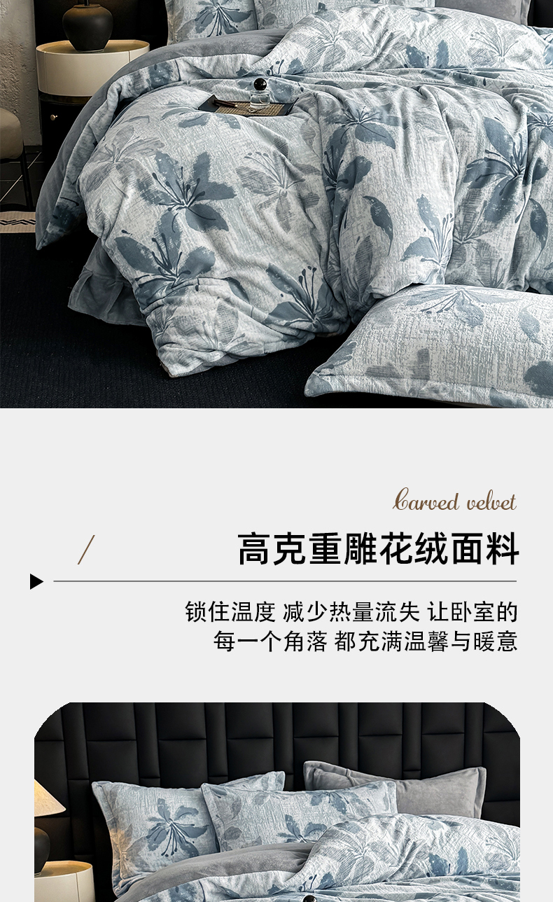 当前位置: 91家纺网 > 商品网购 > 床品套件 > 四件套 > 其它四件套 > 金盛纺 2025新款亲肤舒适高克重雕花绒系列四件套(可定制) 素花疏影-兰