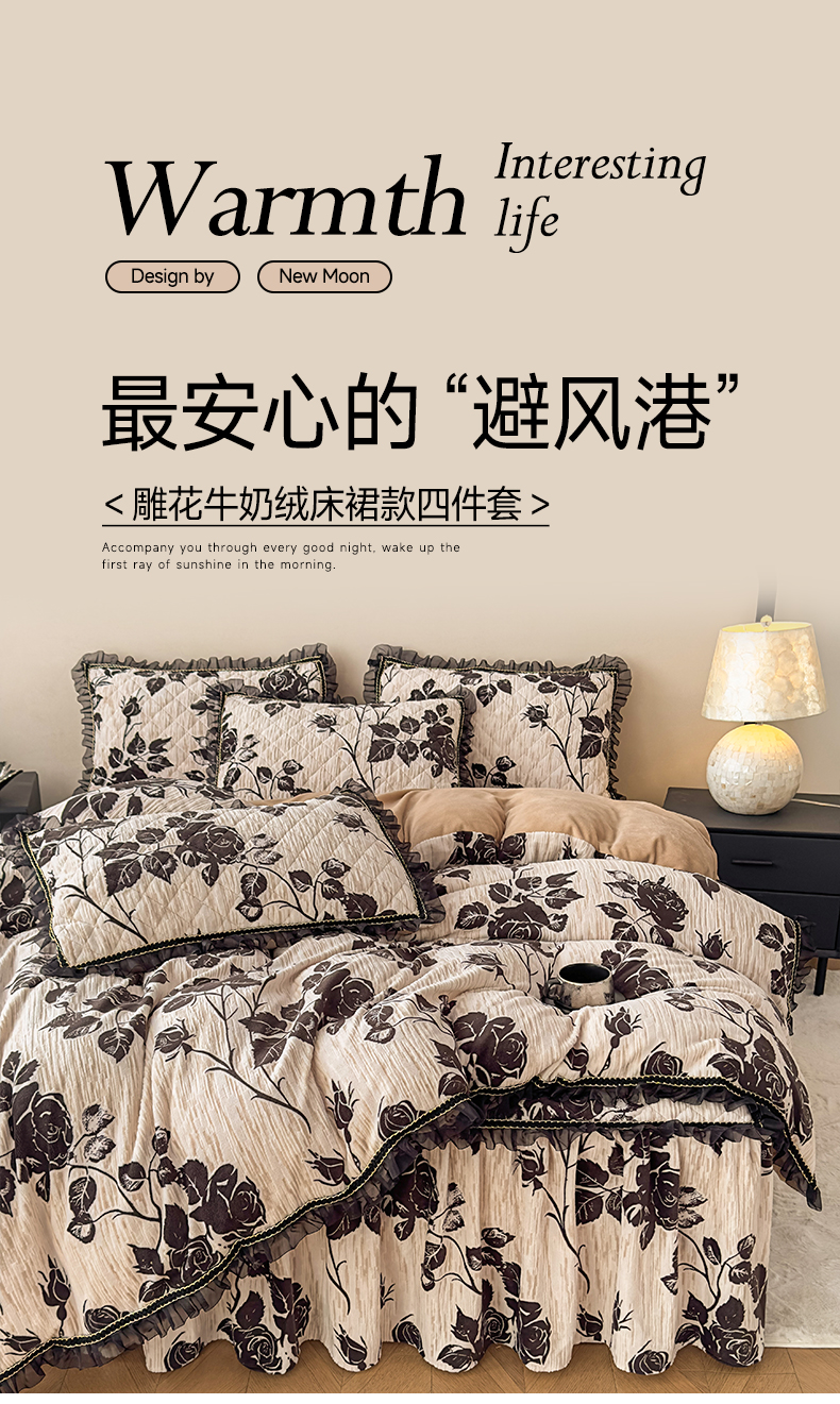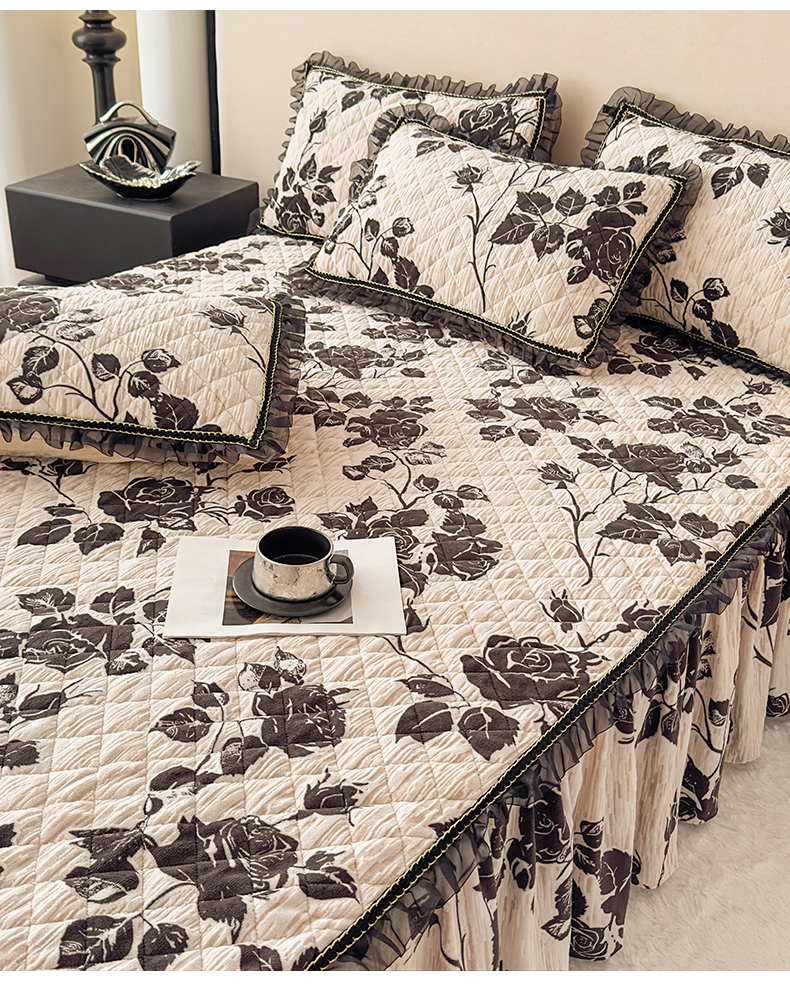 当前位置: 91家纺网 > 商品网购 > 床品套件 > 三件套 > 家之硕家纺 2025新款雕花牛奶绒床裙款三件套 黑玫瑰