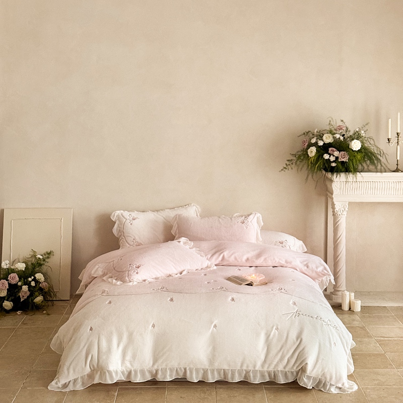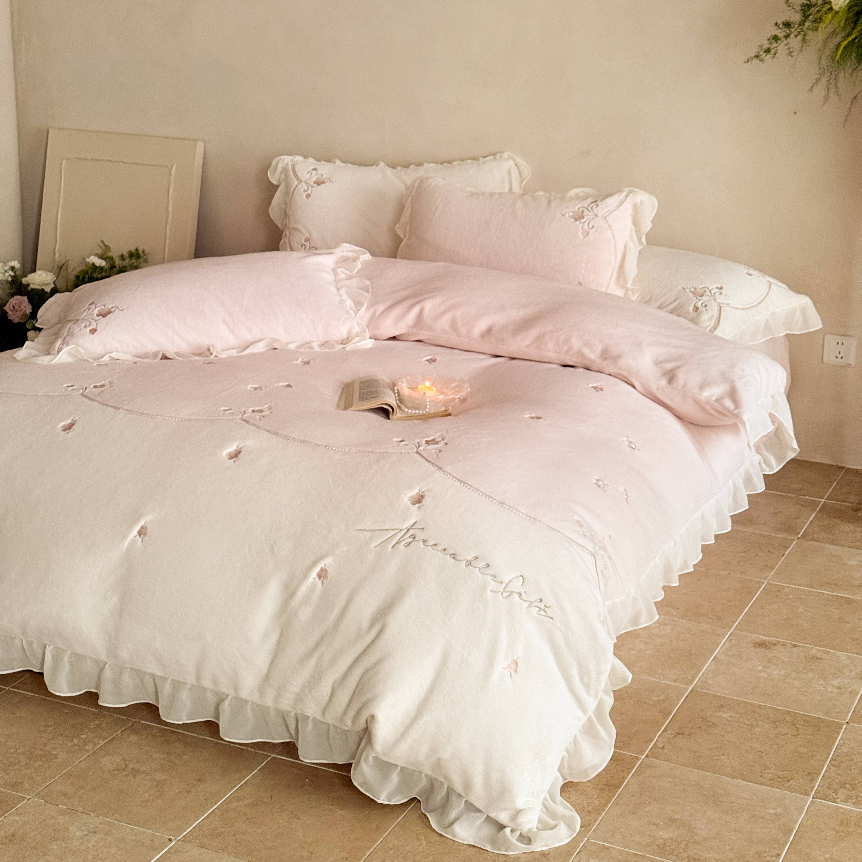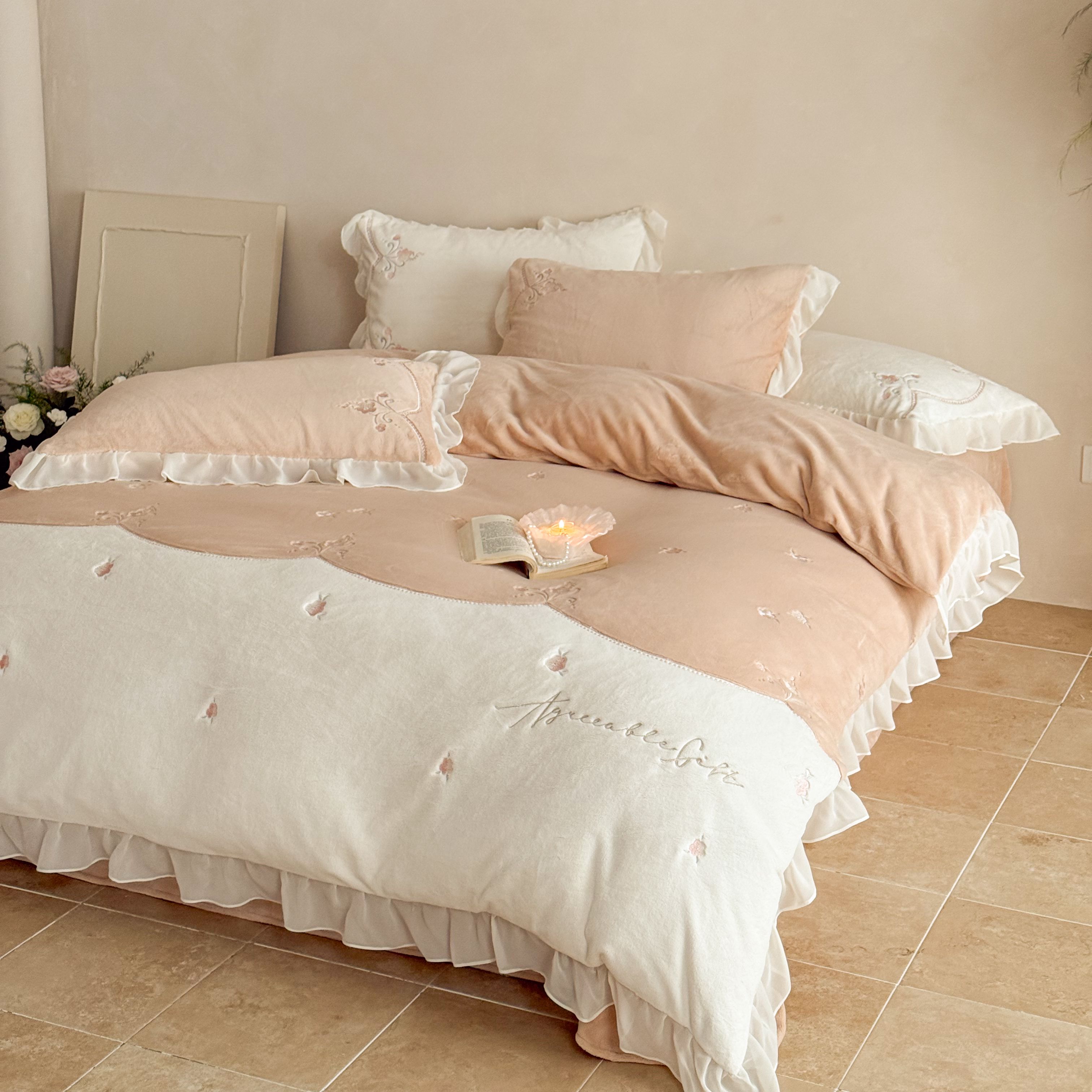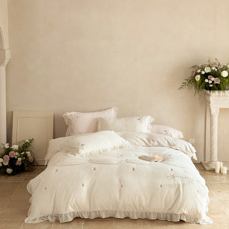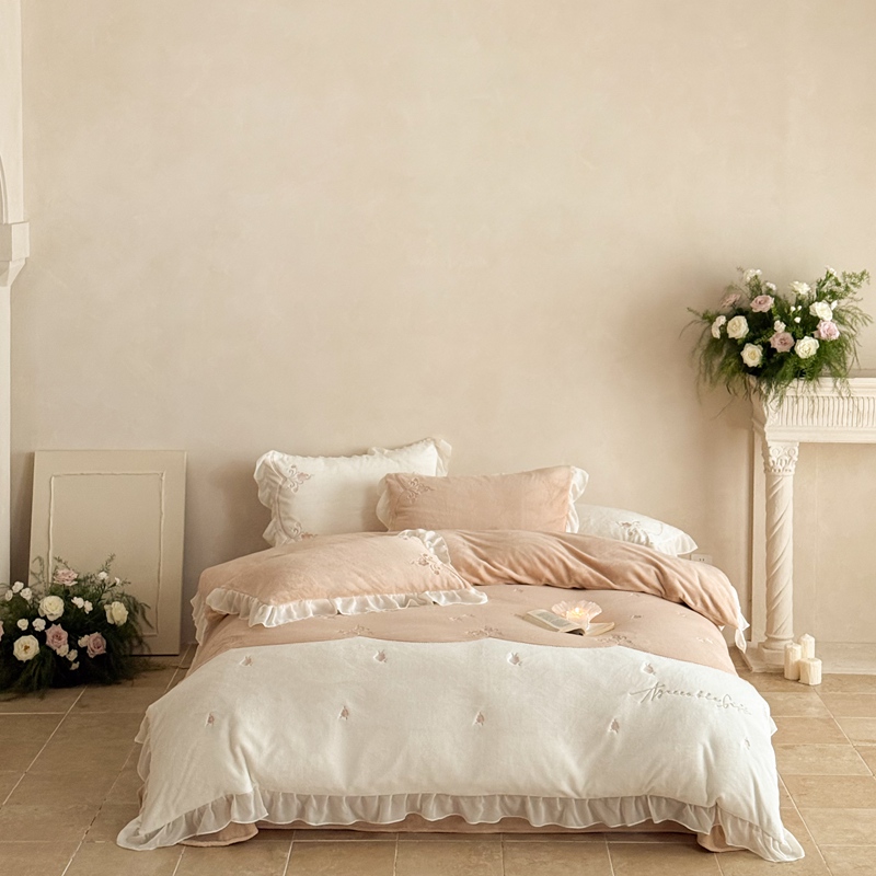 (总)黛舒家居 2025新款牛奶绒绣花纯色拼接刺绣款花边四件套,瑰月汐-白,瑰月汐-粉,瑰月汐-卡其