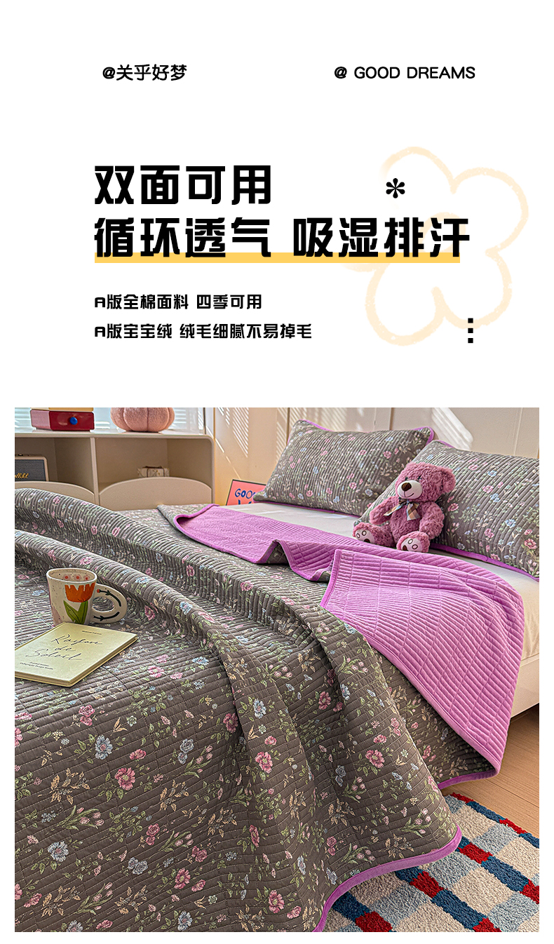 (总)橙子家居 2025新款双面全棉纯棉砂洗夹棉床盖三件套,粉木马,腊肠狗,梦露花园,苹果趣事,甜心南瓜,小熊贝蒂,樱桃派,组合图仅供展示,格子小熊,赫本,莫娇-黄,沁花-绿,薇恋时光,雾里花-粉,雅清