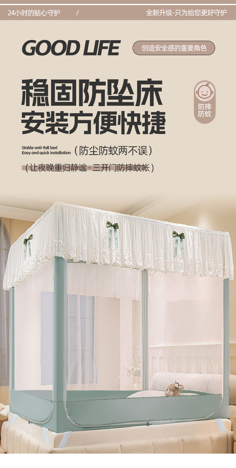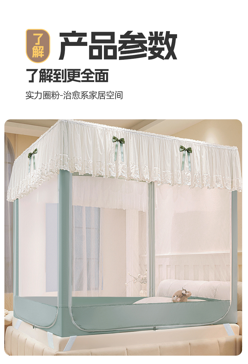 (总)夏彩 2025新款蕾丝U型防摔坐床蚊帐-88630,绿雅灰,藕玉色,香槟色