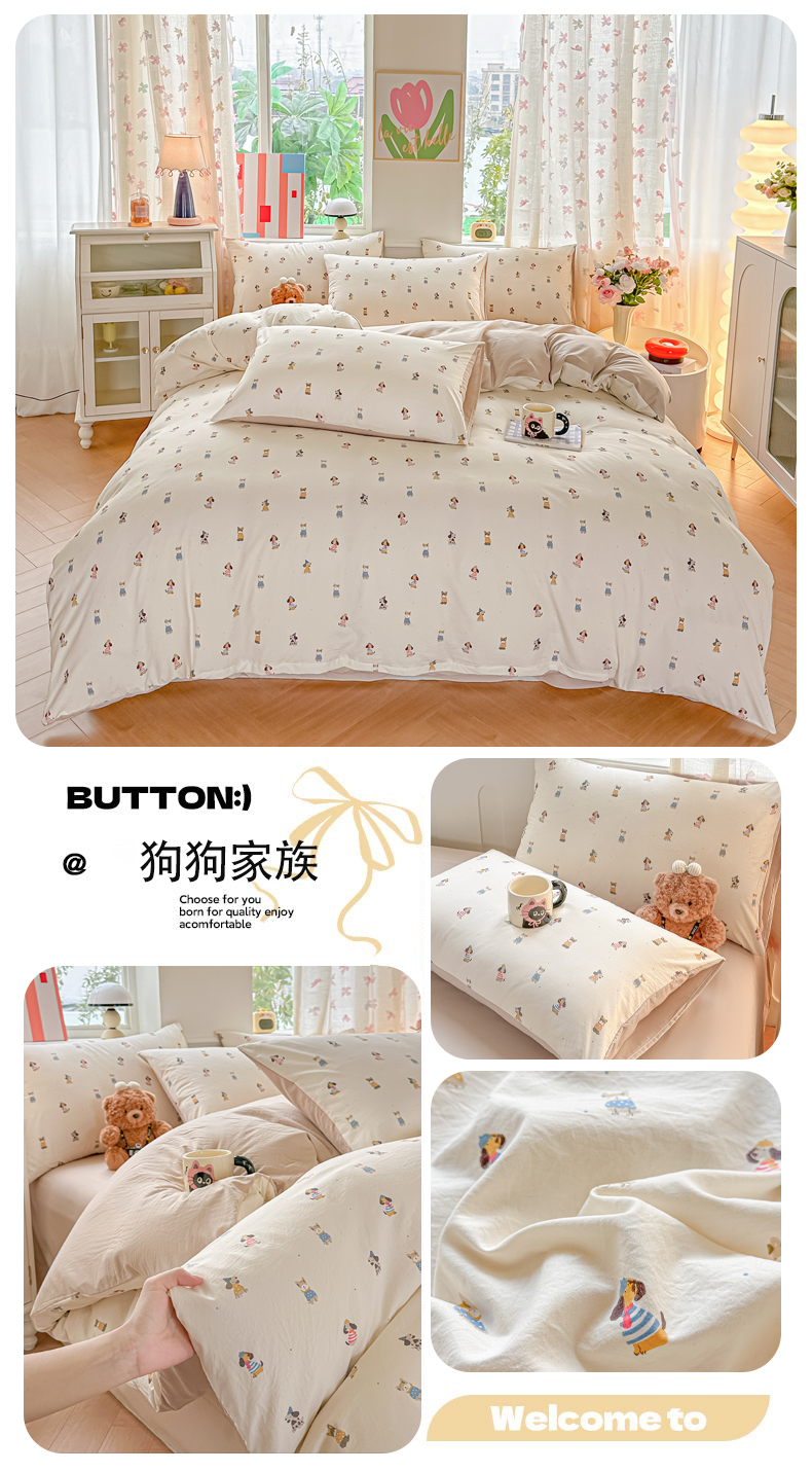 当前位置: 91家纺网 > 商品网购 > 床品套件 > 四件套 > 水洗棉四件套 > 斯卡诺家纺 2026新款春夏古法水洗仿棉云感纱四件套小布袋五件套 俏皮狗