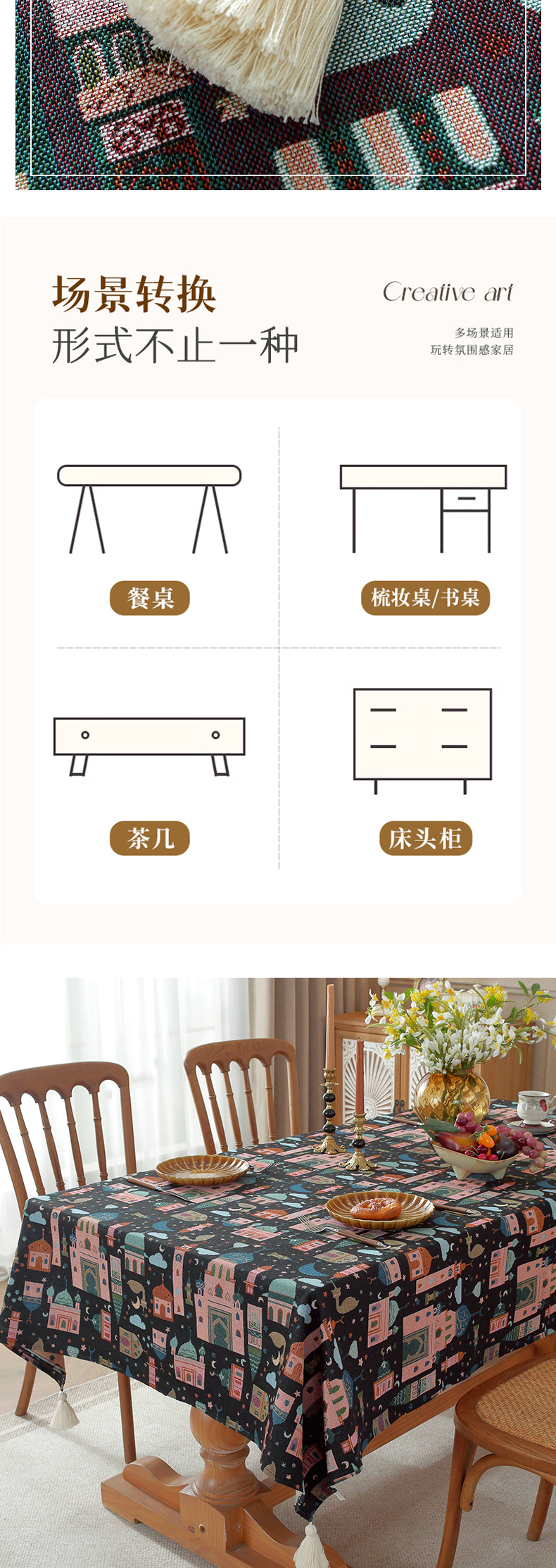 (总)南通大梧纺织 2026新款中东复古骆驼城堡窗花桌布,蓝底窗花星月,七彩城堡白,七彩城堡黑,沙漠骆驼白,沙漠骆驼黑