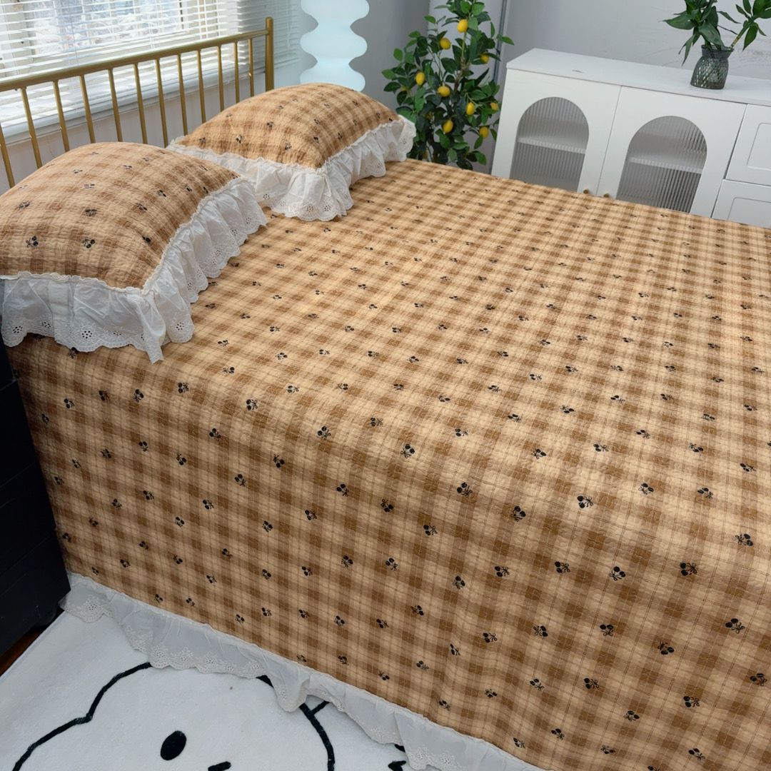 (总)暖居 2026新款大尺寸双层纱高温砂洗245X265床盖三件套,车厘子,粉绿格,洛璃,米妮,旺旺队,小丸子,樱桃可可,饼干熊,木马,小星星