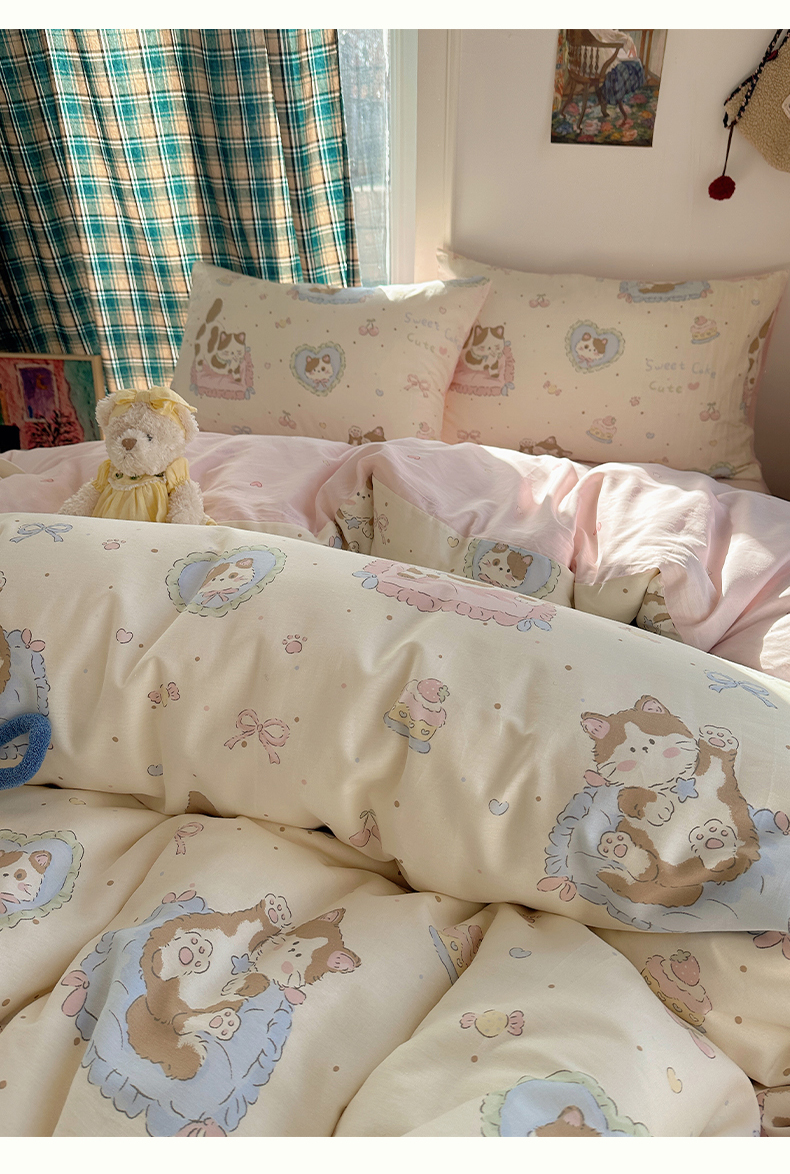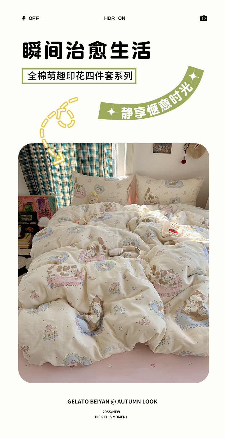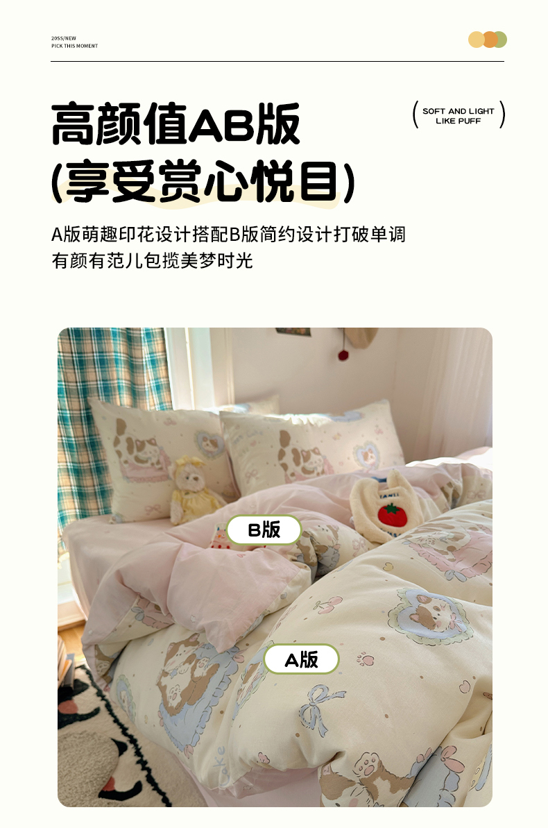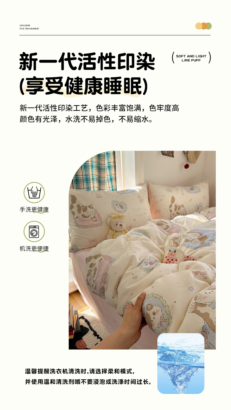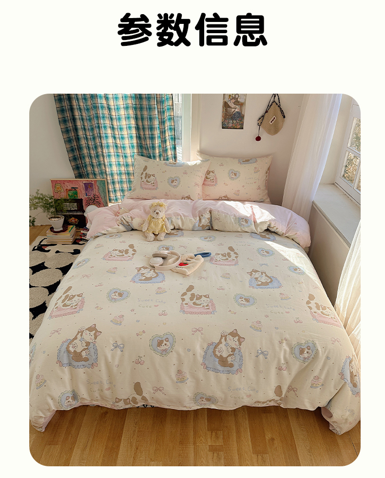 (总)瑞莱 2026新款A类全棉纯棉有氧双层纱四件套,白熊小姐,彩色木马,淡彩花笺,费尔岛小熊,焦糖奶汪-桔,焦糖奶汪-绿,萌星,苹果星星人,小樱桃,樱桃画报