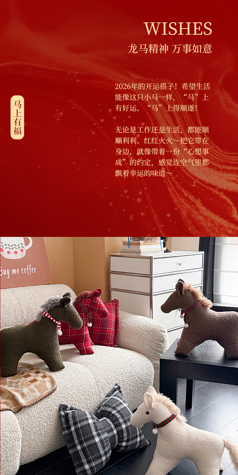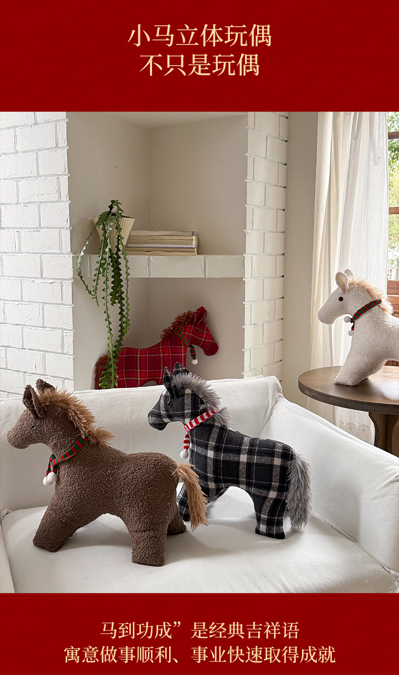 (总)美茉家居 2025新款小马立体玩偶抱枕,白马,红格子马,灰格子马,绿马,棕马
