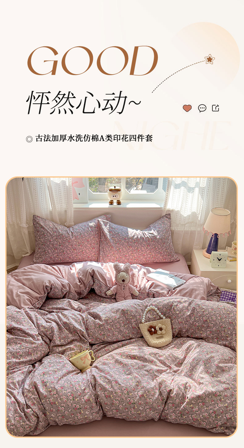 当前位置: 91家纺网 > 商品网购 > 床品套件 > 四件套 > 水洗棉四件套 > 优尚佳生活馆 【提供买家秀】2026新款加厚水洗仿棉A类印花四件套 旧枕玫香