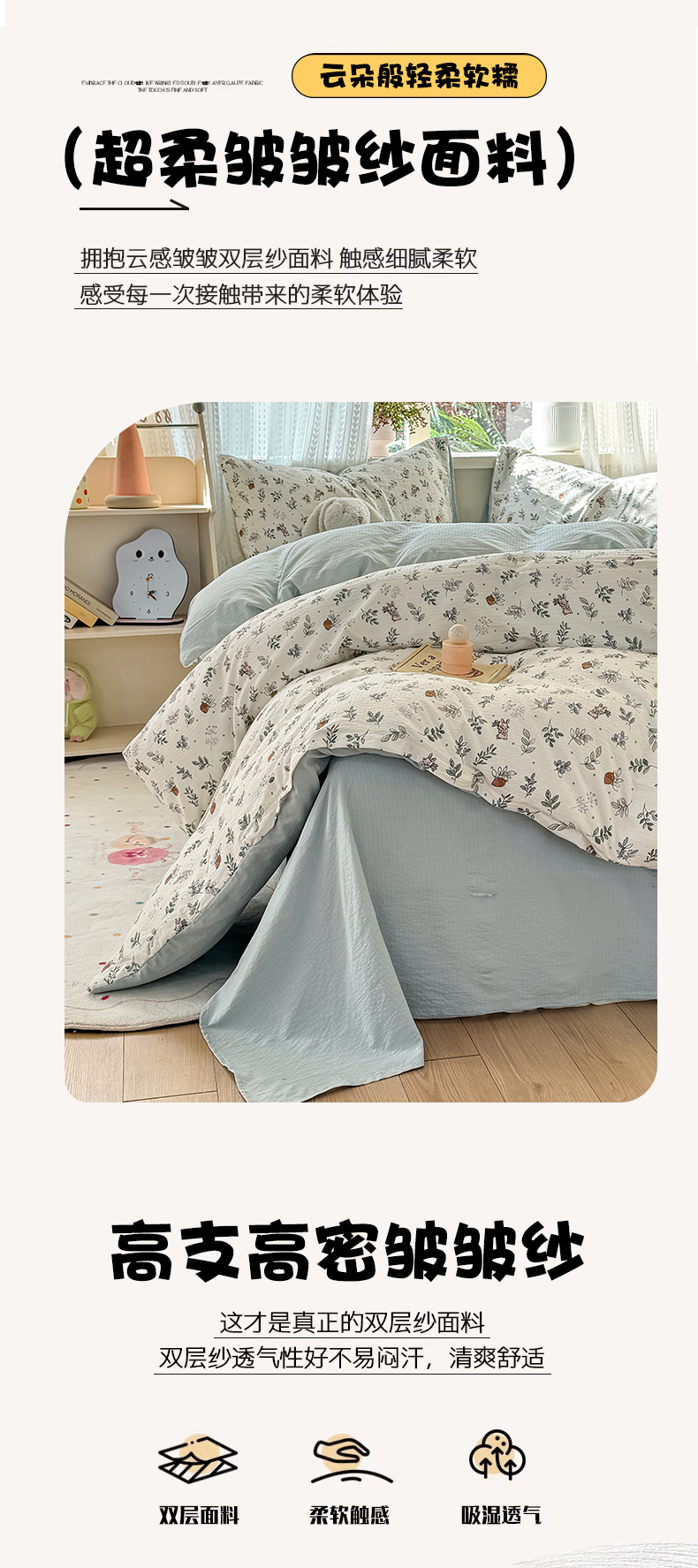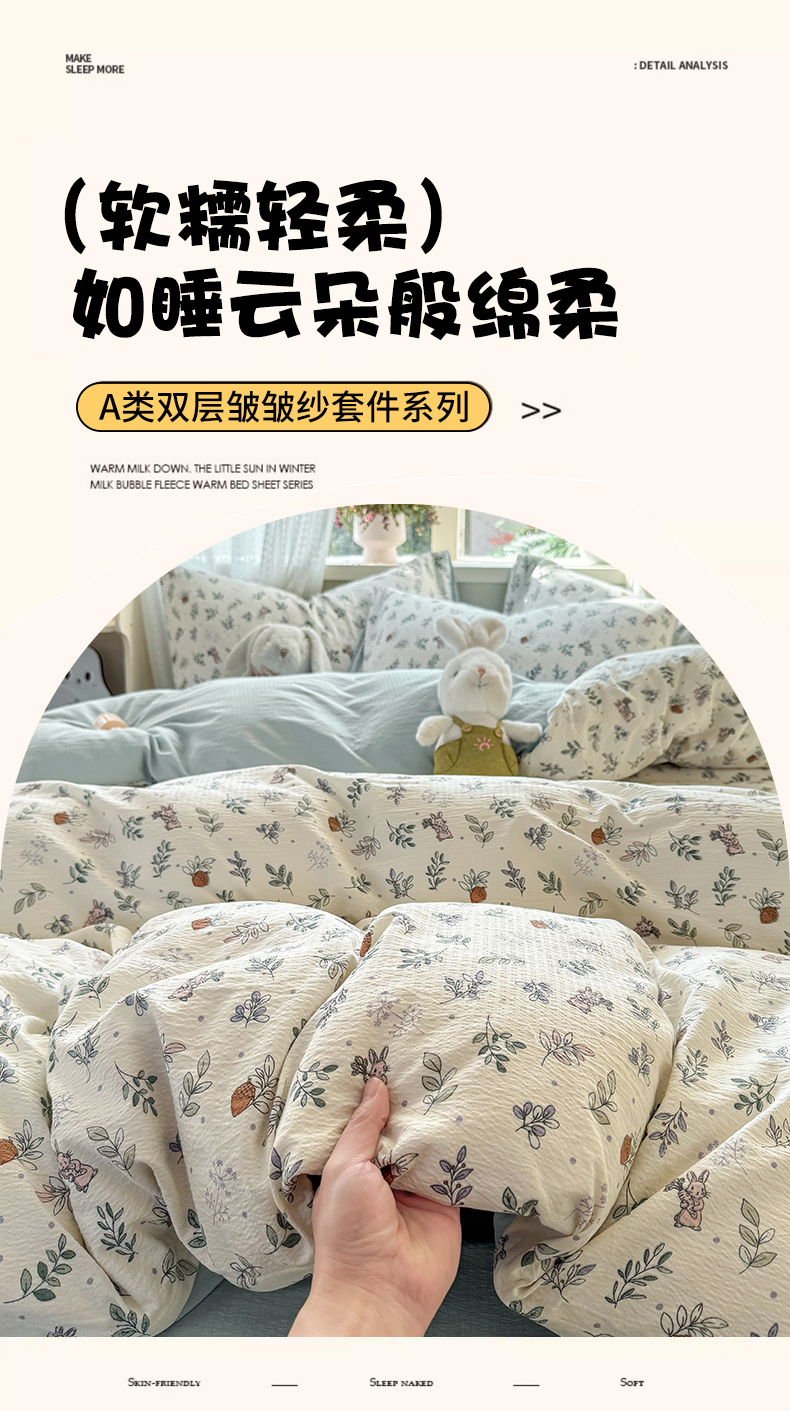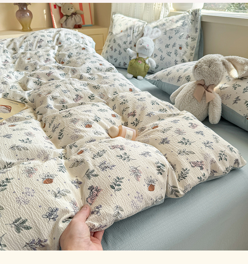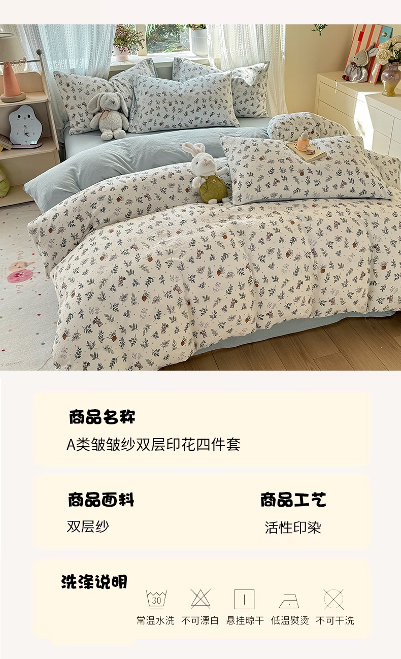 当前位置: 91家纺网 > 商品网购 > 床品套件 > 四件套 > 双层纱四件套 > 丽美人家纺 2026新款A类皱皱纱双层印花四件套 紫雾叶兔