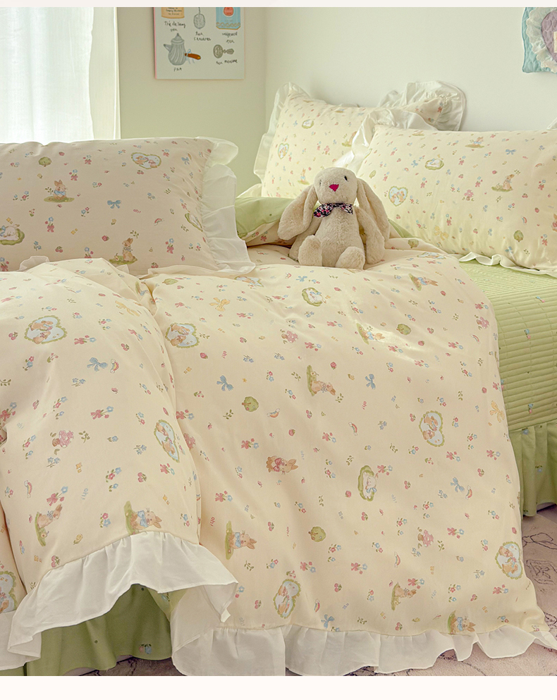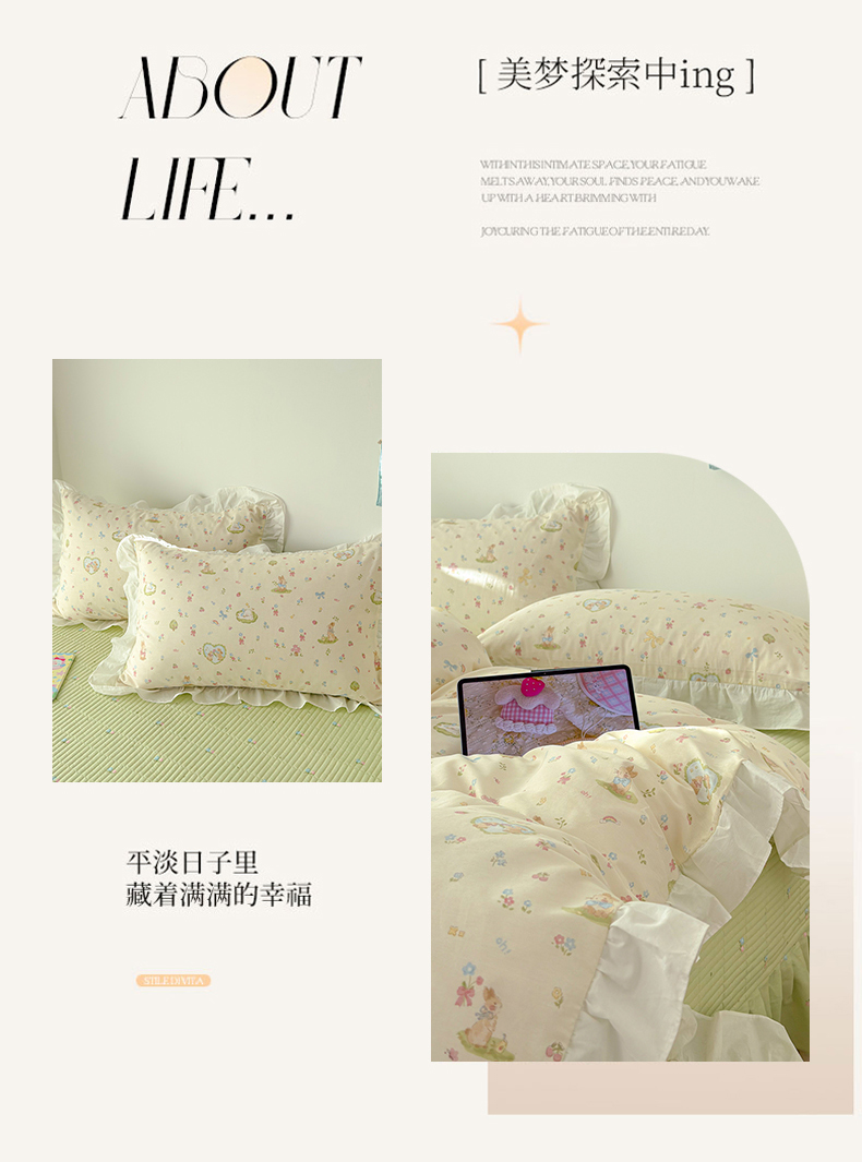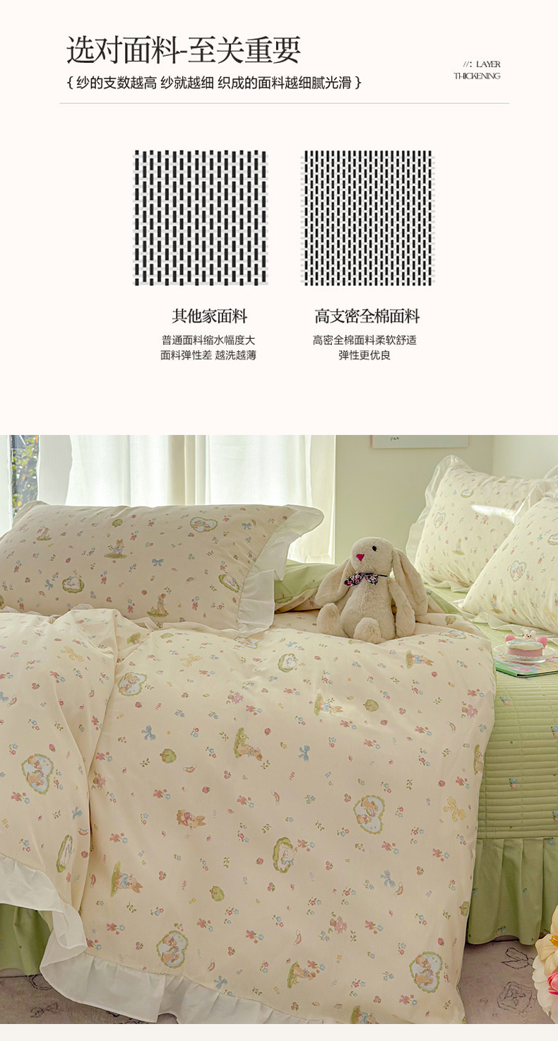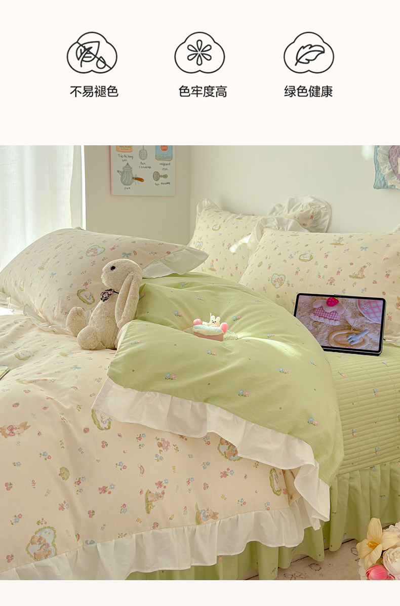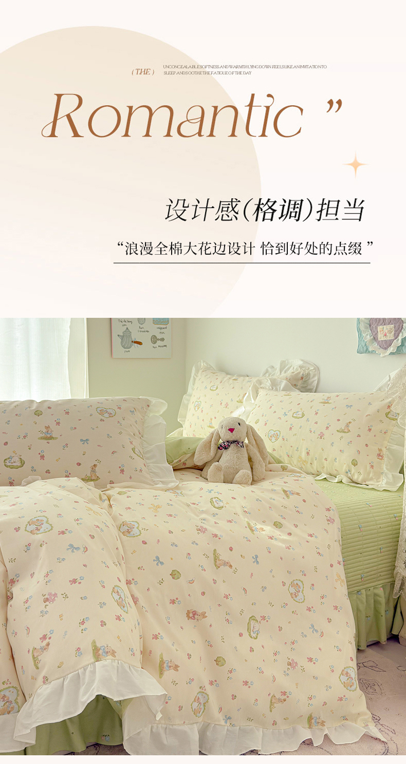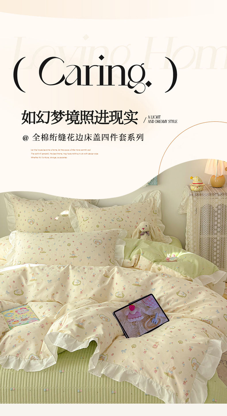 当前位置: 91家纺网 > 商品网购 > 床品套件 > 四件套 > 全棉普通四件套 > 女子家纺 2026新款全棉纯棉绗缝花边床盖四件套 兔与花笺