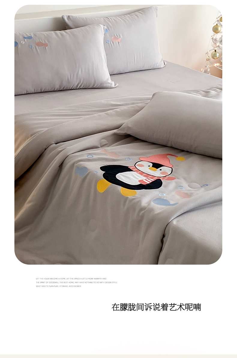 • 91家纺网 家纺一手货源 找家纺 鸣升家纺 2026新款全棉夏被双层纱贴布绣100%棉花夏被四件套 快乐企鹅-灰