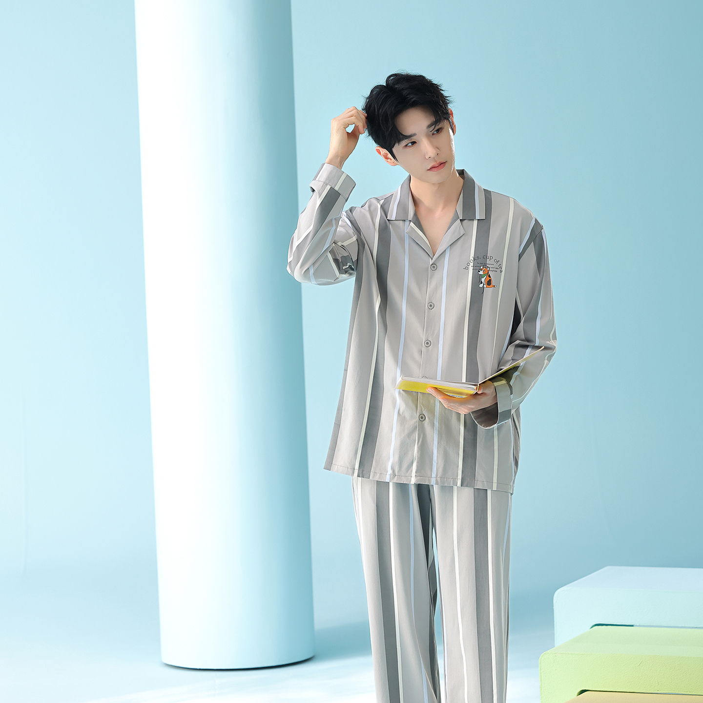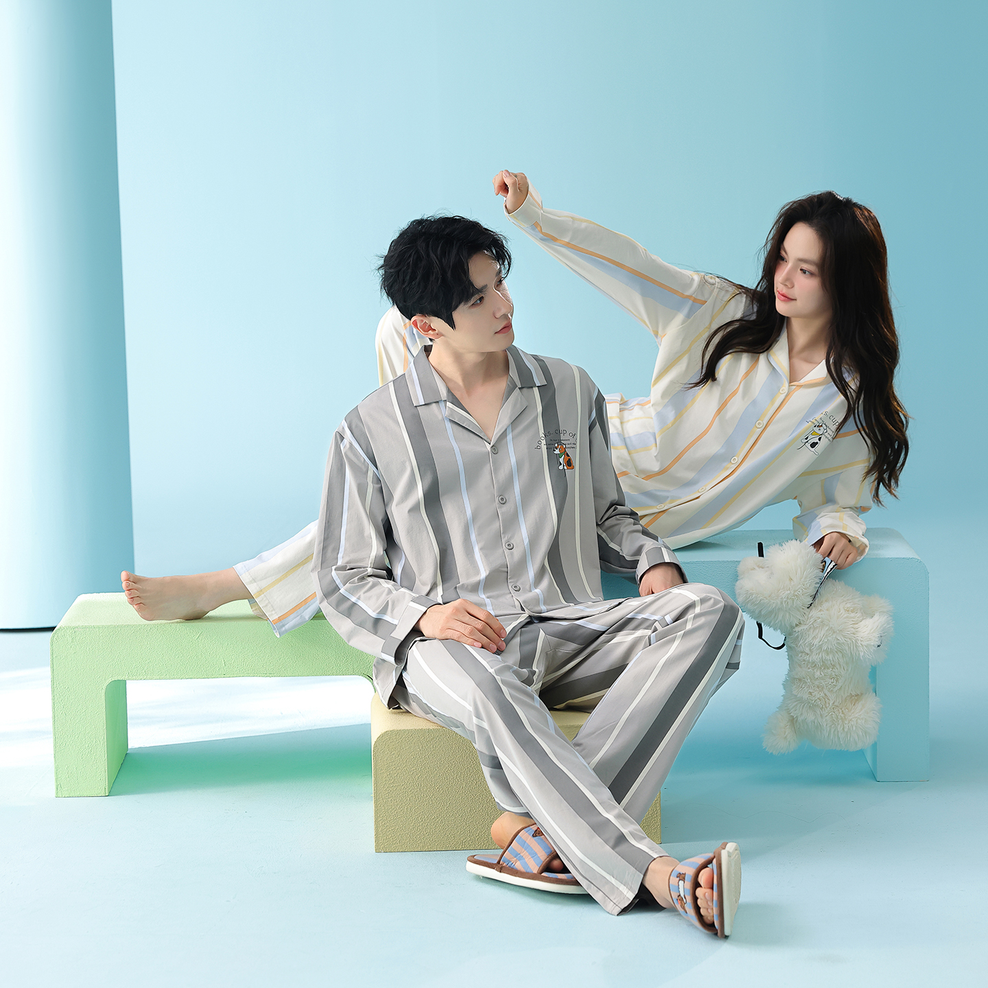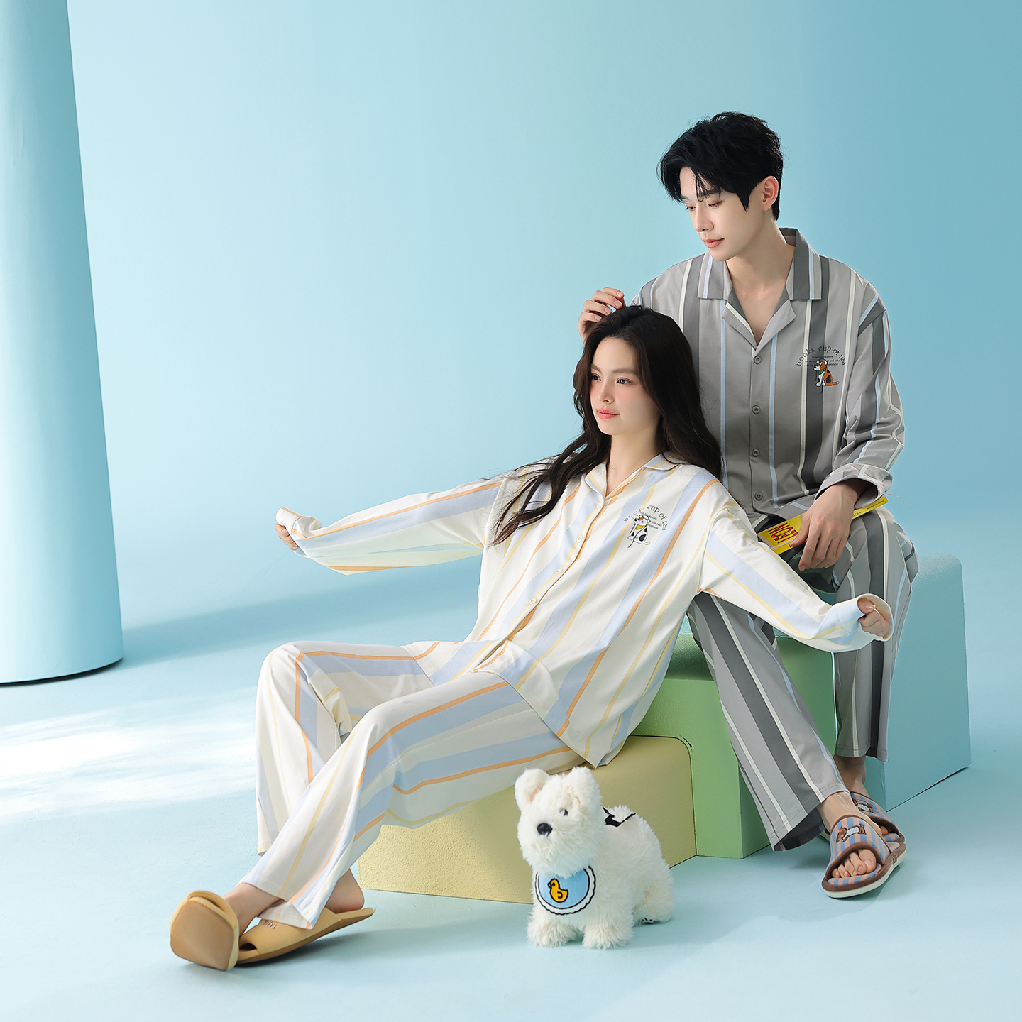 当前位置: 91家纺网 > 商品网购 > 居家日用 > 睡衣/家居服套装 > (总)妍景家居生活馆 2026新款新疆棉情侣款翻领撞色条纹小狗