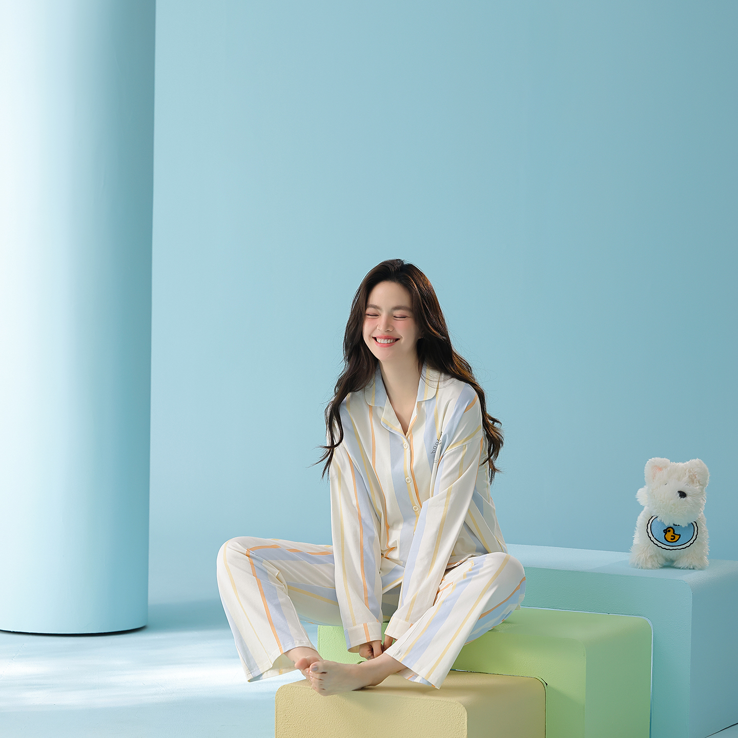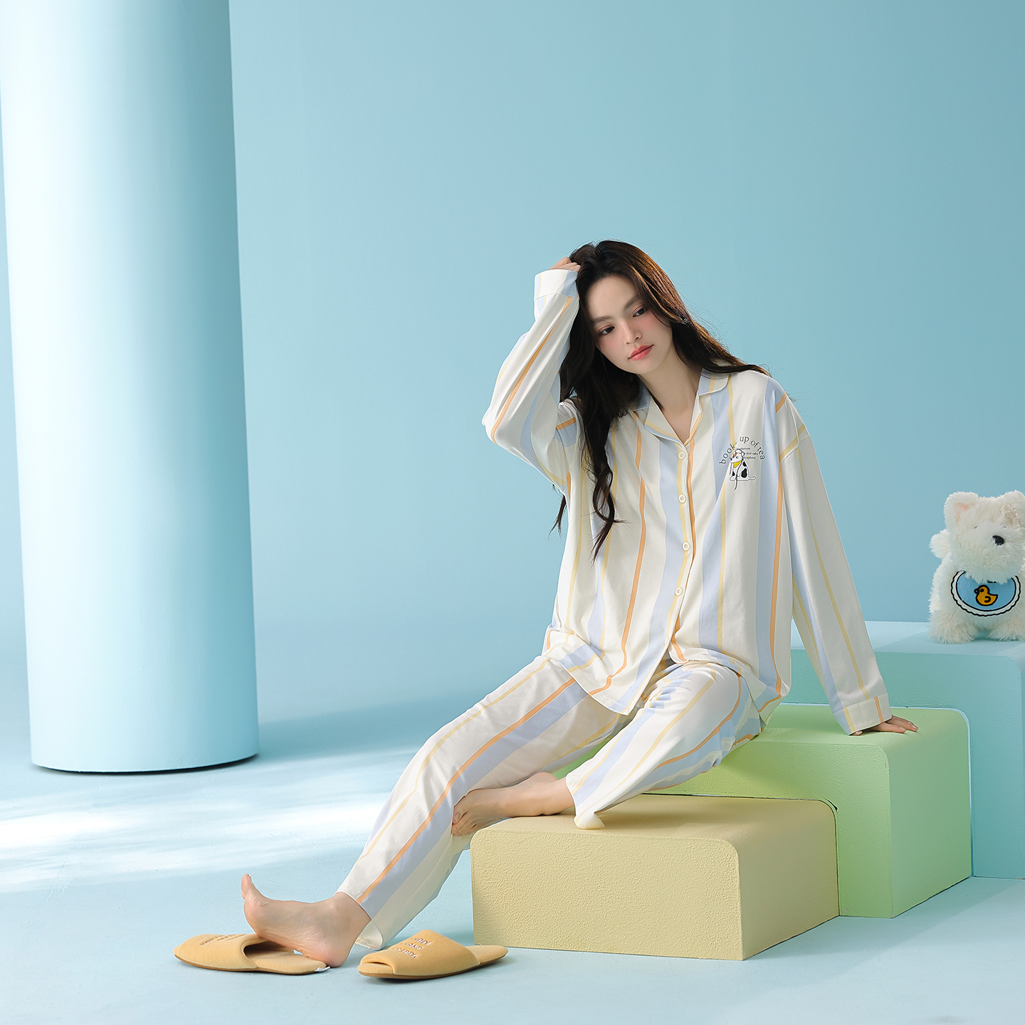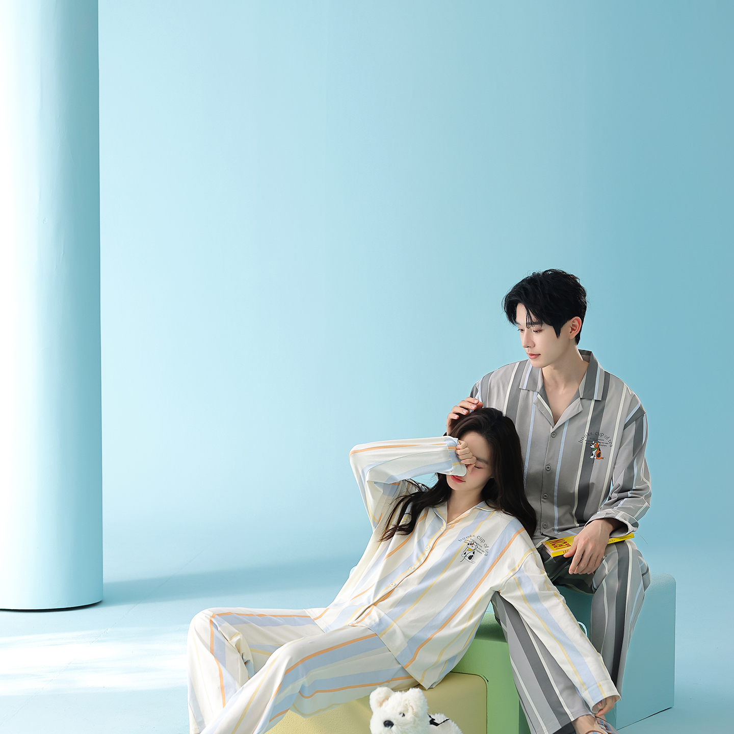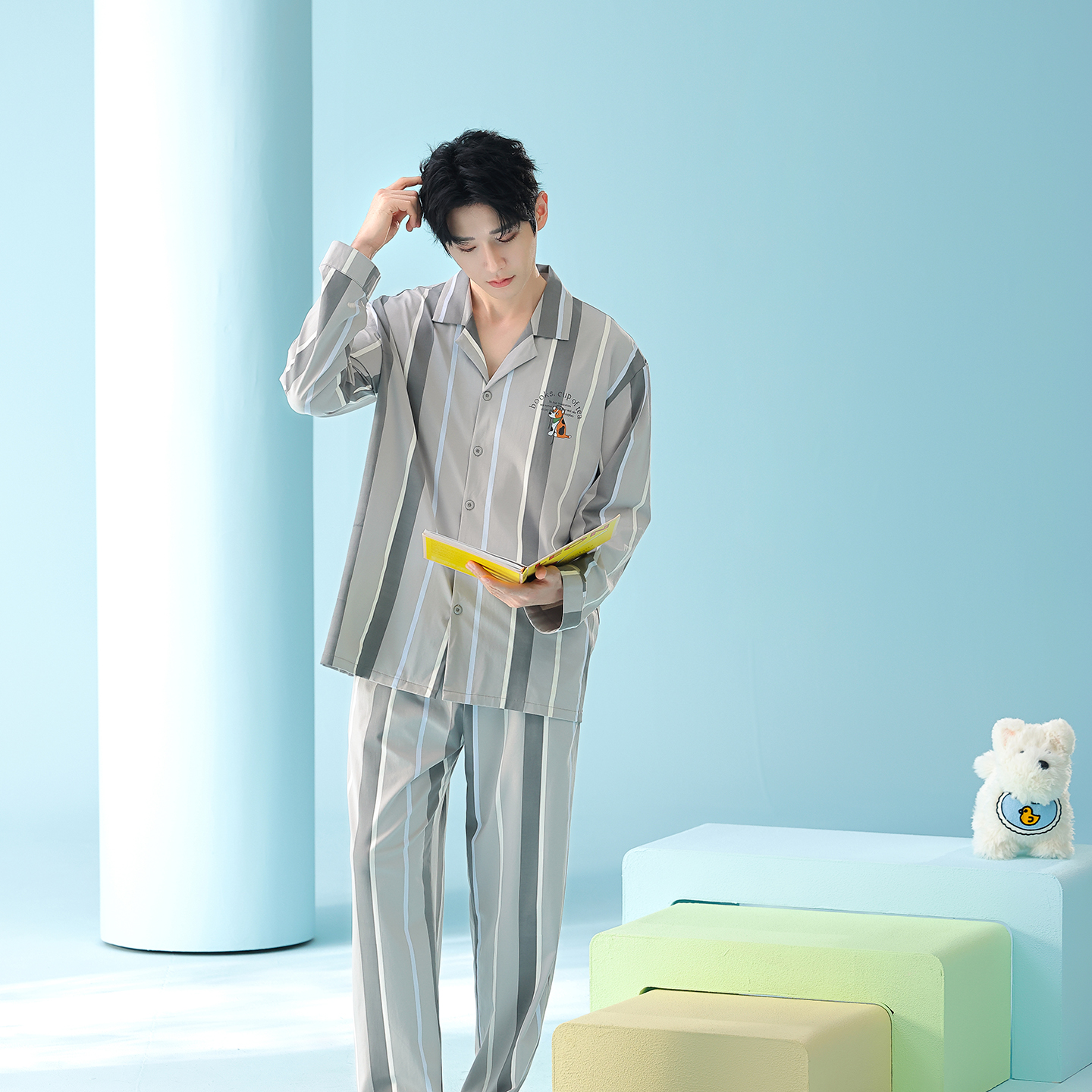 当前位置: 91家纺网 > 商品网购 > 居家日用 > 睡衣/家居服套装 > (总)妍景家居生活馆 2026新款新疆棉情侣款翻领撞色条纹小狗