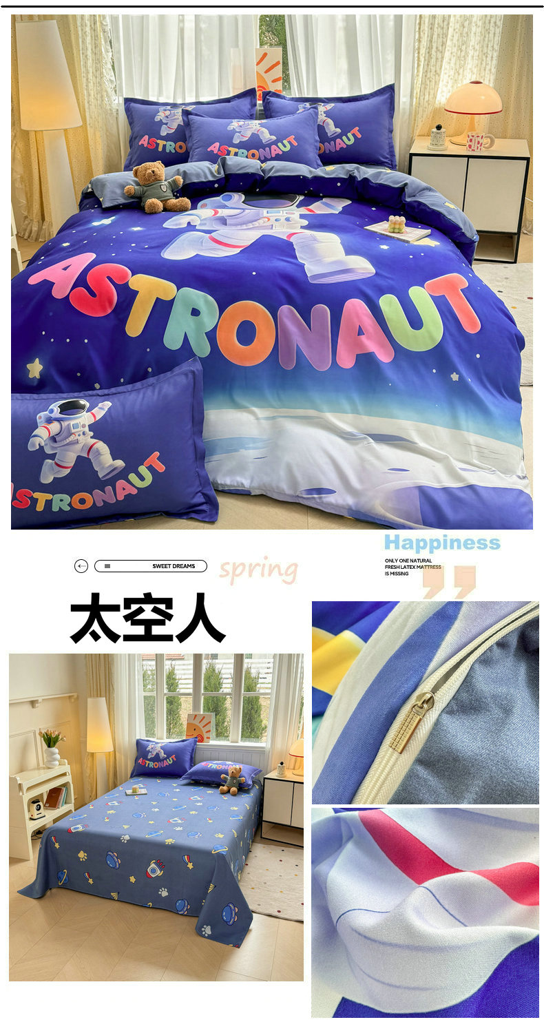 当前位置: 91家纺网 > 商品网购 > 床品套件 > 四件套 > 普通磨毛四件套 > 宝薇 2026春夏新款7D卡通加厚斜纹仿棉生态磨毛大版四件套 太空人