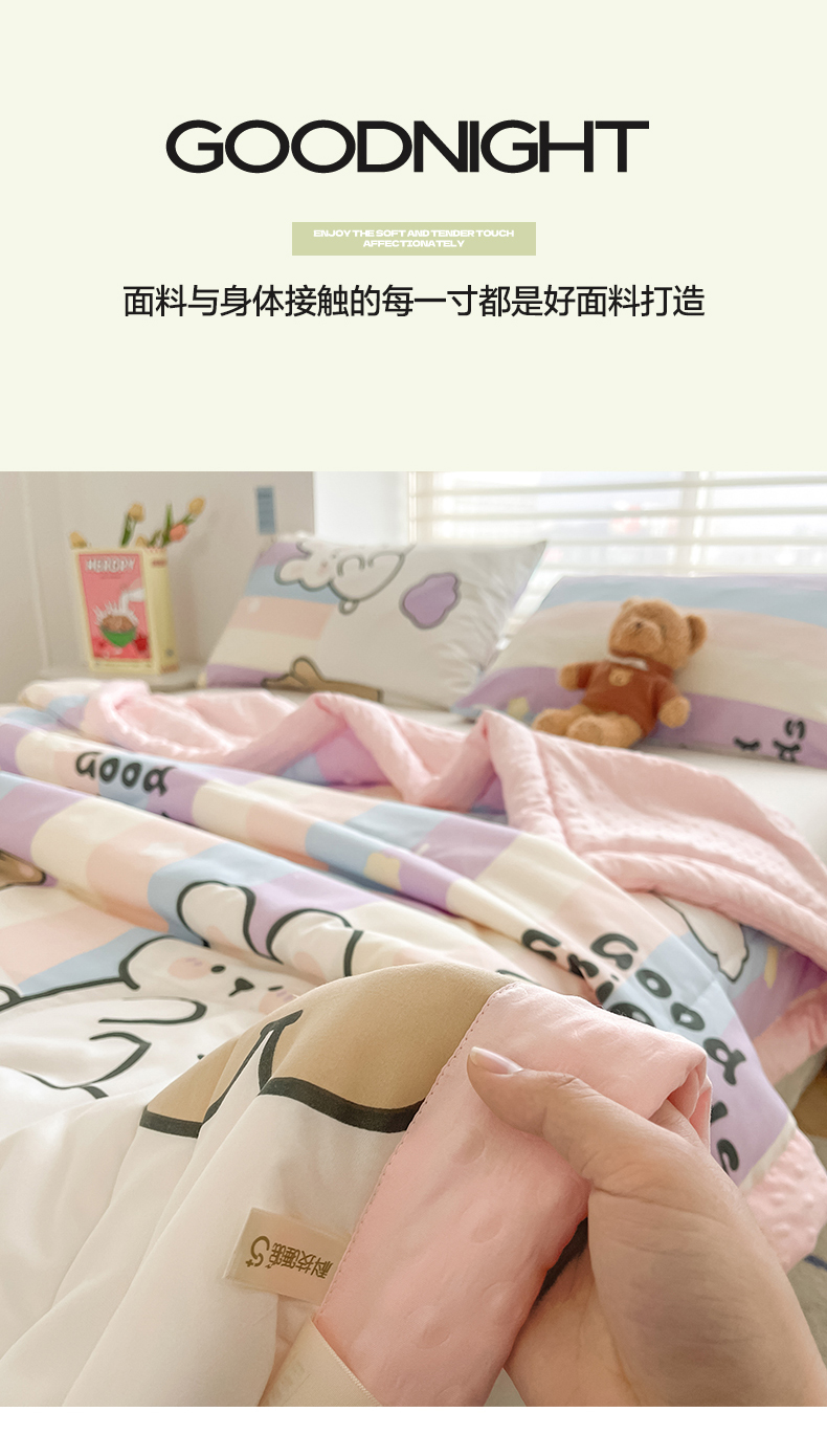 (总)悦织语 2026新款A类针织棉双层纱韩版夏被四件套空调被,甜心库洛,半亩花田,安琪拉兔,草莓熊,春日序,朵朵小花,绿色爱心,兔兔爱果子,晚安熊,希格文,小狗日记,紫风铃,紫萱