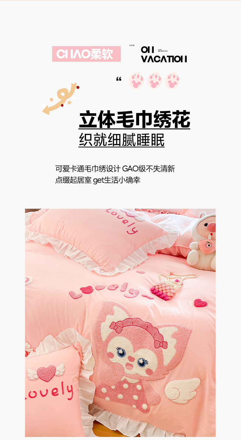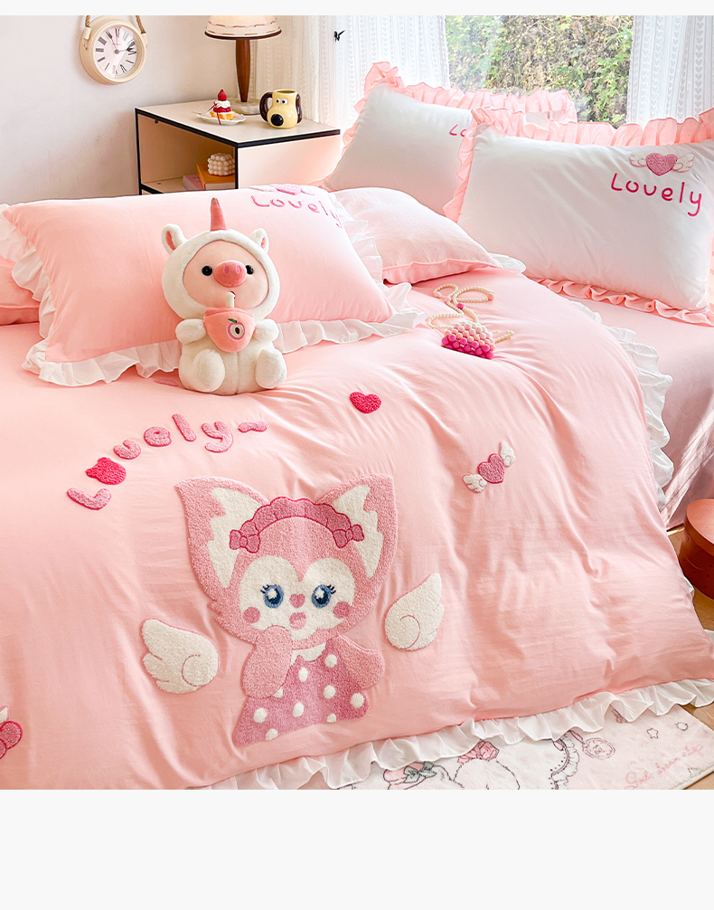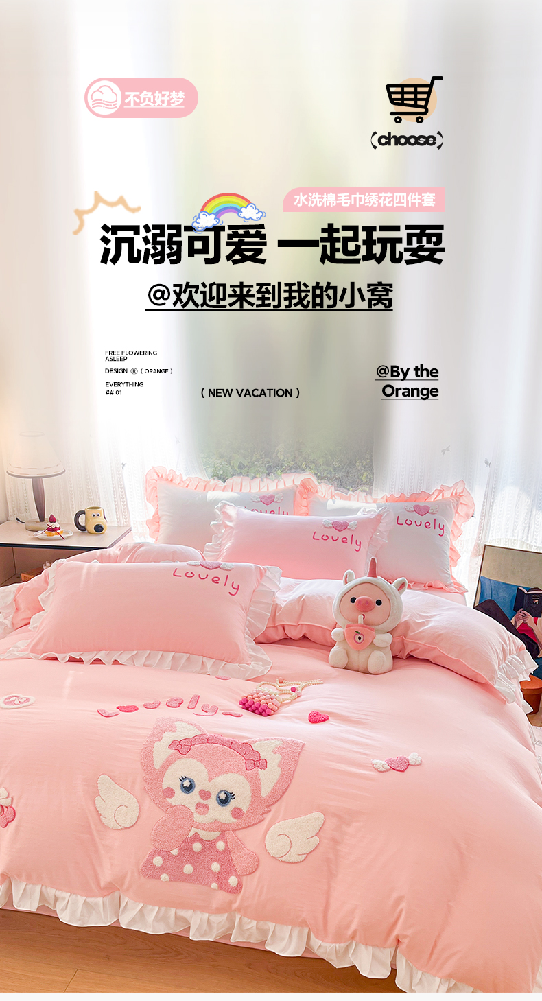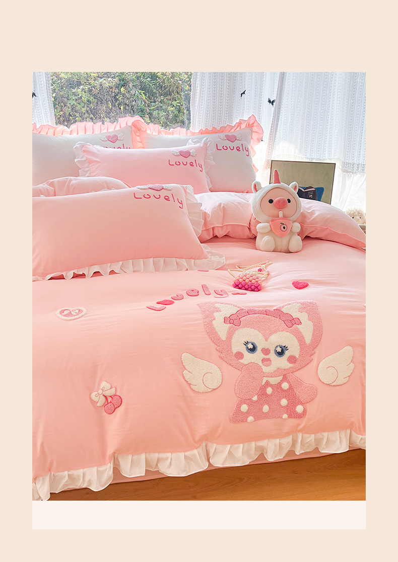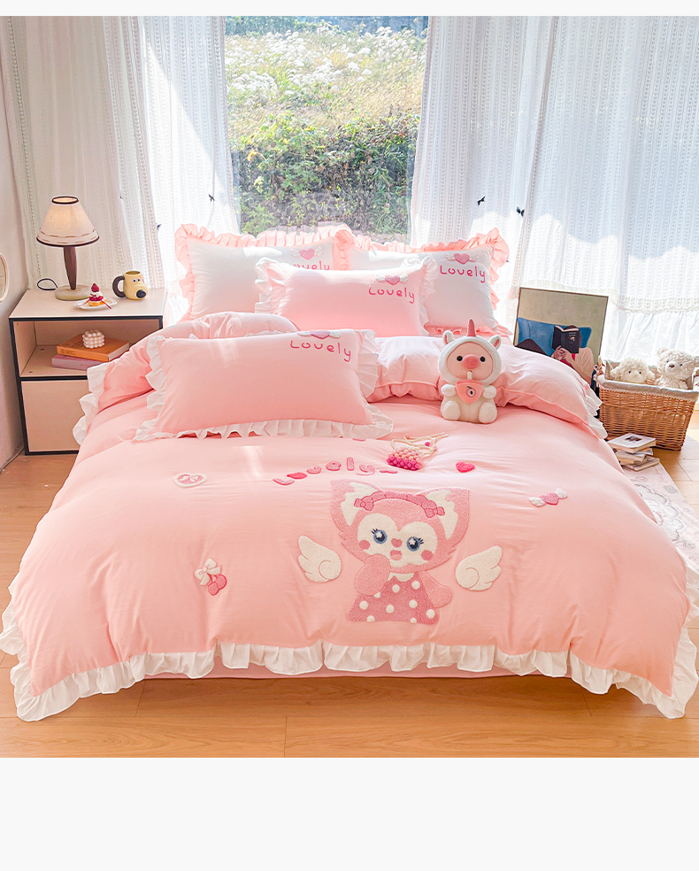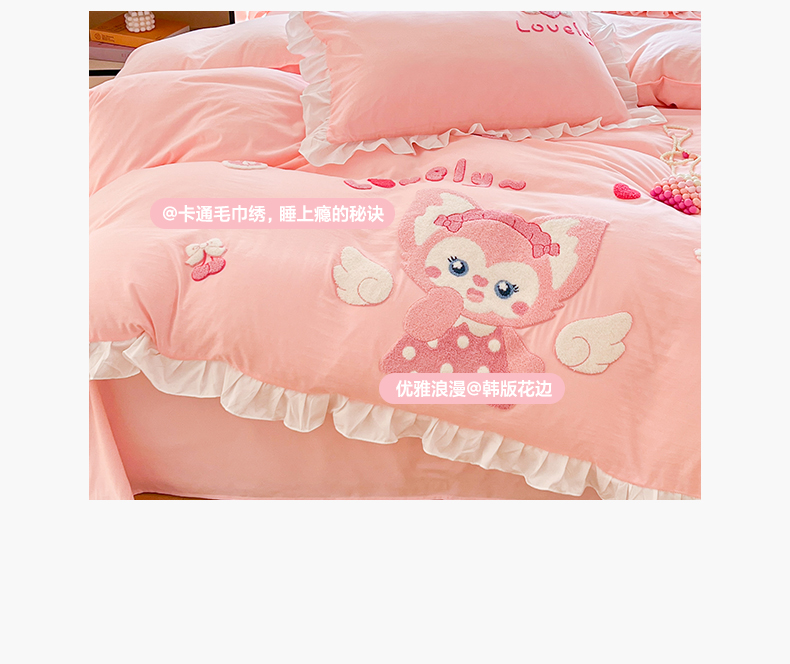 当前位置: 91家纺网 > 商品网购 > 床品套件 > 四件套 > 水洗棉四件套 > 泉欣家纺 2026新款网红可爱卡通 公主风毛巾绣花水洗棉四件套(专版花型) 风铃团团 粉玉