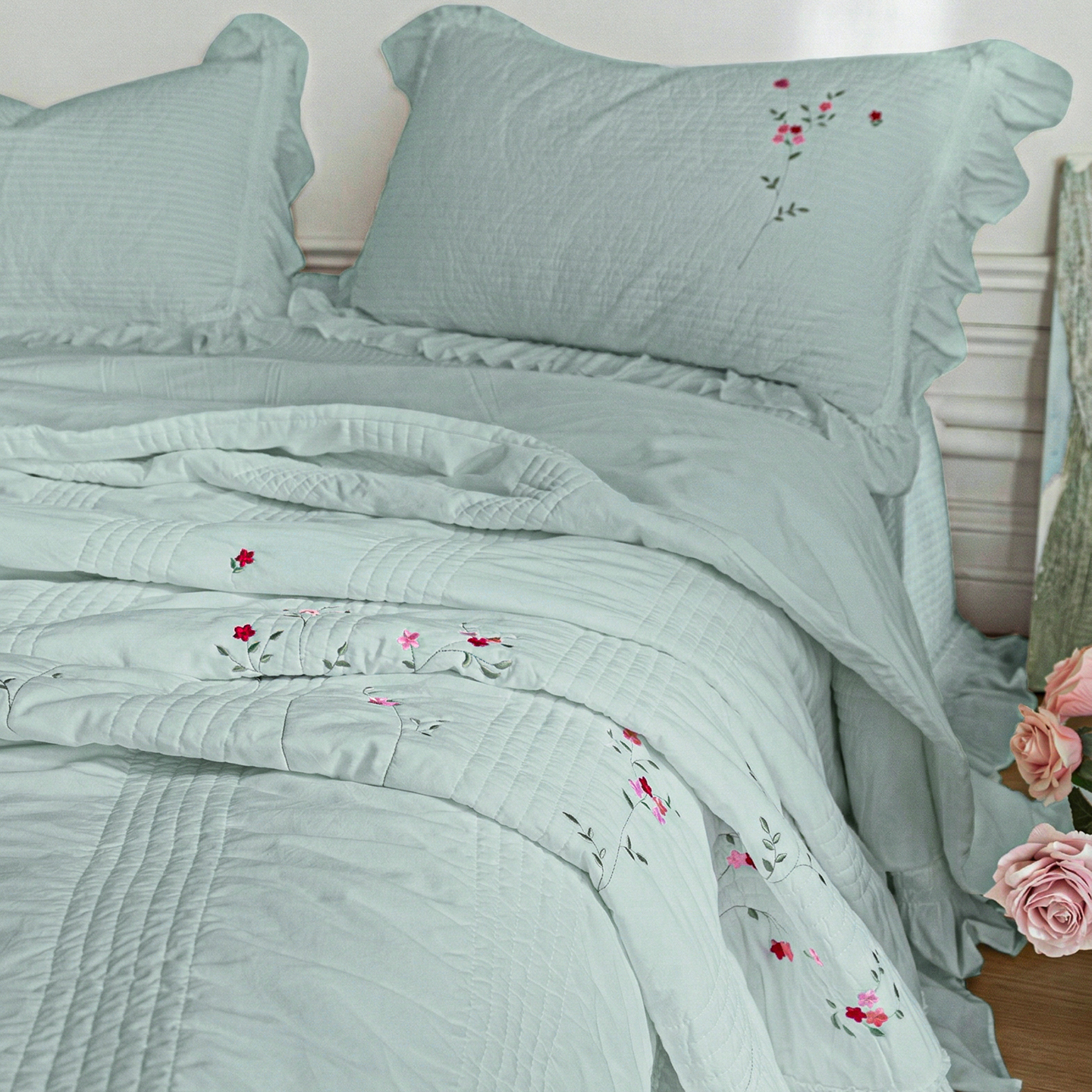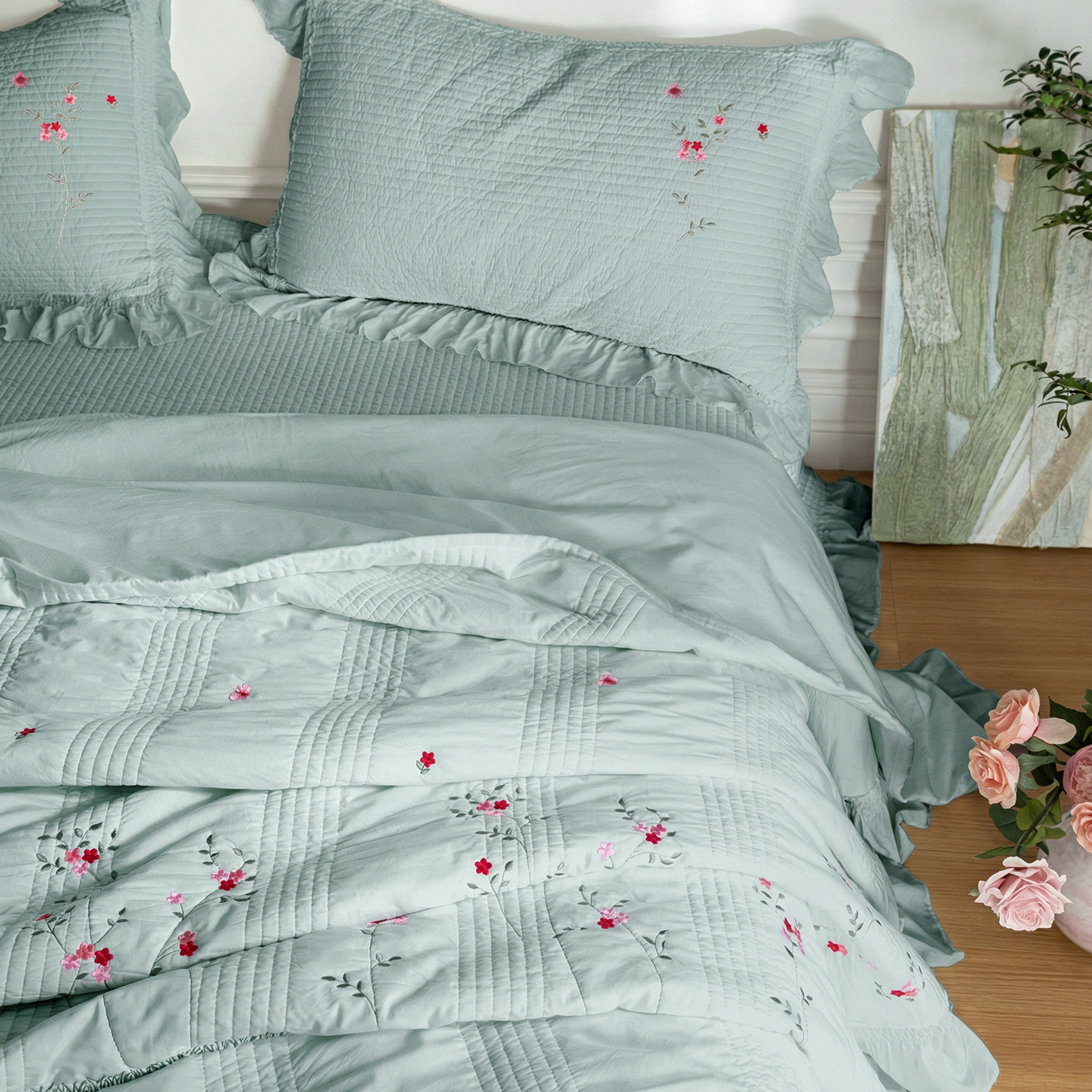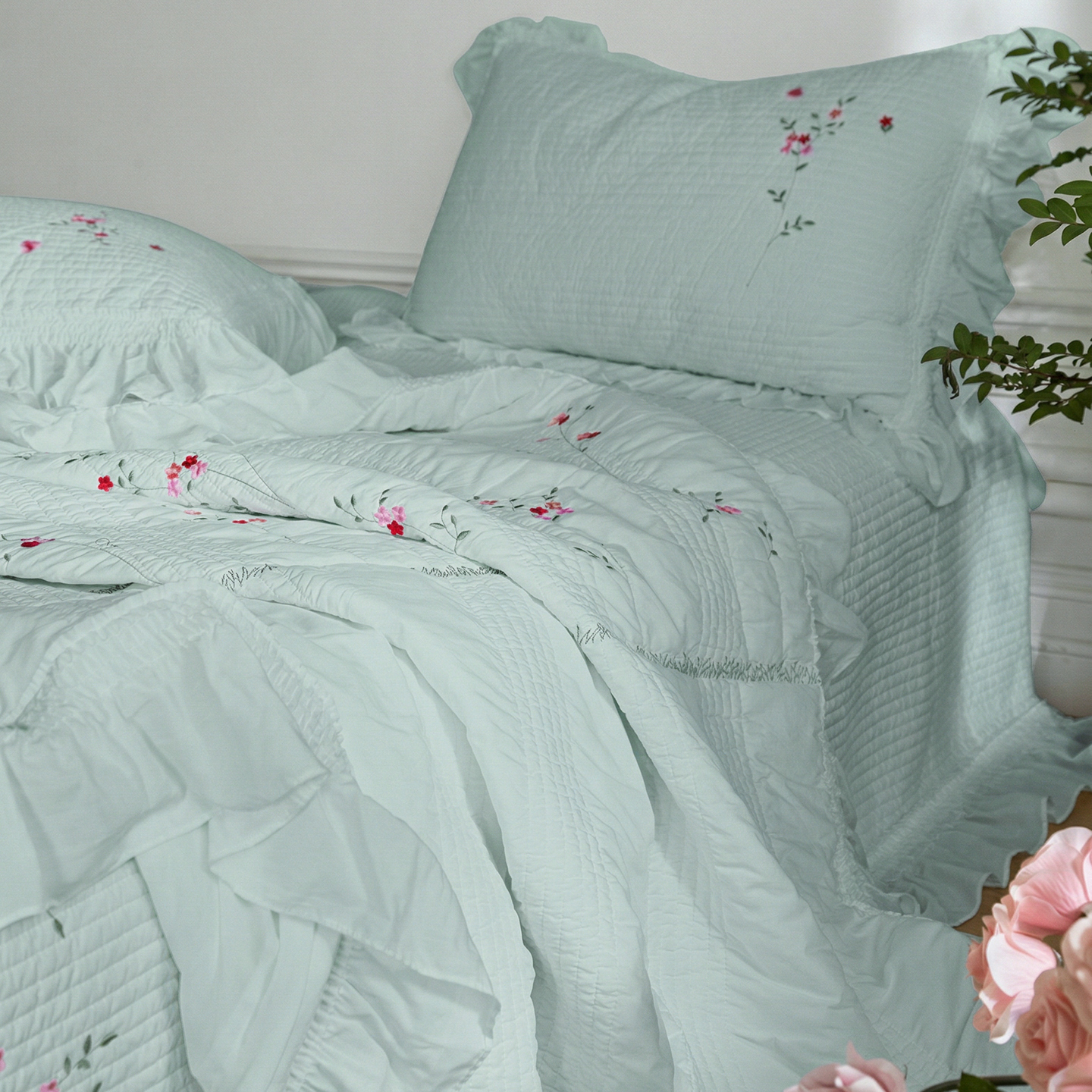 (总)上喜 2026新款棉麻小花刺绣款床盖多功能被子系列,麻本色,麻粉色
