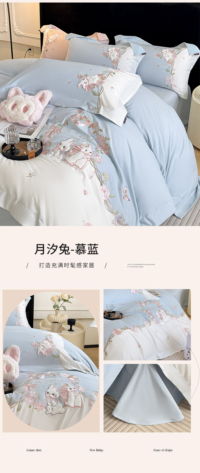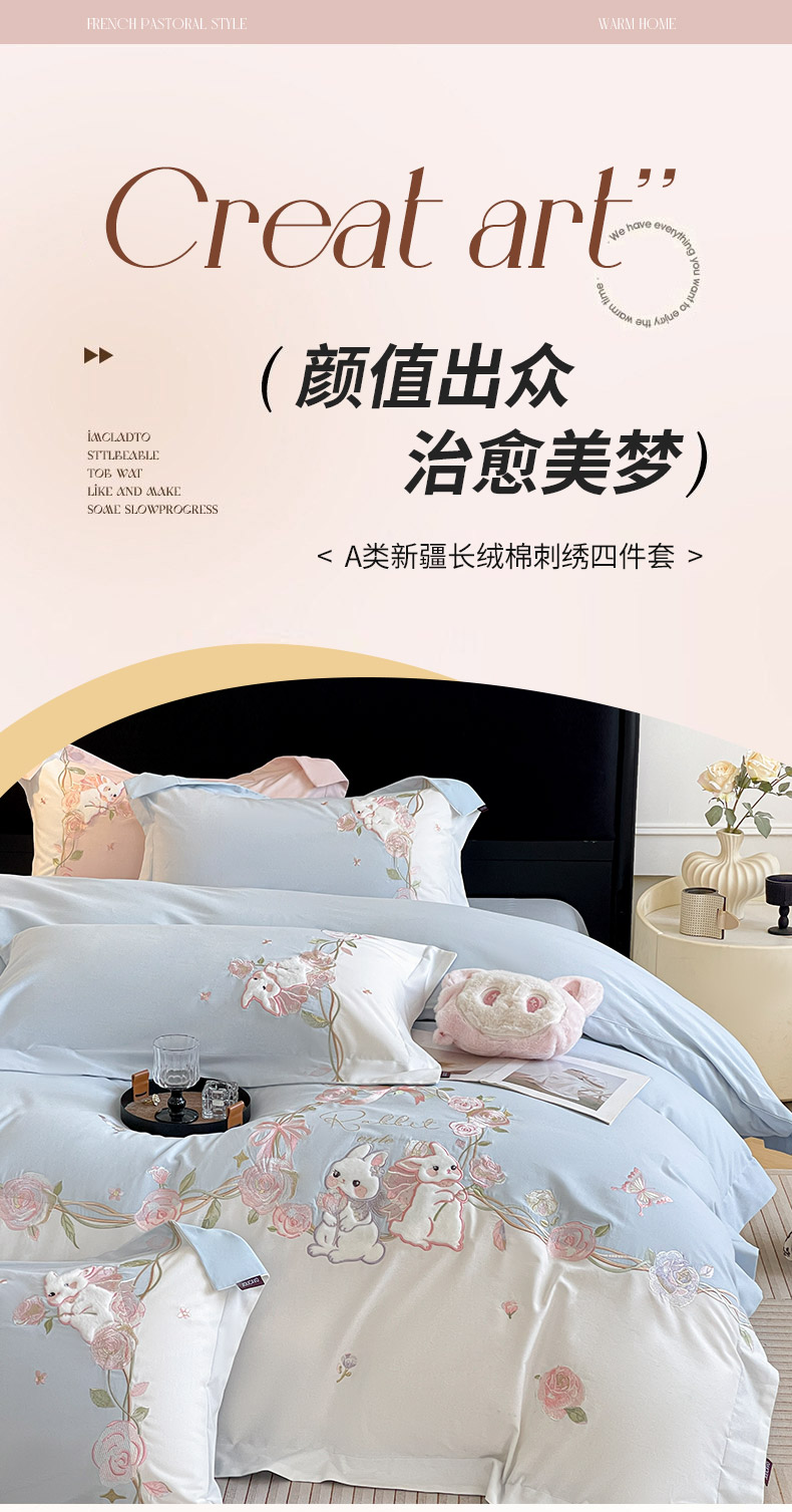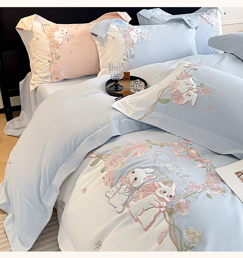 当前位置: 91家纺网 > 商品网购 > 床品套件 > 四件套 > 全棉普通四件套 > 爱妮菲家纺 2026爆款新品少女心A类100支长绒棉纯棉四件套全棉刺绣兔子被套床单床笠公主风 月汐兔-慕蓝
