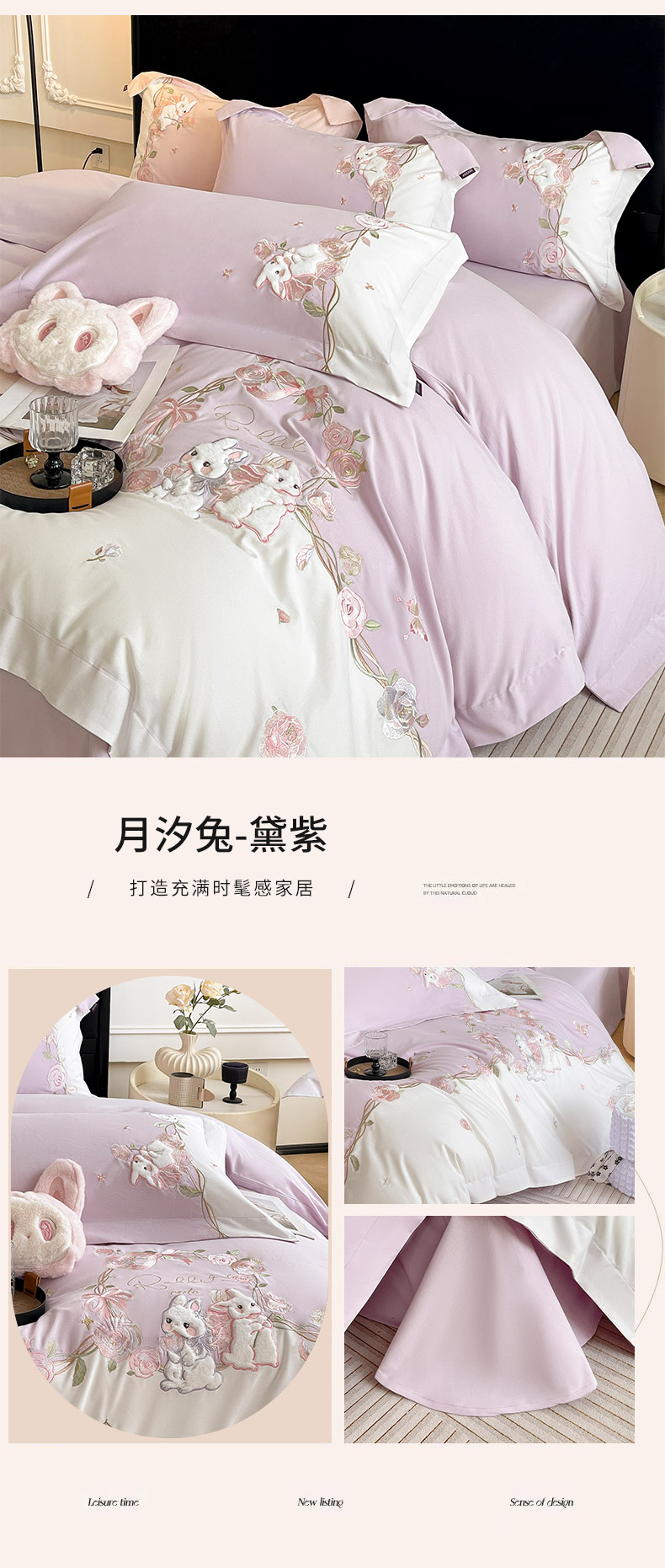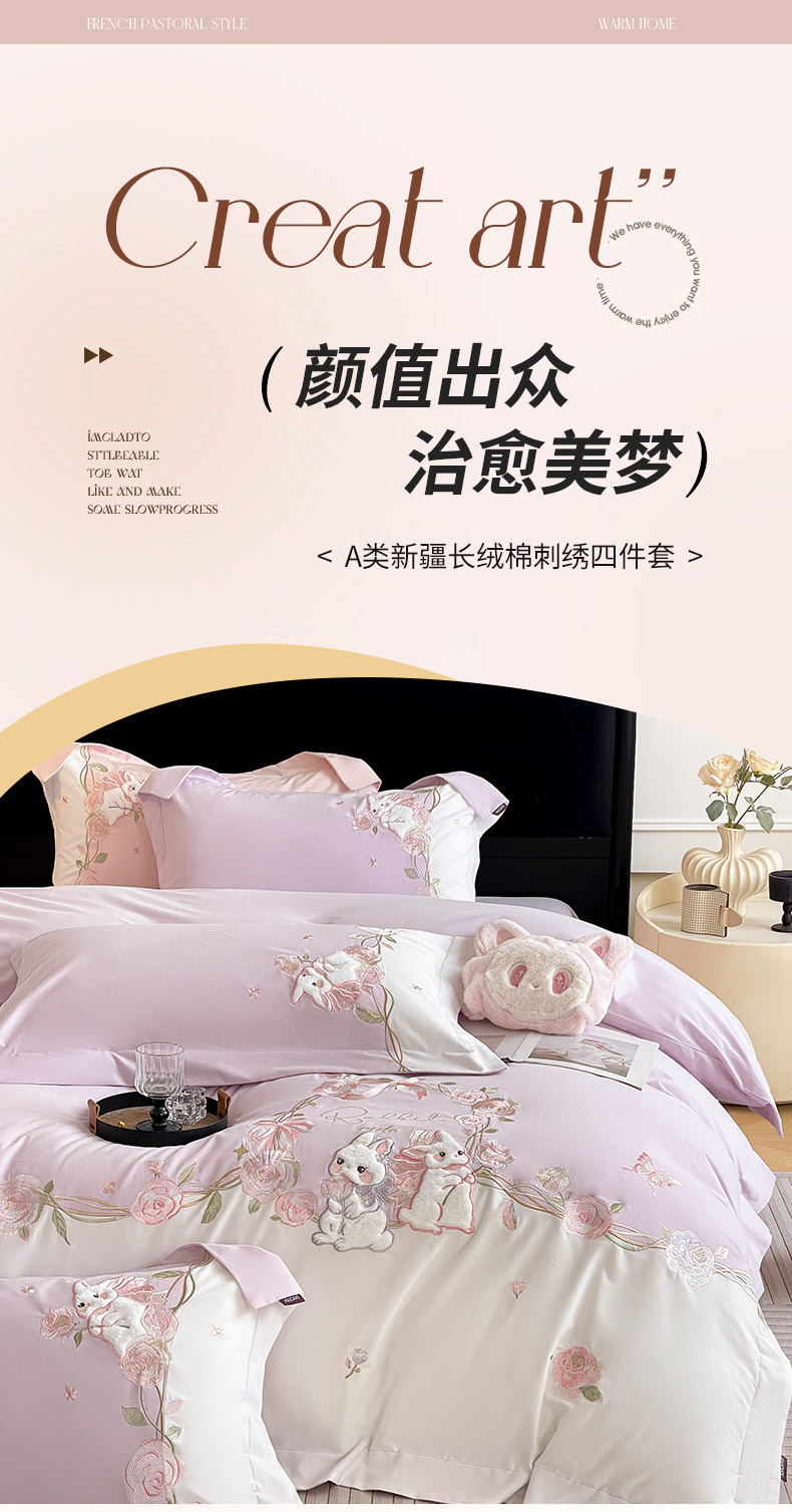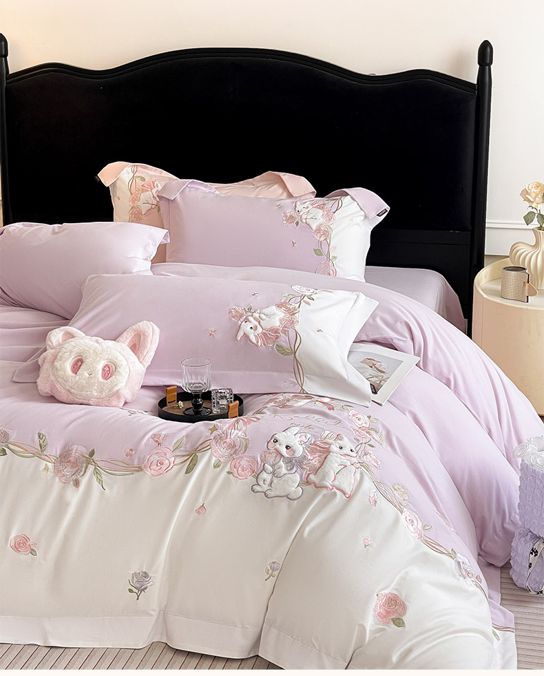 当前位置: 91家纺网 > 商品网购 > 床品套件 > 四件套 > 全棉普通四件套 > 乔利卡沃 2026爆款新品少女心A类100支长绒棉纯棉四件套全棉刺绣兔子被套床单床笠公主风 月汐兔-黛紫
