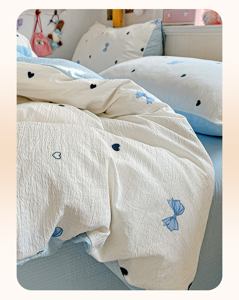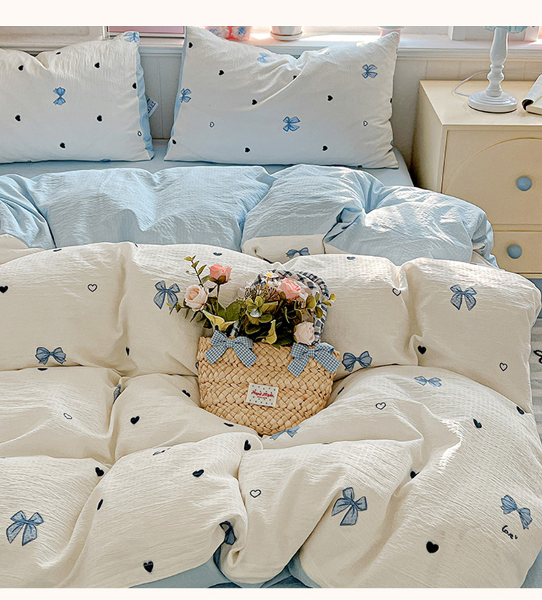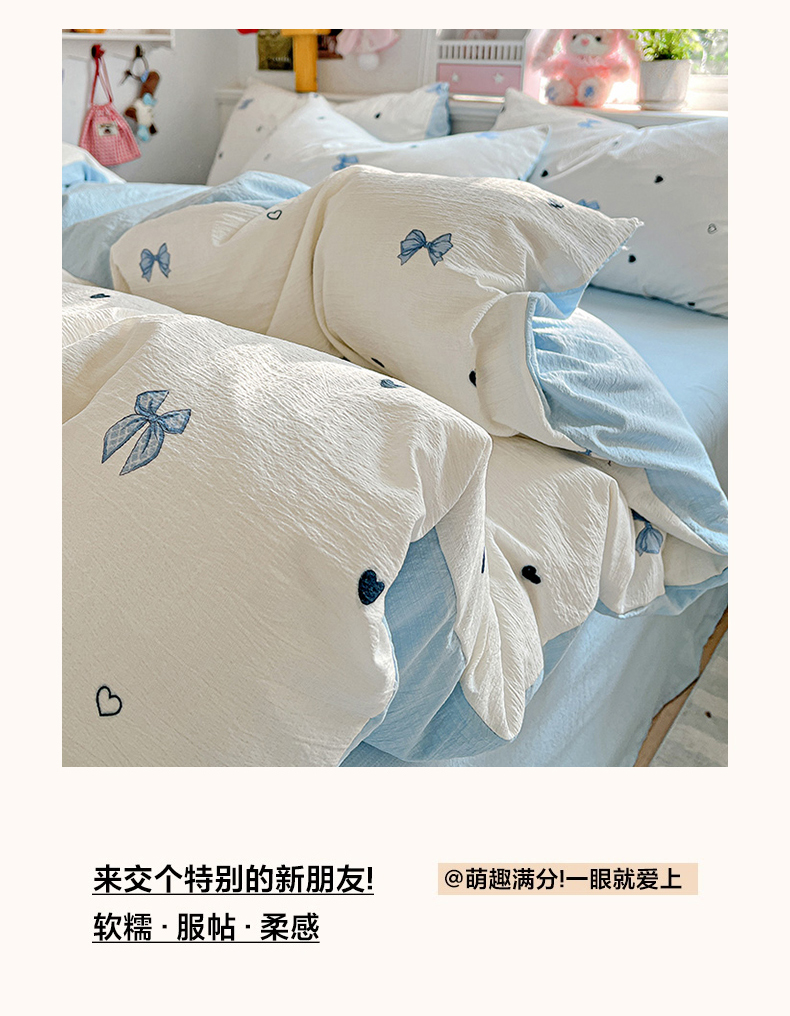 商品名称:朵朵家纺 2026新款高级感轻奢复古美拉德色系双层纱泡芙棉床品四件套加厚水洗双层纱软 奶蓝甜结