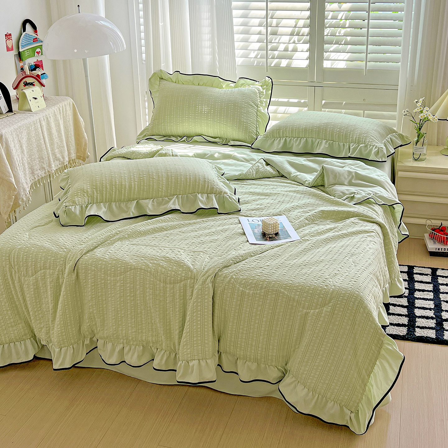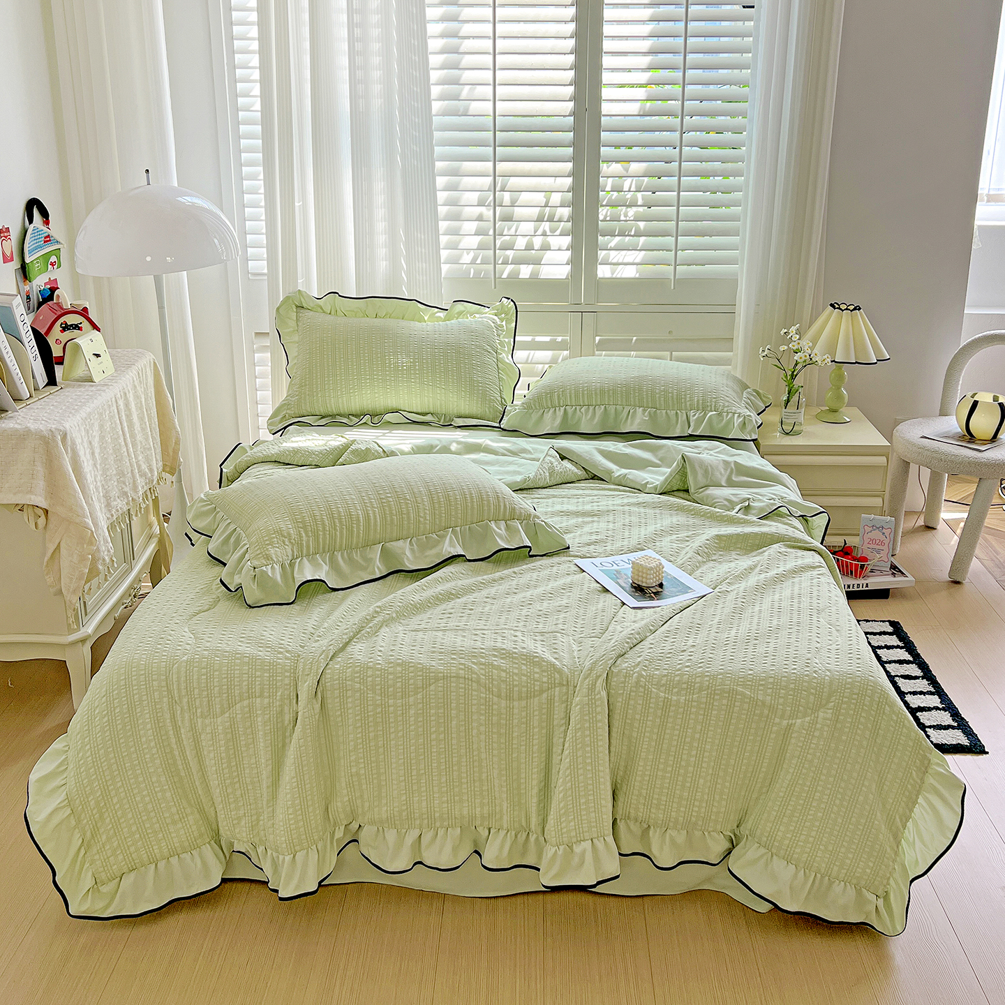 (总)一比一 2026新款云感皱皱双层纱四件套-全棉花边款【控价99元销售】,半夏绿,百福蓝,薄荷微凉,春风里,春晓,豆蔻,蝴蝶梦,可颂,兰黛,山野栀子,素颜,太妃糖,心动,遇见,芝士奶酪,紫爱心,紫苏,花园兔,蜡笔画,小黑兔,白茶-绿,初恋,莱茵河畔,桃花诺