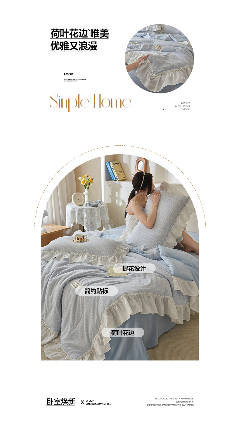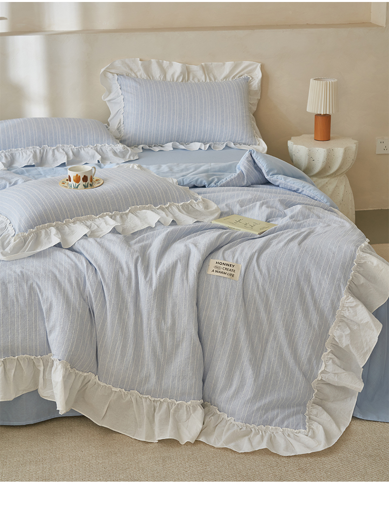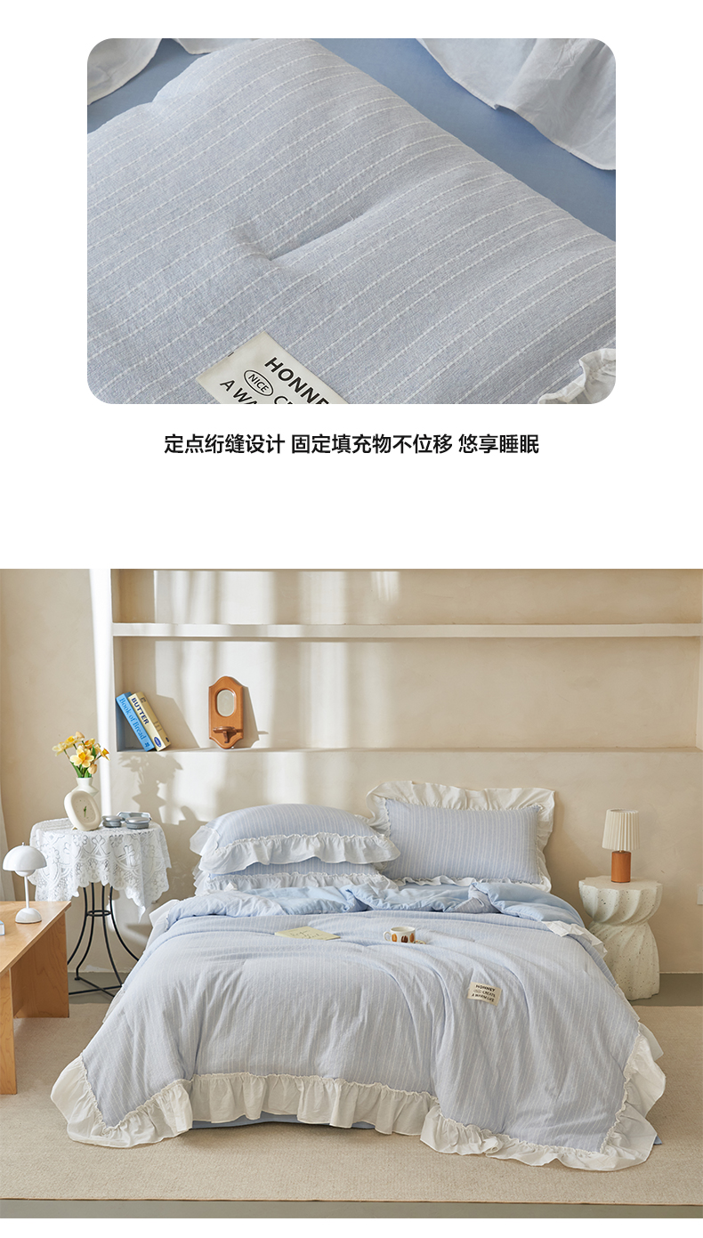 当前位置: 91家纺网 > 商品网购 > 床品套件 > 四件套 > 夏被四件套 > 晨曦家纺 2026新款荷叶花边泡芙纱提花夏凉被四件套可水洗棉夏被四件套少女风 海盐蓝