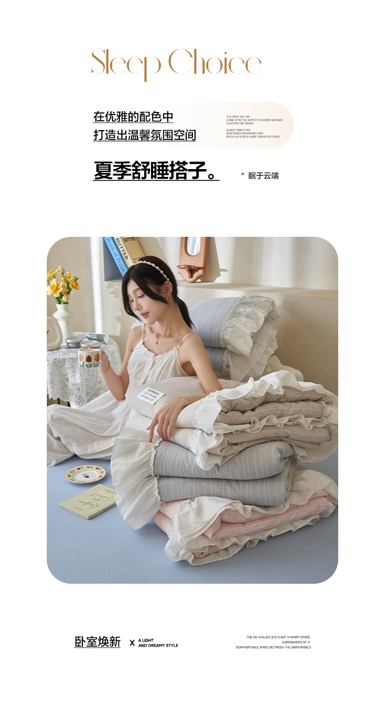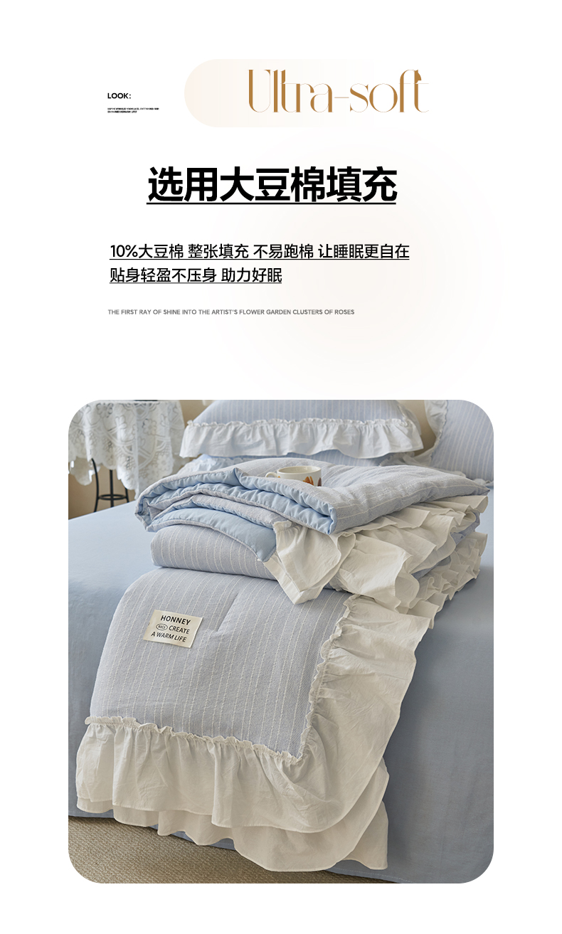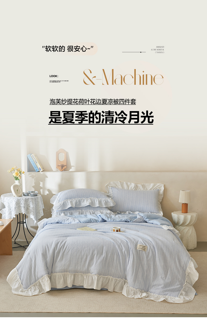 当前位置: 91家纺网 > 商品网购 > 床品套件 > 四件套 > 夏被四件套 > 晨曦家纺 2026新款荷叶花边泡芙纱提花夏凉被四件套可水洗棉夏被四件套少女风 海盐蓝