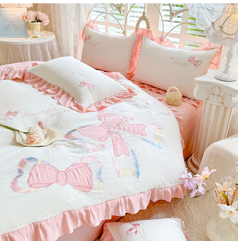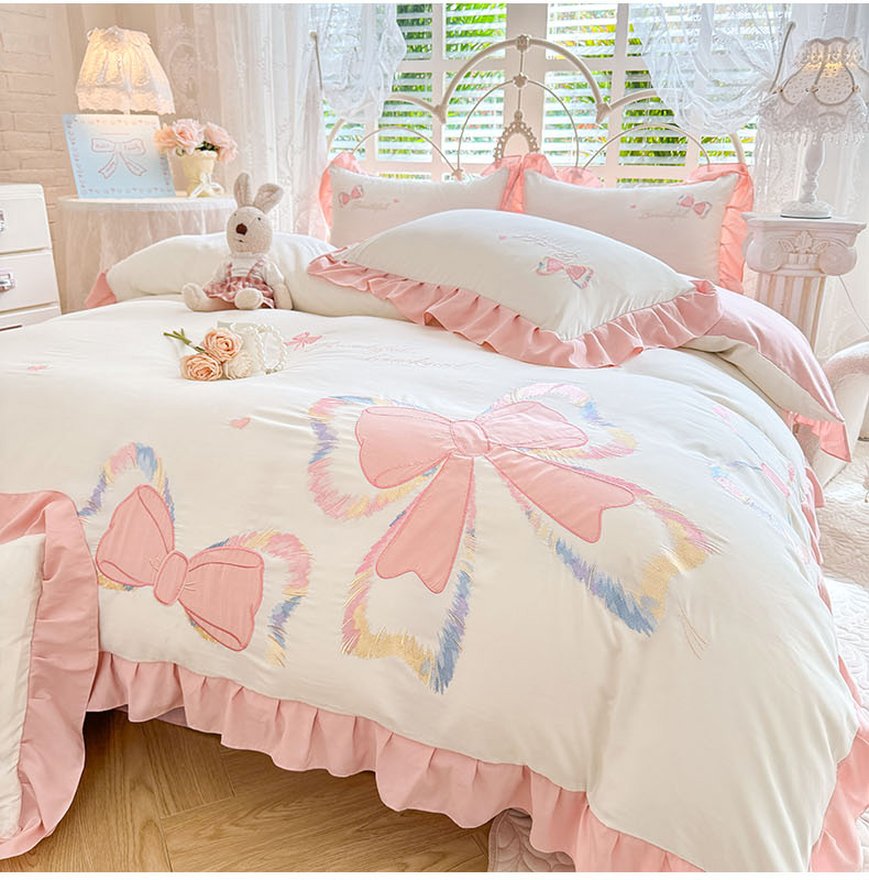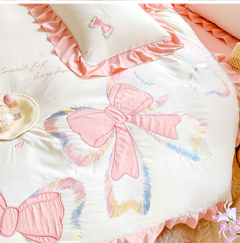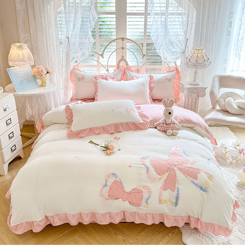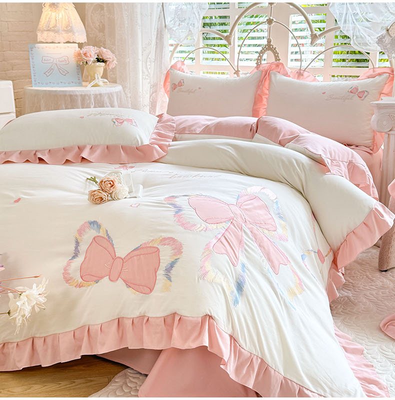 绒棉世家 2026新款水洗棉贴布绣专版四件套 邂逅蝴蝶结粉