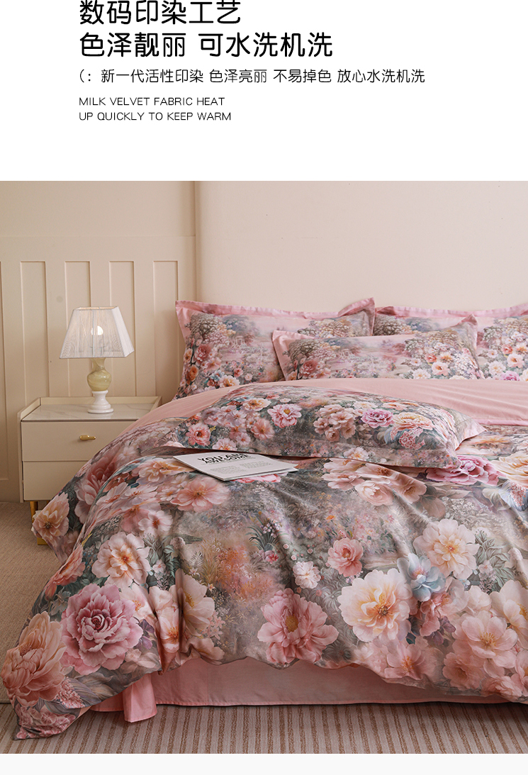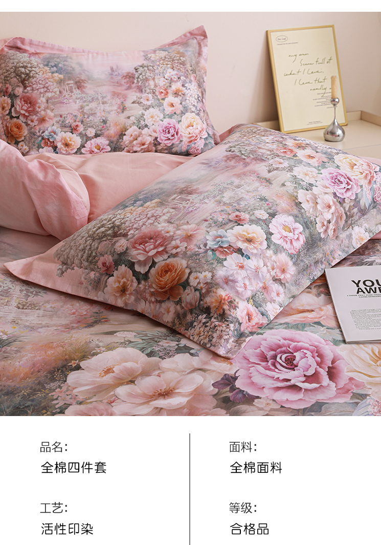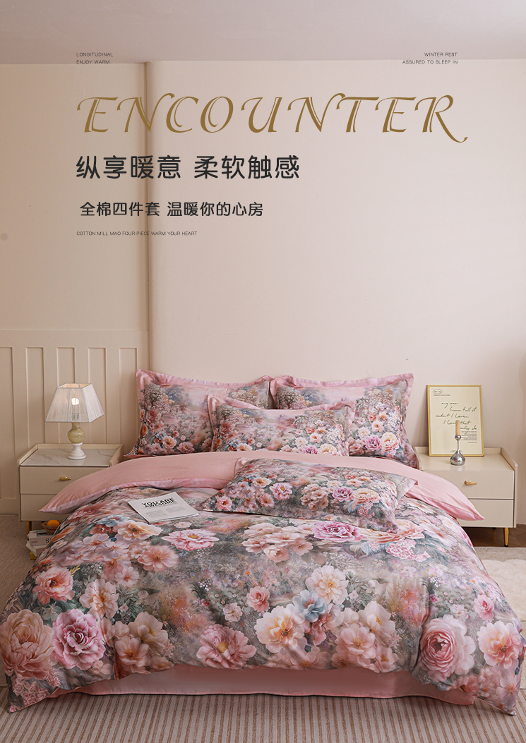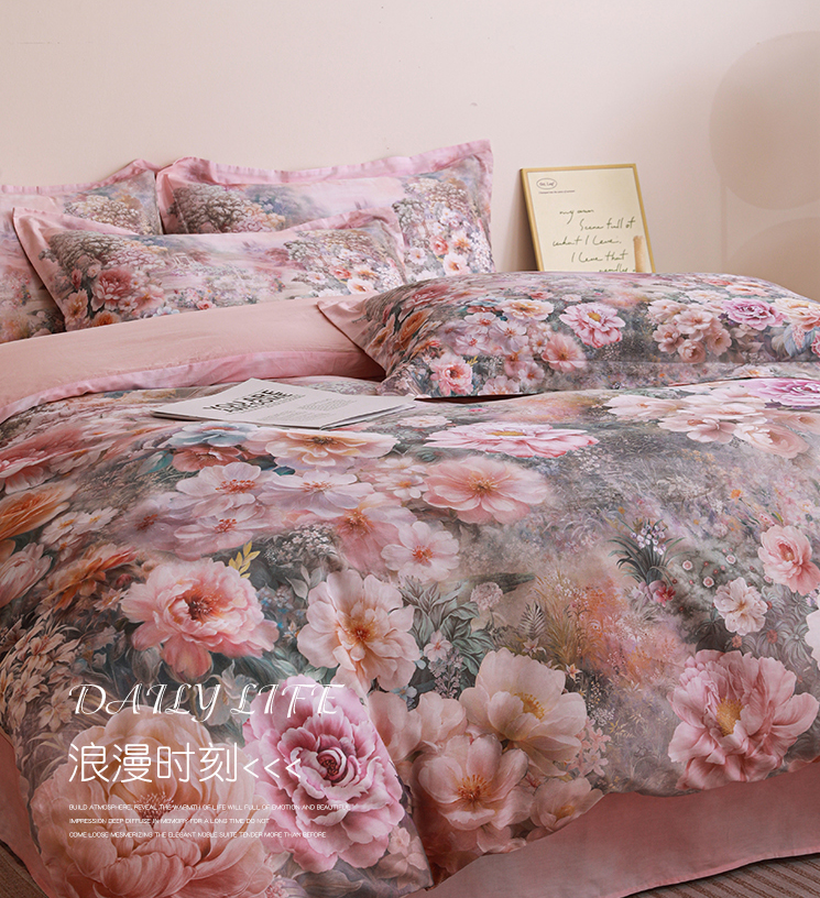 当前位置: 91家纺网 > 商品网购 > 床品套件 > 四件套 > 全棉普通四件套 > 朵希曼 2026新款全棉纯棉大版定位13376数码印花系列四件套 池花映日-粉
