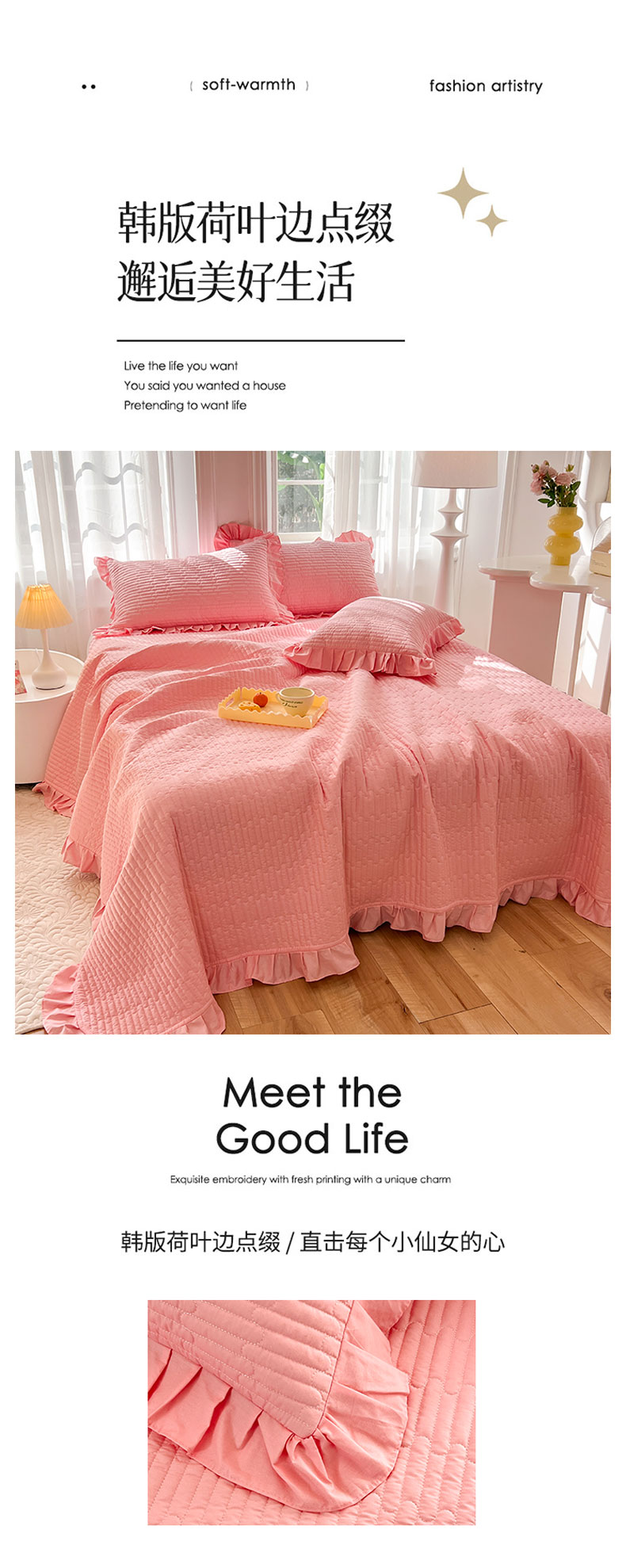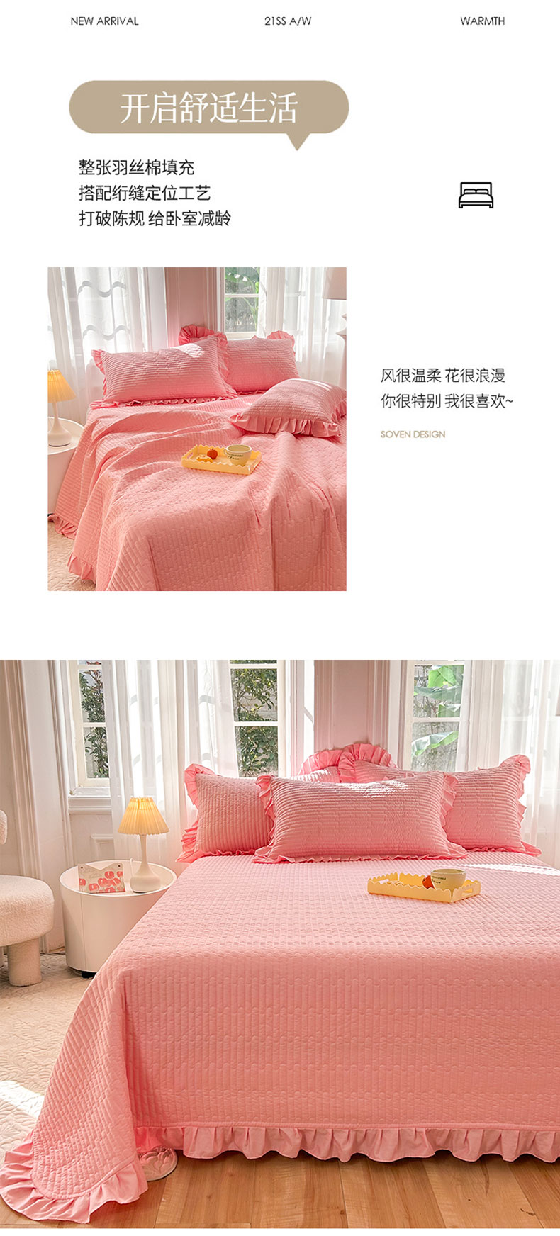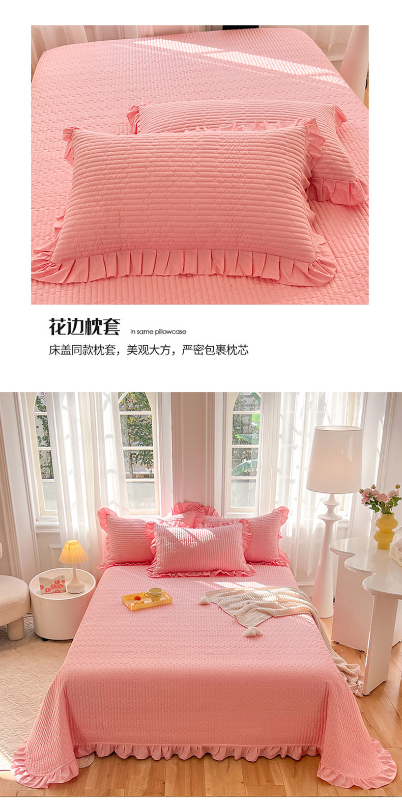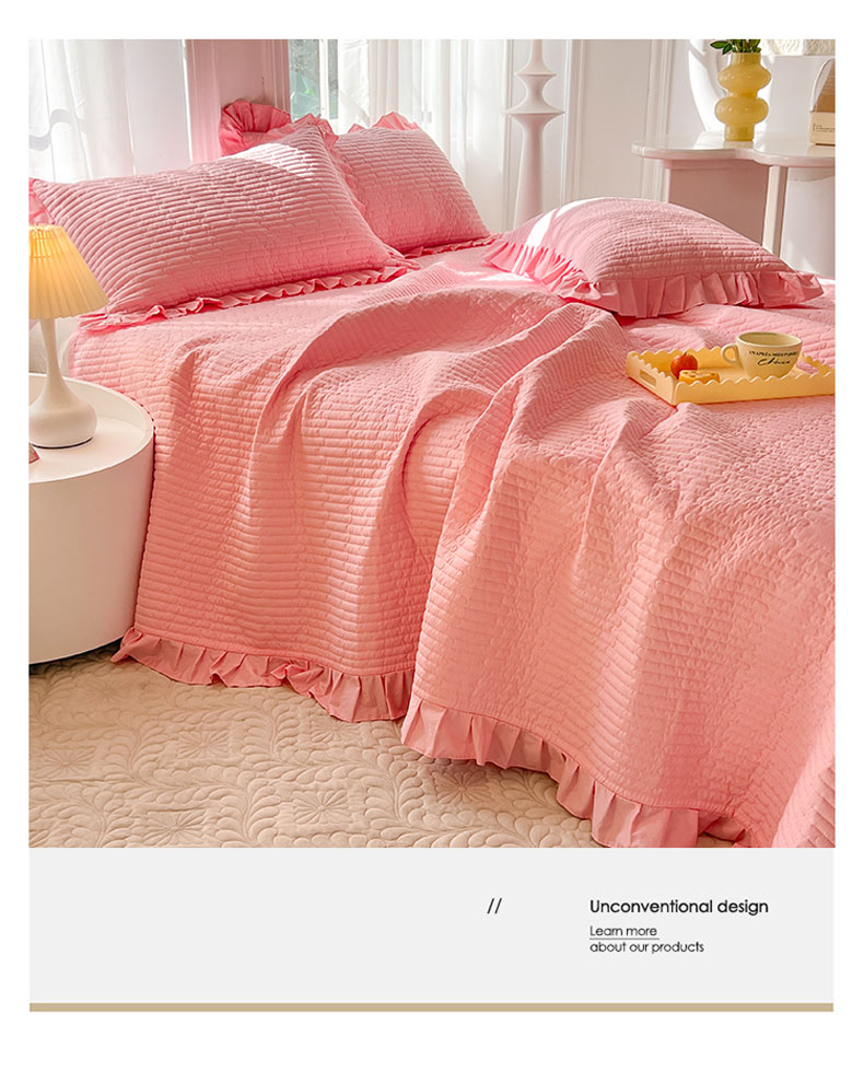 • 91家纺网 家纺一手货源 找家纺 花香四季家纺 2026新款13376全棉夹棉床盖三件套13372纯棉纯色床盖花边公主风(可定制任意尺寸) 荔枝粉